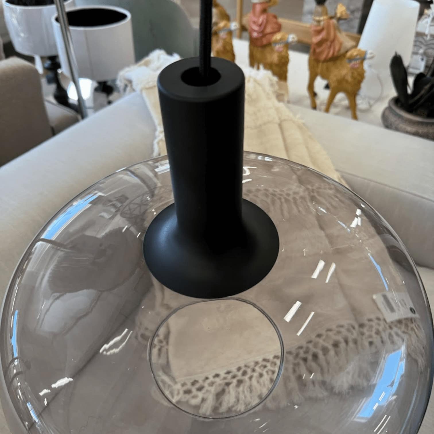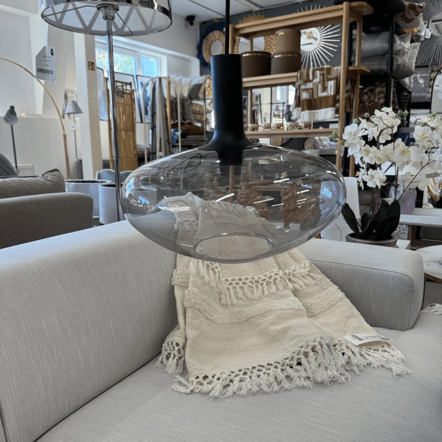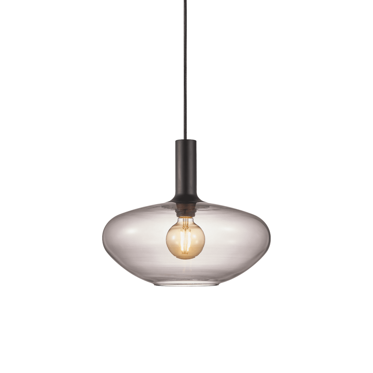Alton lampa ar savu dūmakaino stiklu rada skaistu saskaņu starp melno virsmu un izvērsto apaļo formu, kas padara šo sēriju elegantu. Šī kombinācija piešķir gaismai maigu un siltu noskaņu.