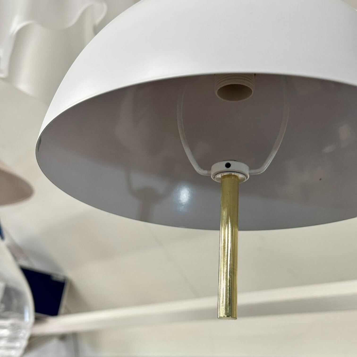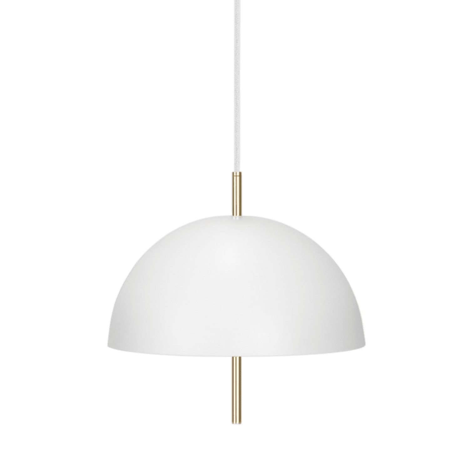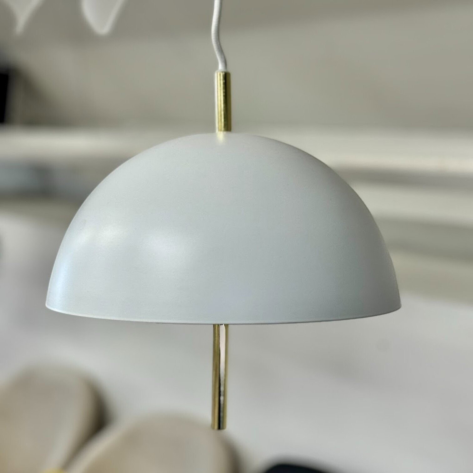 Lampa ir izgatavota no balta, lakota metāla kupola, ko papildina kontrastējoša misiņa detaļas, piešķirot dizainam mūsdienīgu greznību un stilu. Lampa izmanto E14 spuldzes turētāju (maks. 40W), nodrošinot piemērotu gaismas daudzumu mājīgai un siltai atmosfērai.