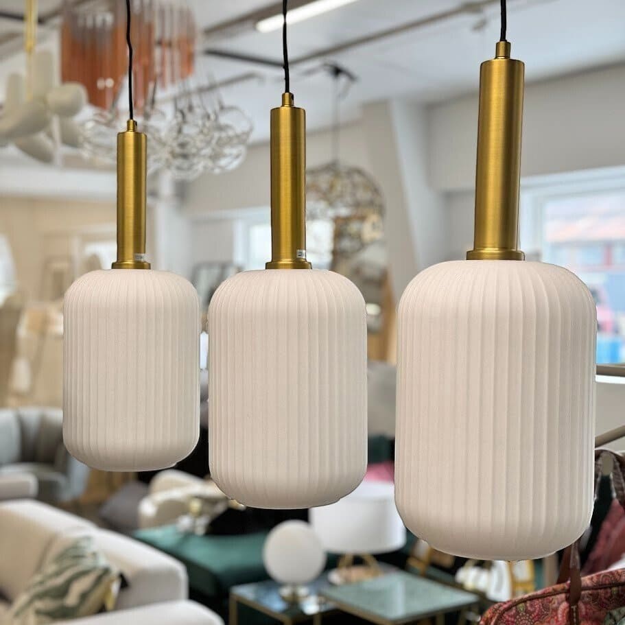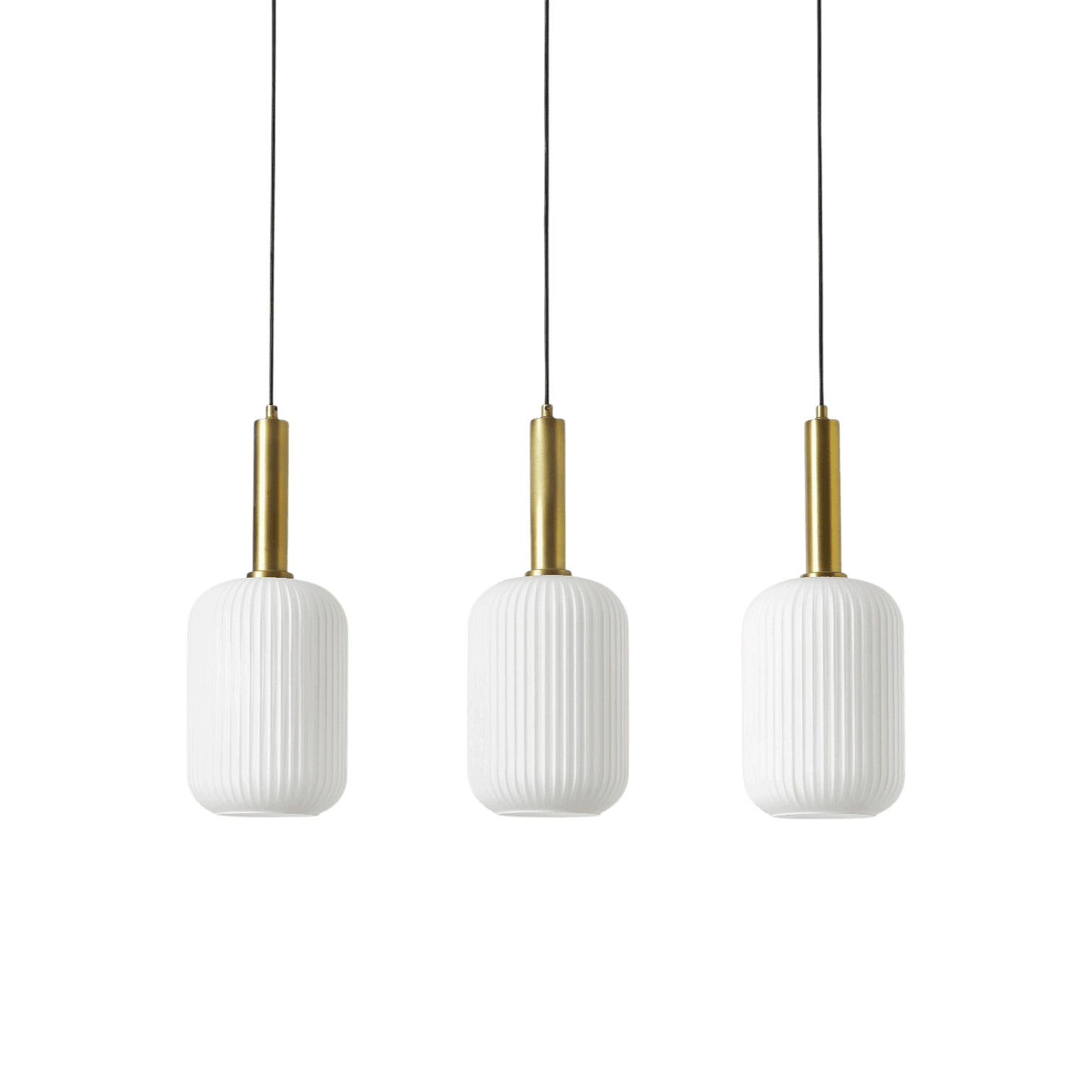 Griestu lampa Candela ir elegants un izsmalcināts apgaismes risinājums, kas apvieno modernu dizainu ar klasisku estētiku. Šī trīskāršā piekaramā lampa ar matēta balta stikla kupoliem un zeltaini matētu metāla stiprinājumu piešķir telpai greznuma un viegluma sajūtu.