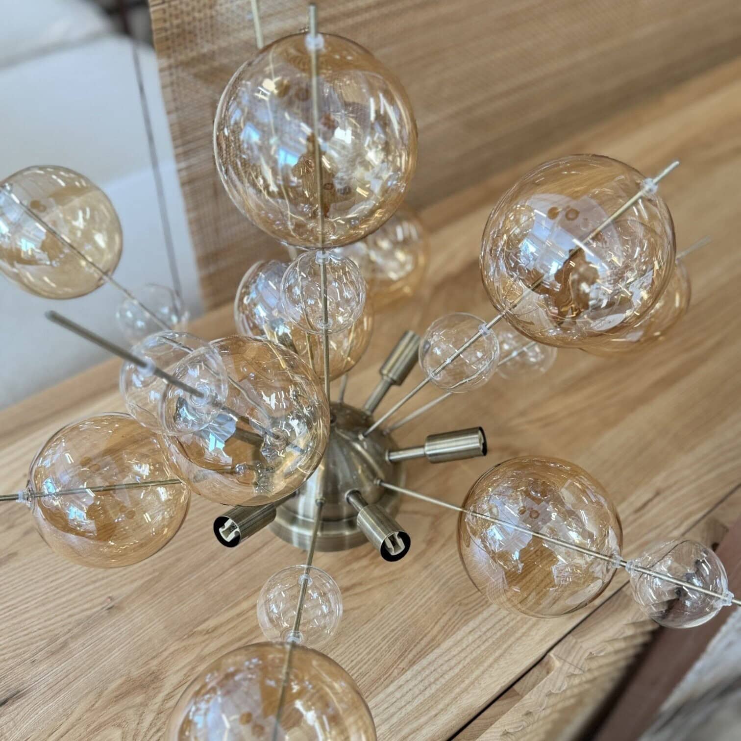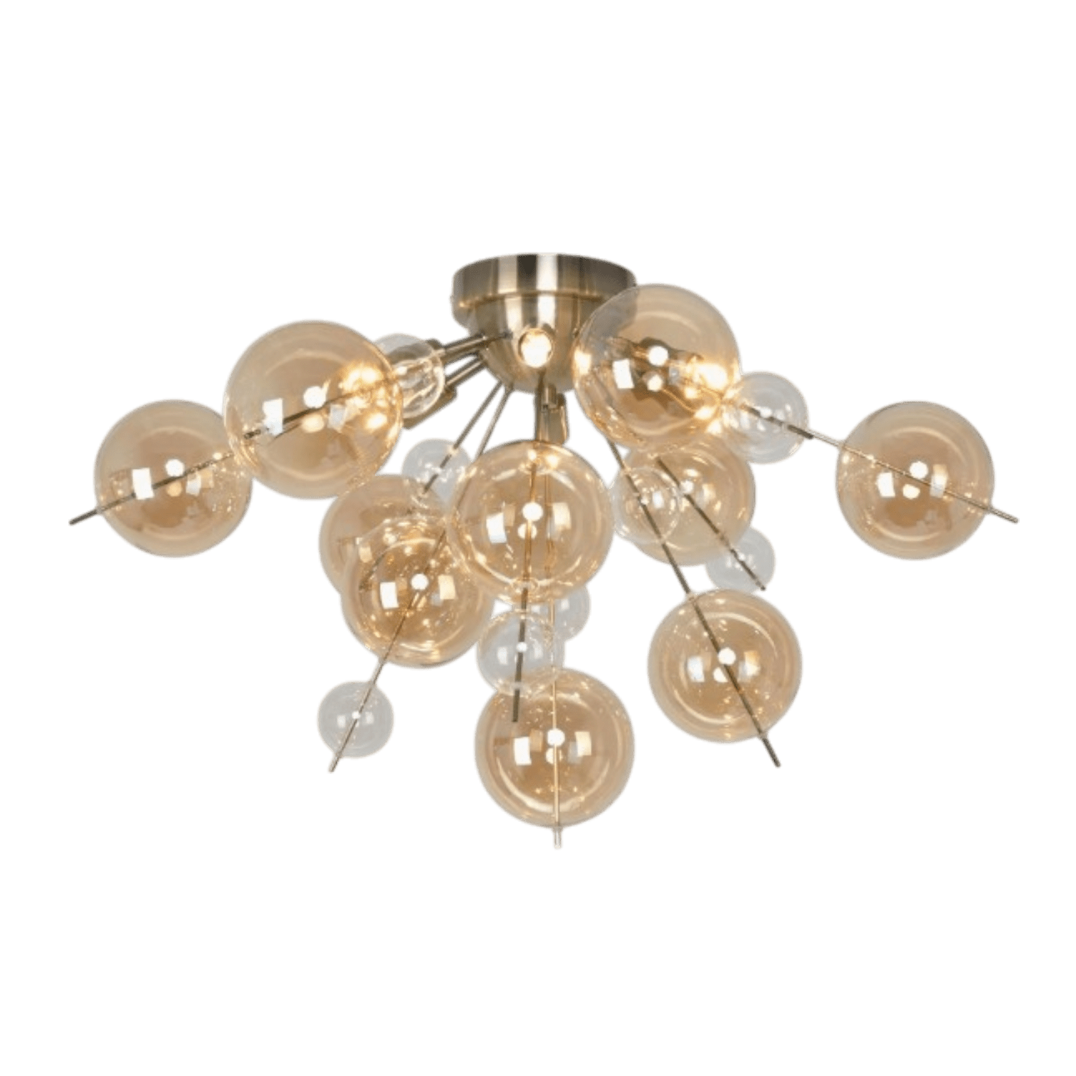 Explosion tās nosaukums lieliski ataino izskatu – sprādzienveida forma ar elegantiem stikla lodēm dažādos toņos piešķir lampai māksliniecisku un greznu raksturu. Lampas dizains apvieno zeltaini matētas metāla detaļas ar caurspīdīgām un dzintara tonī tonētām stikla lodēm, kas rada unikālu un mājīgu apgaismojumu. Ideāli piemērota viesistabai, ēdamistabai vai guļamistabai.