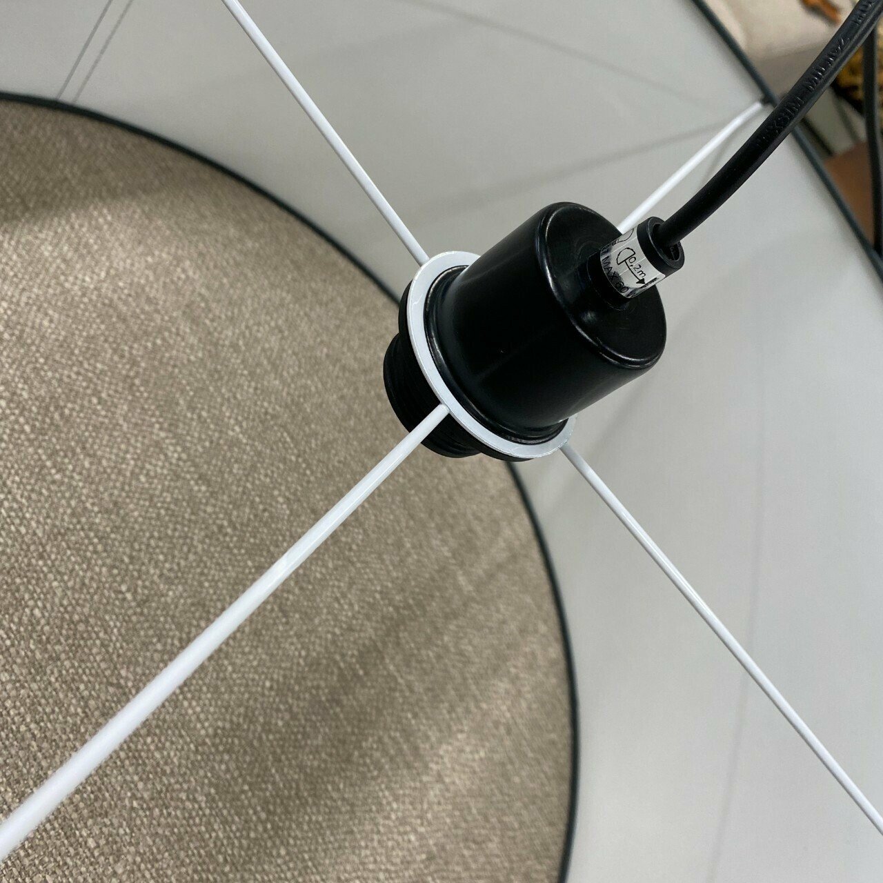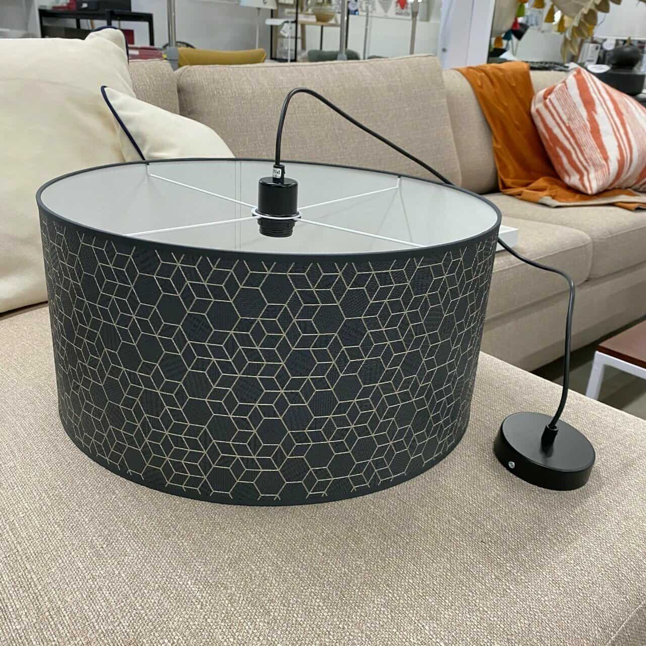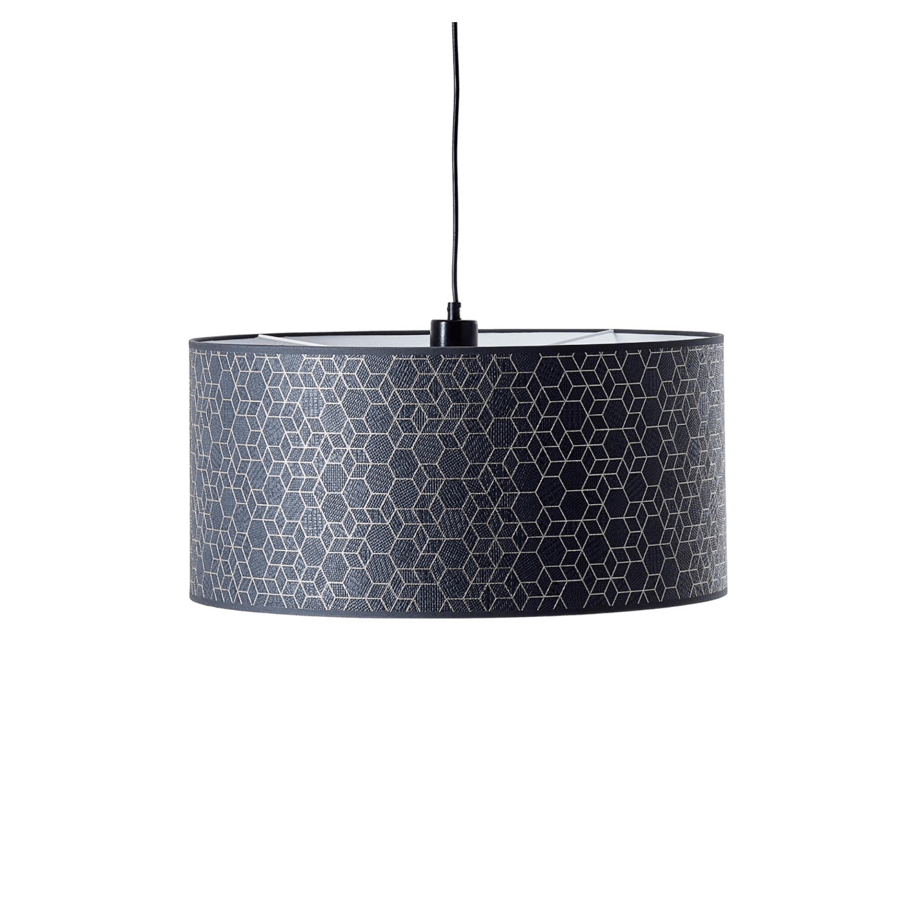 Tekstila materiāls lampas apdarē ir ar ģeometrisku, telpisku figūru apdruku. Sīks dīzains, bet piedod lampas skatam vēl papildu dziļumu.