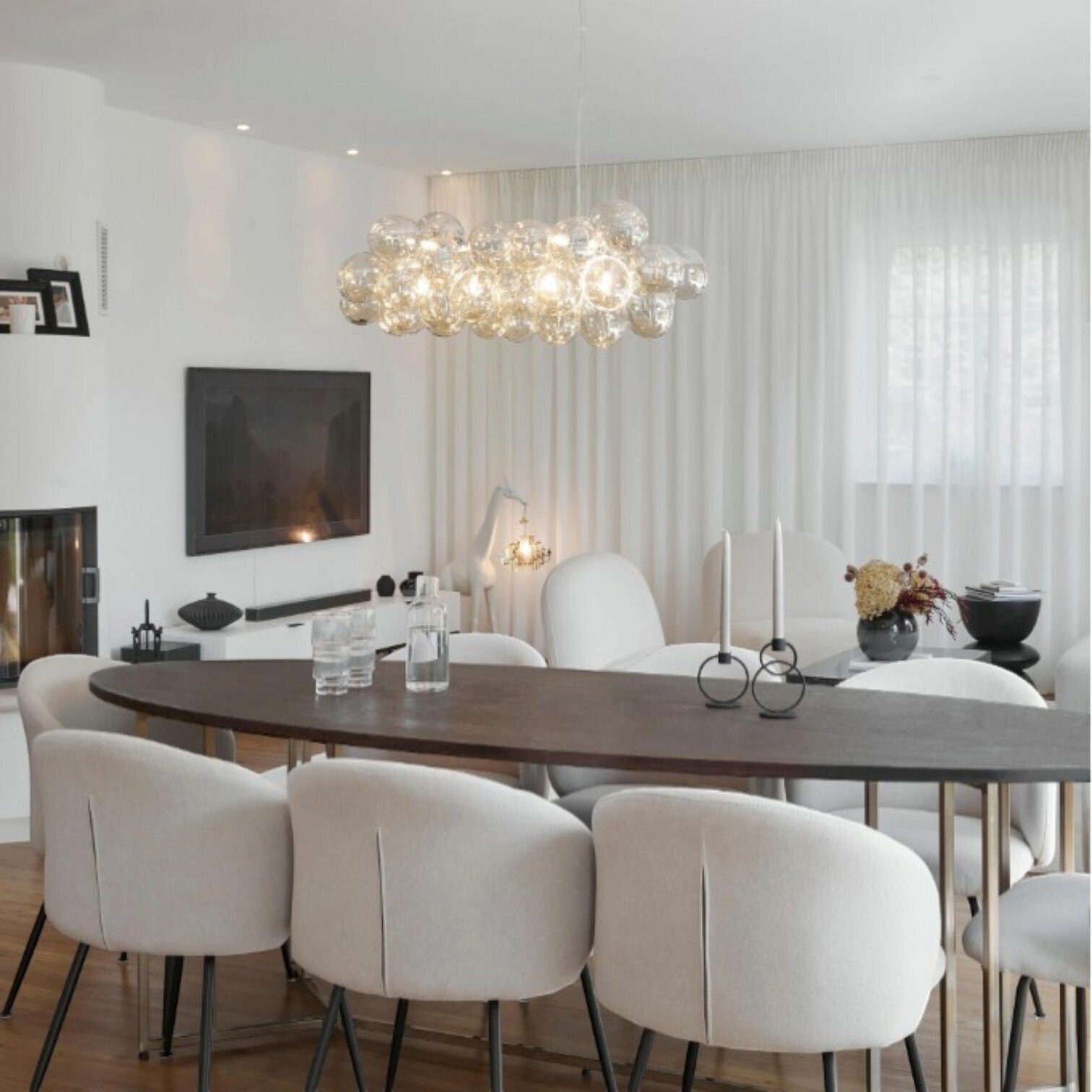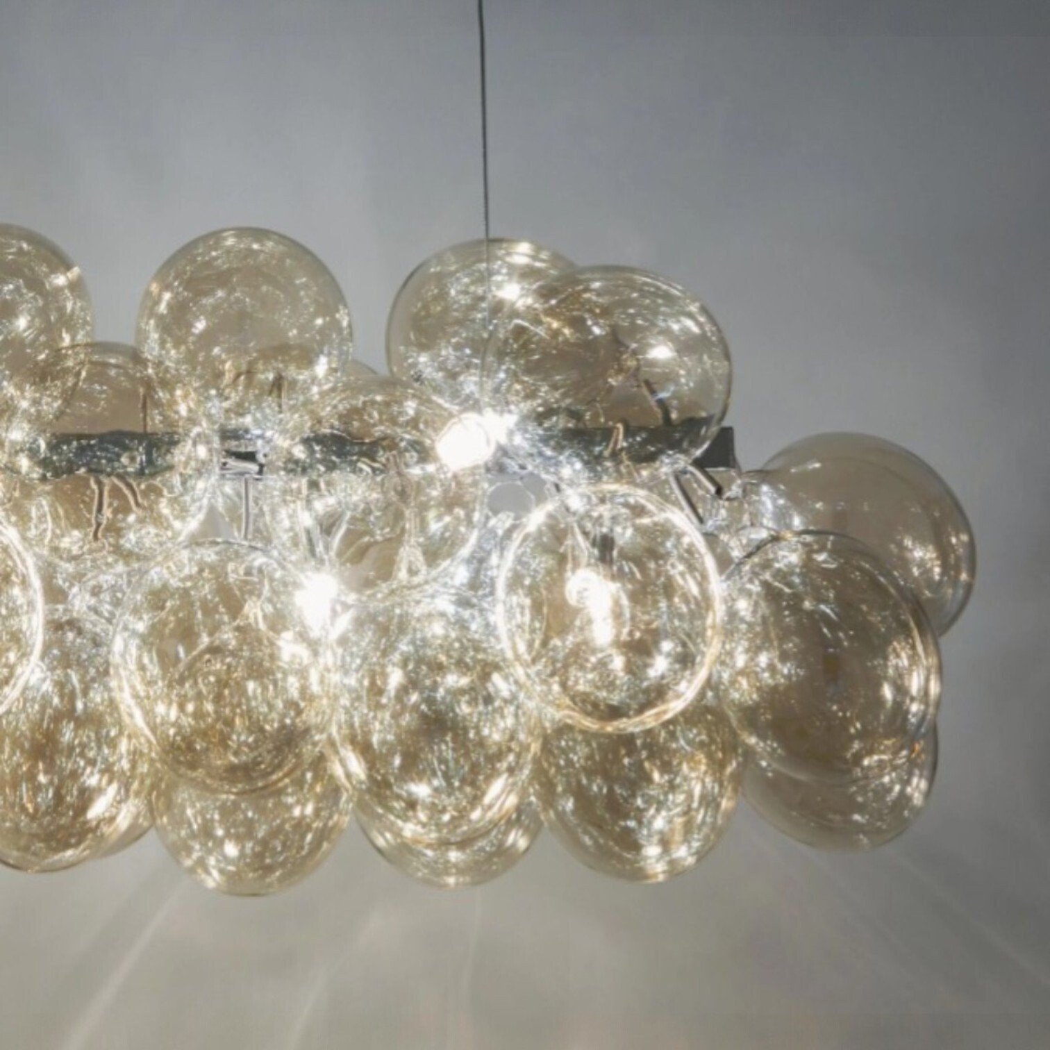 Eleganta piekaramā griestu lampa ar modernu un dekoratīvu dizainu. Lampu veido vairākas stikla lodītes, kas izkārtotas klastera veidā un rada gaisīgu, izsmalcinātu izskatu. Stikla kupoli ir izgatavoti no pūsta stikla, kas nodrošina unikālu formu un maigi izkliedētu gaismu telpā.