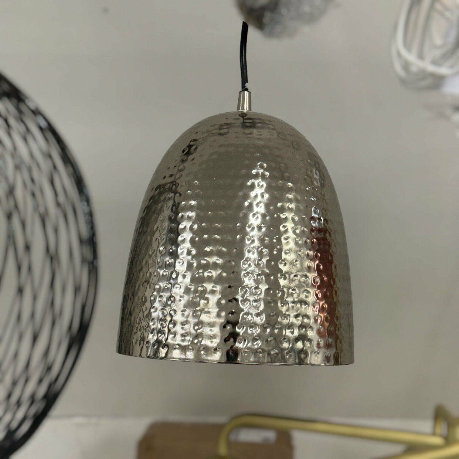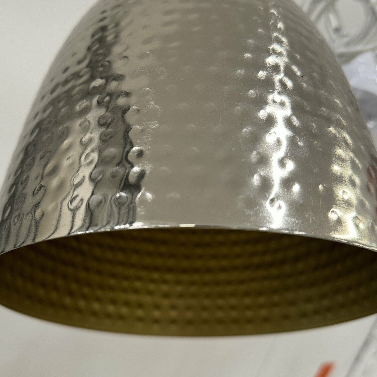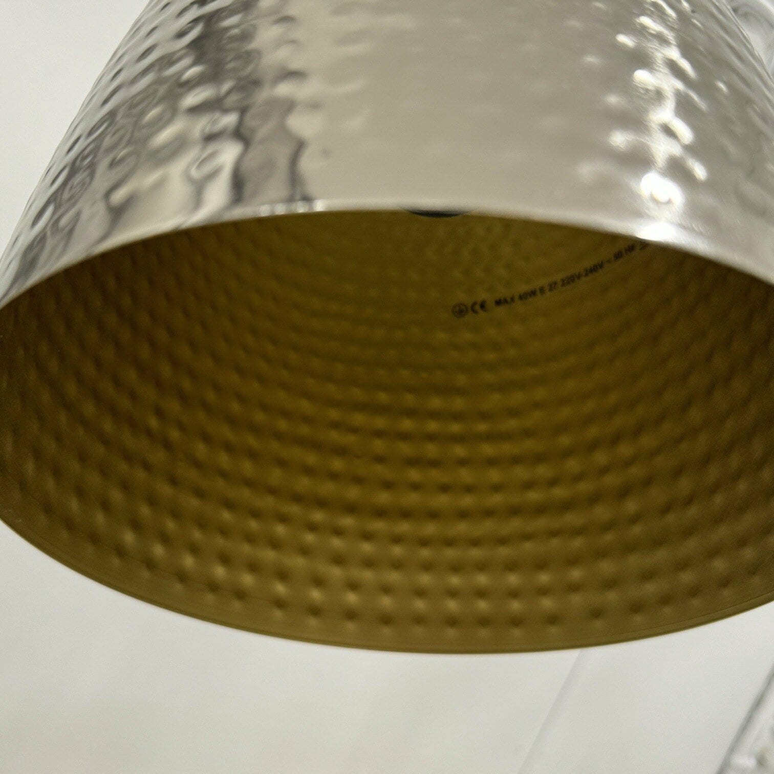 Industriāla stila griestu lampa sudrabā un zeltā. Presēta metāla apstrāde piešķir unikalitāti un neierastu kopskatu. Iederēsies gan virs ēdamgalda, gan gaitenī.