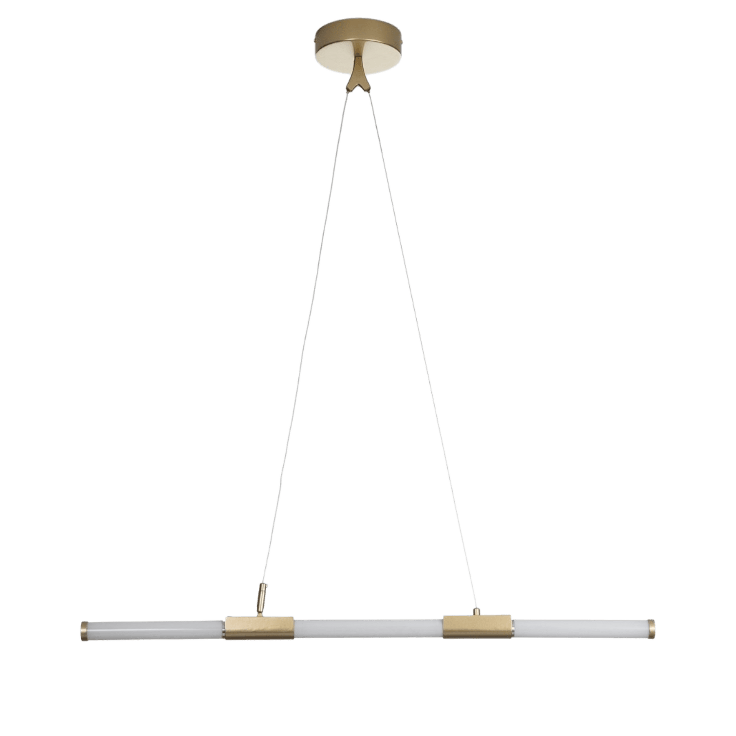 Lampa ir veidota no stikla un matēti zelta krāsas tērauda, piešķirot interjeram moderno greznību un vieglu industriālu piesitienu. Regulējamais elektriskais vads (90 cm) ļauj pielāgot lampas augstumu atbilstoši telpas un vajadzību prasībām – ideāli virs ēdamgalda, virtuves salas vai modernā biroja telpā.