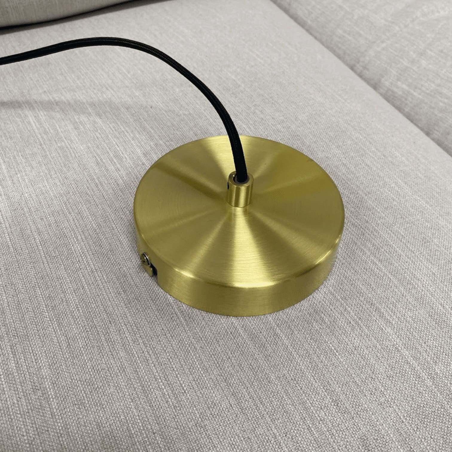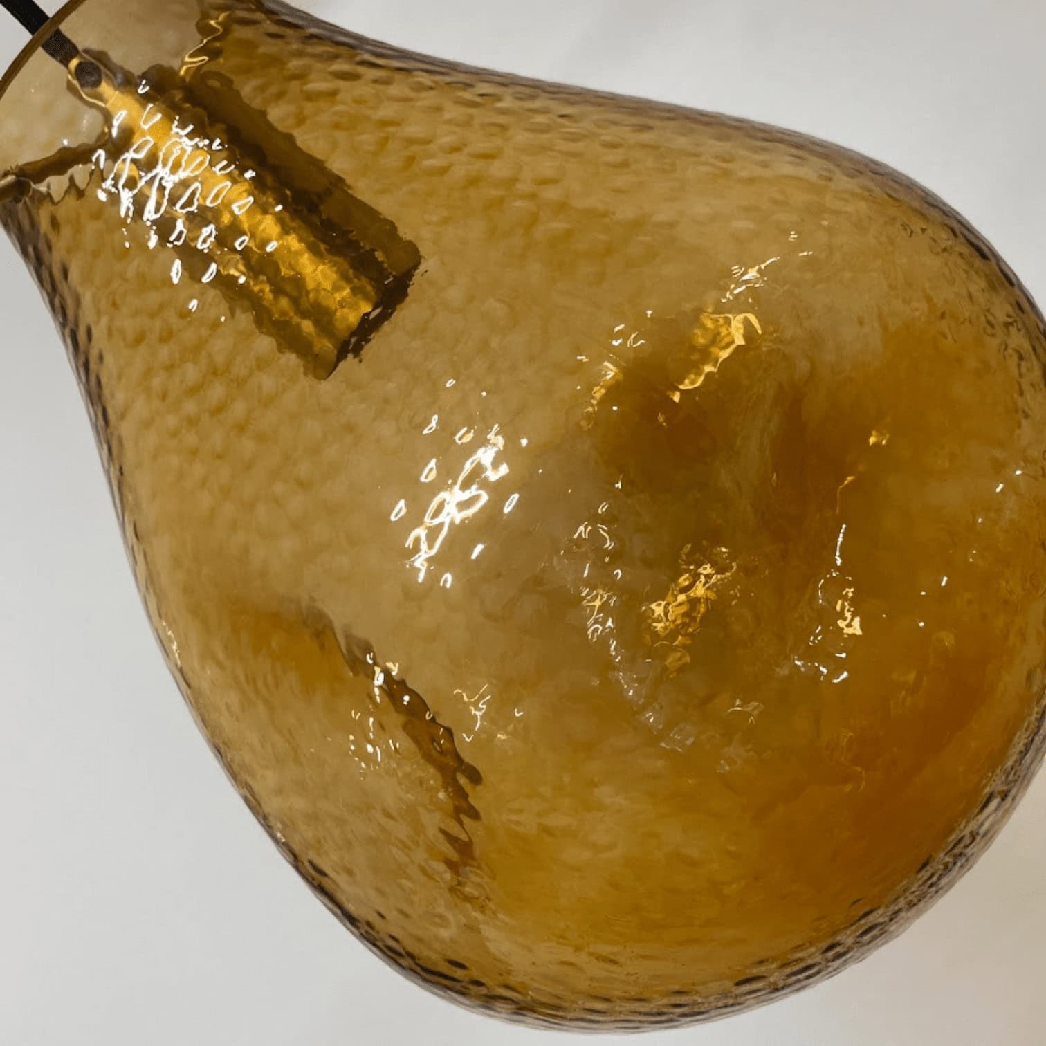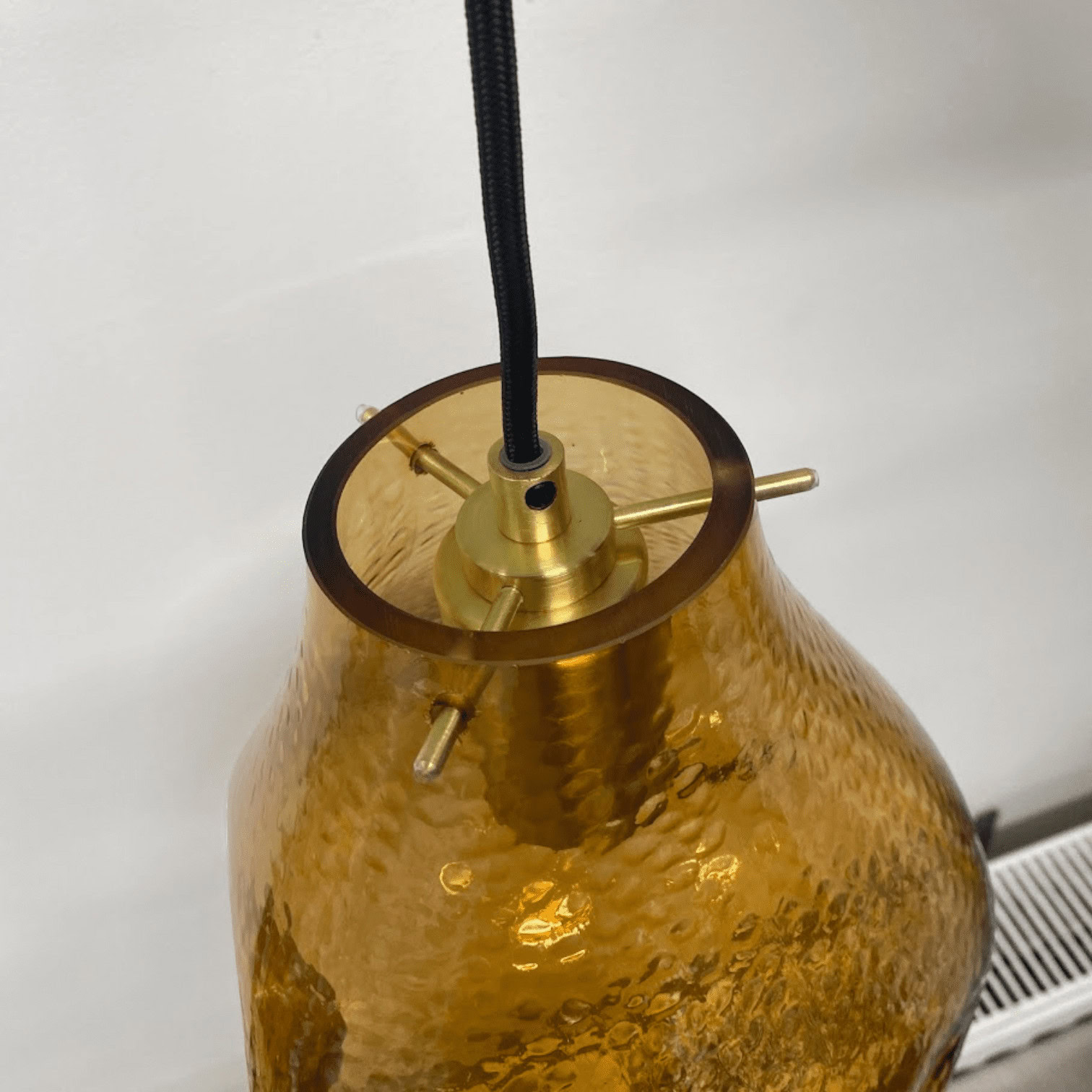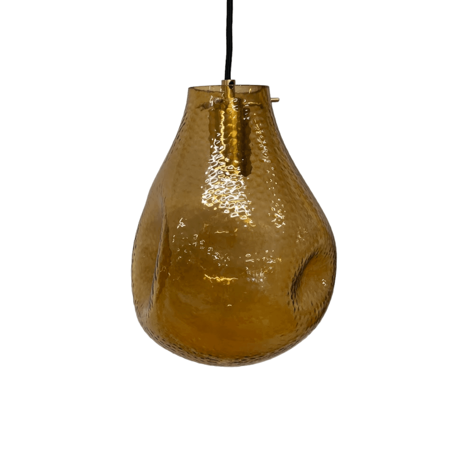 Stikla un metāla griestu lampa. Stikla kupols ir asimetriskā formā, ar punktainu faktūru, izskatās pēc lietus lāses, vai balona, kas pildīts ar ūdeni. Viegla un levitējoša sajūta.