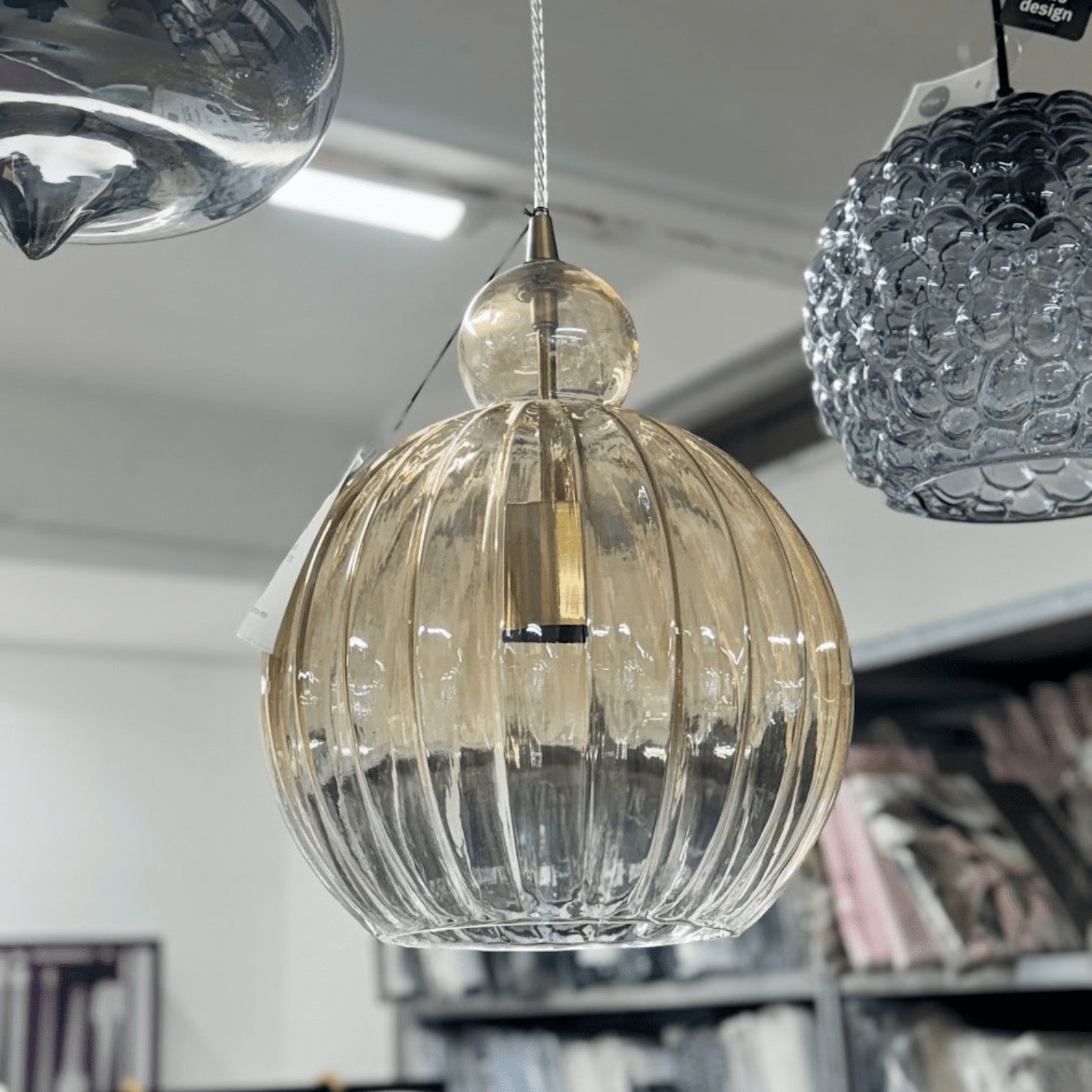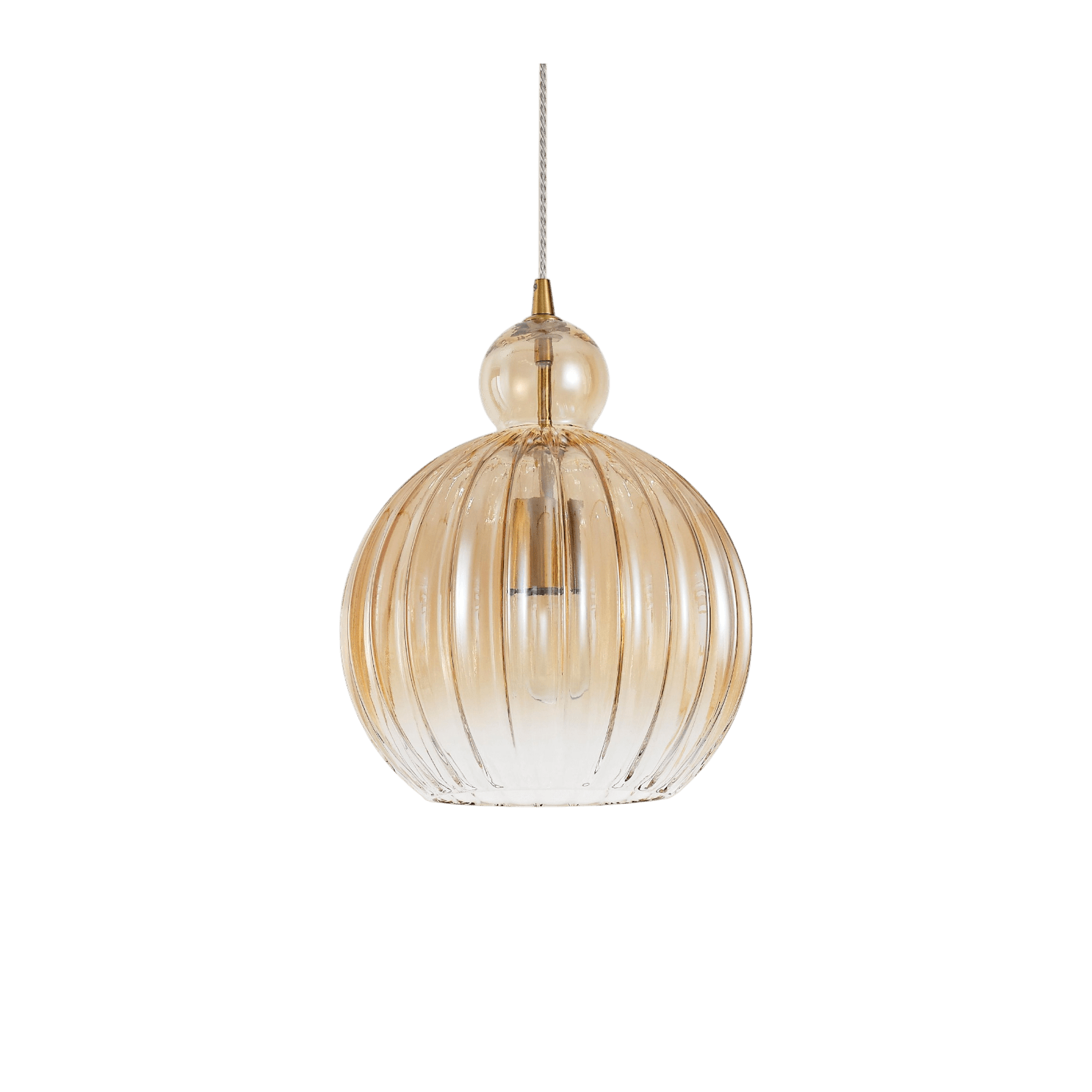 Pievienojiet savam mājoklim siltumu un eleganci ar šo stilīgo griestu lampu. Tās rievotais stikla abažūrs ar maigu zeltainu nokrāsu izstaro maigu un patīkamu gaismu, radot mājīgu atmosfēru. Ideāli piemērota viesistabai, ēdamzonai vai guļamistabai, piešķirot telpai greznuma pieskārienu.