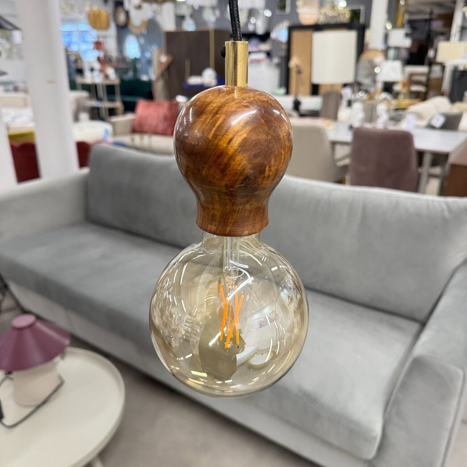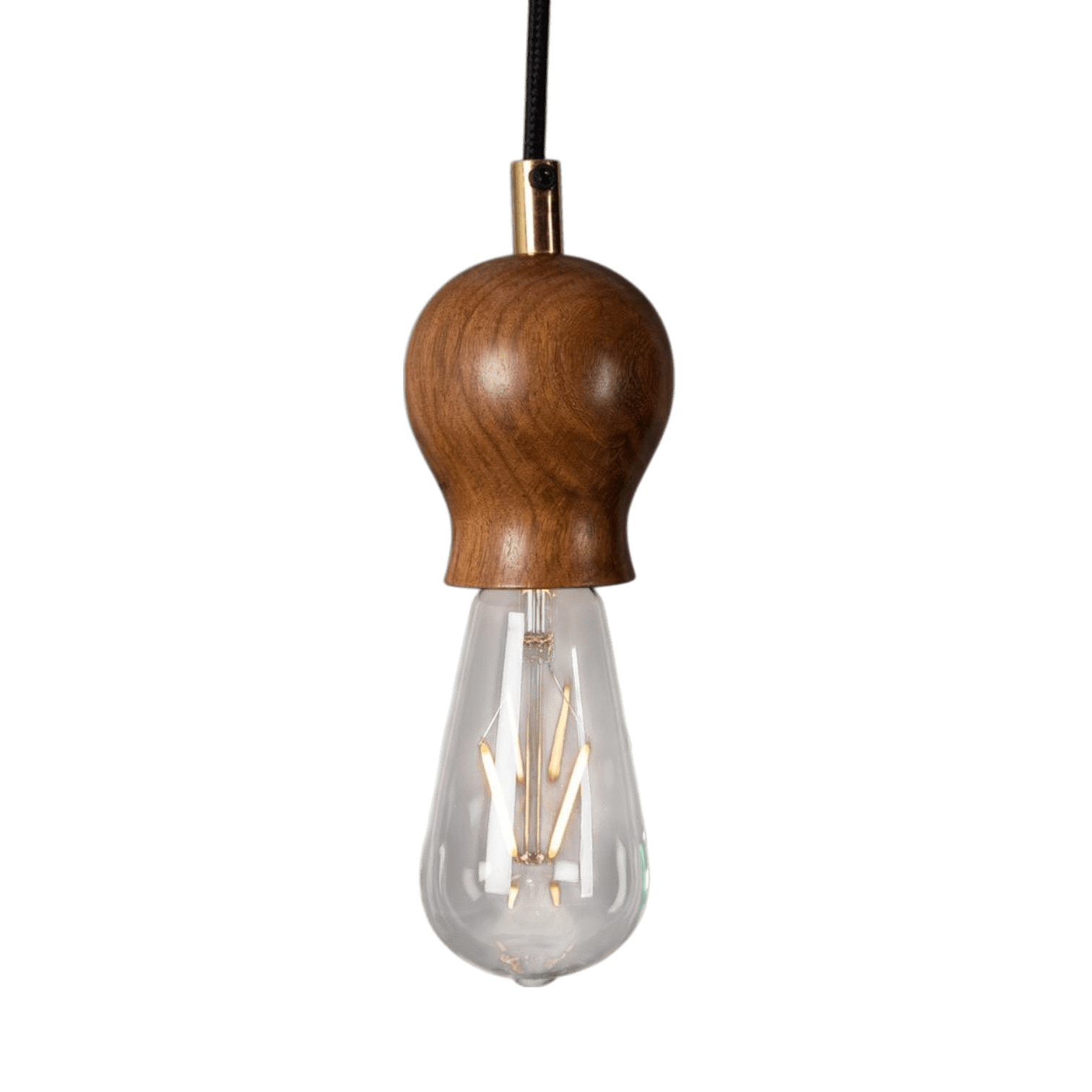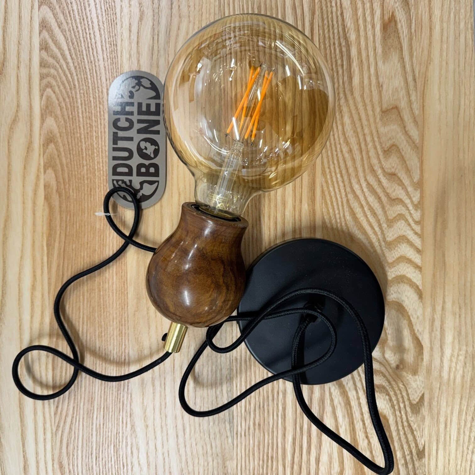 Griestu lampa Solo no zīmola Dutch Bone, kurai raksturīgs silts un elegants dizains ar izteiksmīgu koka turētāju. Lampas dizainā apvienots dabisks valrieksta koka tonis ar misiņa akcentu augšpusē un melnu auduma vadu, kas piešķir tai retro un industriālu noskaņu vienlaikus.