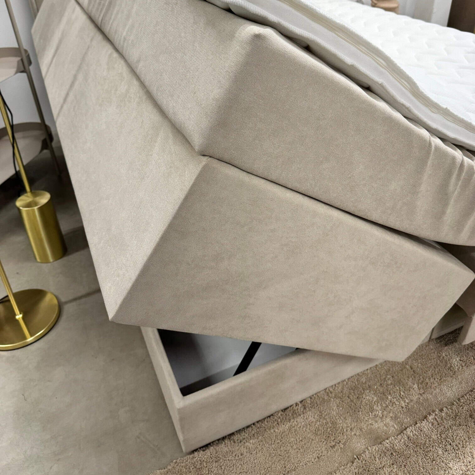 Ietilpīga glabāšanas kaste – paceļams matracis ar mehānismu ļauj ērti uzglabāt gultas veļu, segas vai sezonālos priekšmetus.