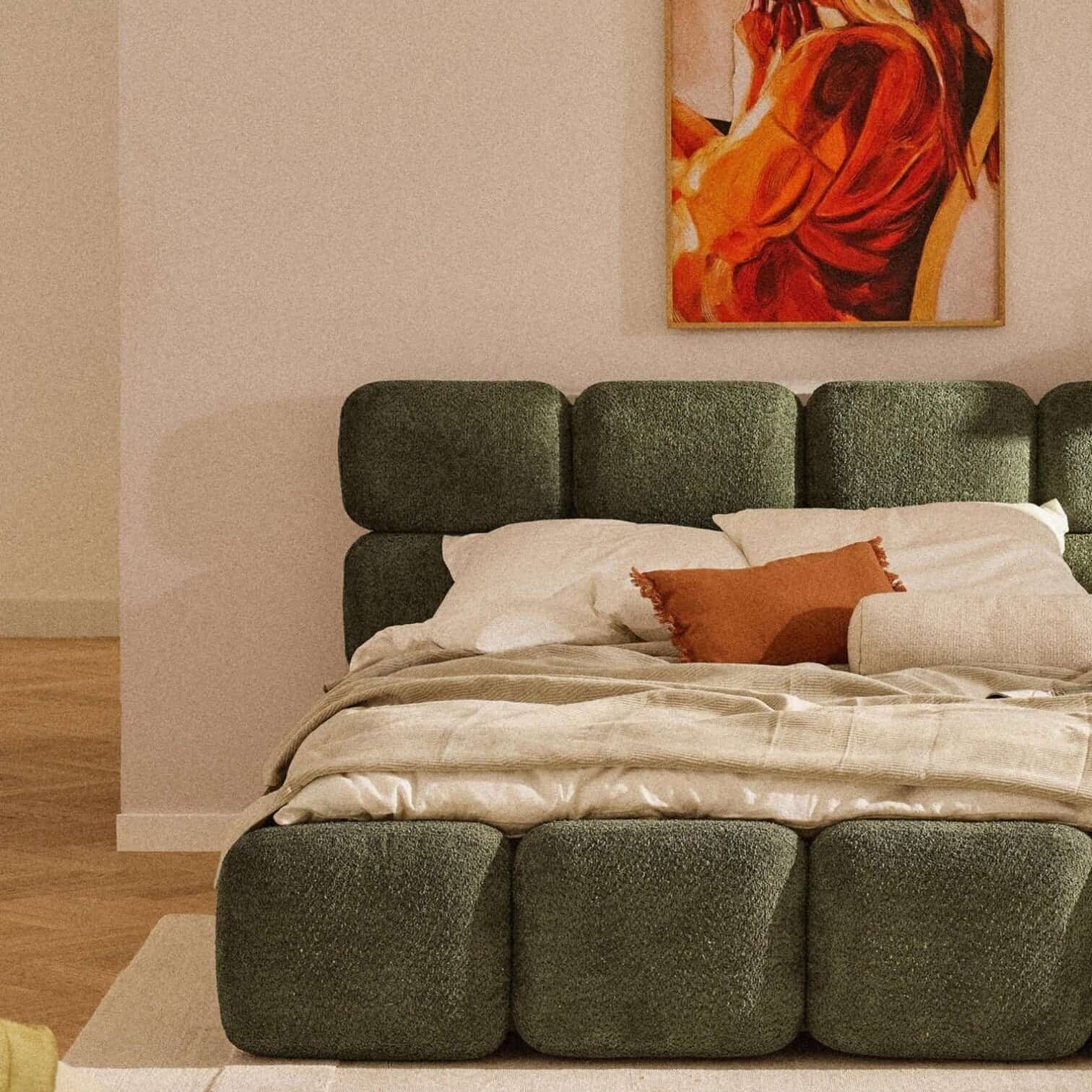 Iepazīstinām ar TAYLA – gultu, kuras unikālais dizains ar noapaļotiem, polsterētiem elementiem galvgalī piešķir telpai mūsdienīgu un vienlaikus mājīgu noskaņu. Tumši zaļais Teddy bouclé audums ir ne tikai vizuāli pievilcīgs, bet arī īpaši izturīgs – testēts līdz pat 100 000 Martindale cikliem, kas garantē ilgmūžību ikdienas lietošanā.