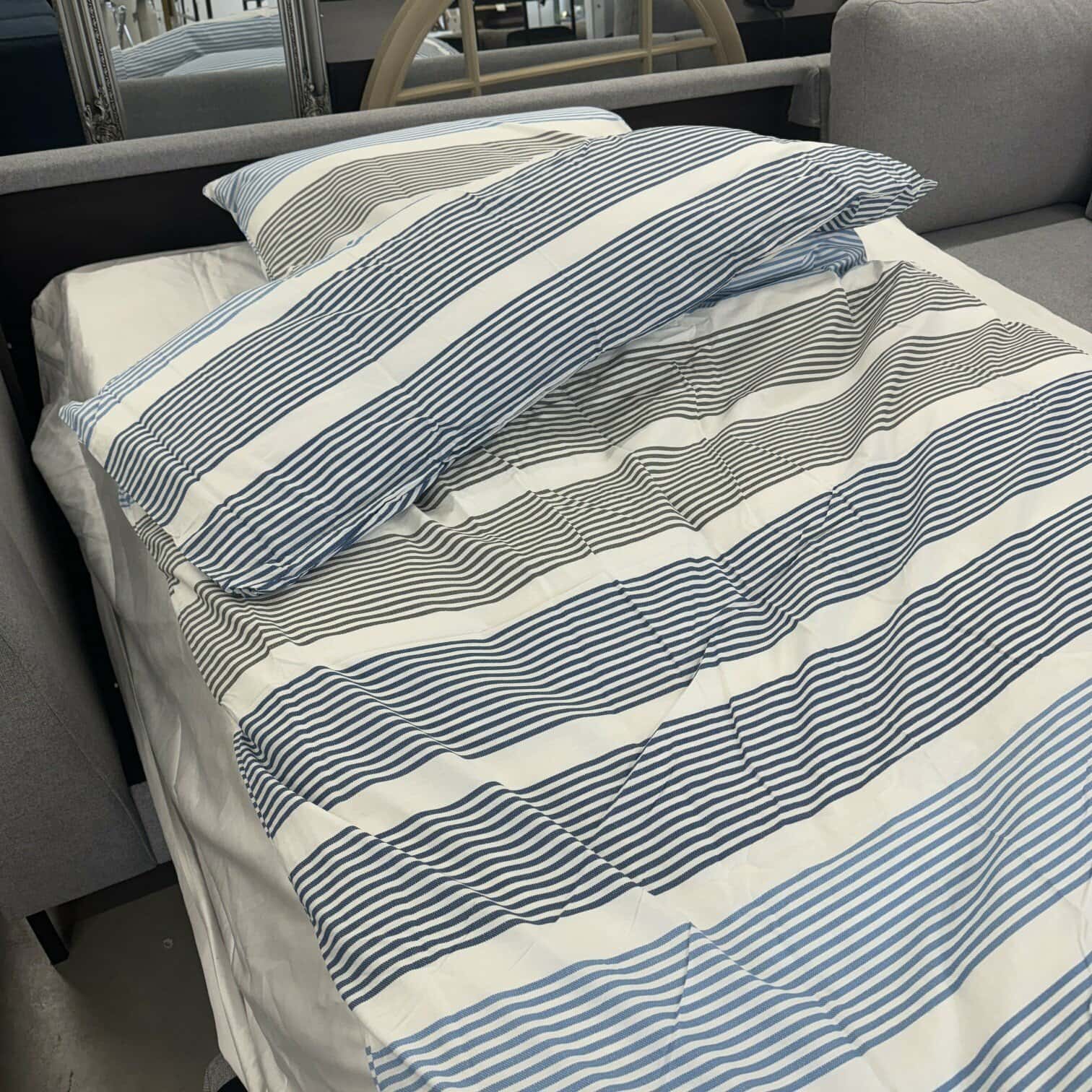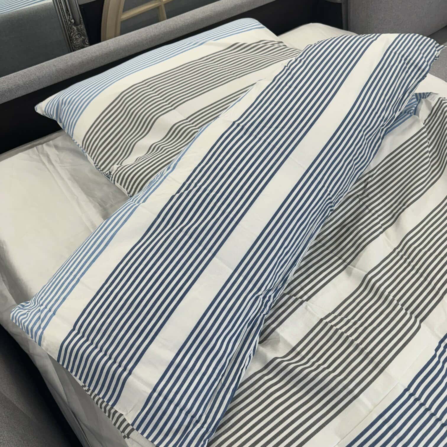 Svītrainā gultas veļa atsaidzinās jebkuru interjeru un guļamistabu. Lieliski piemērota gan pāriem, gan bērniem.