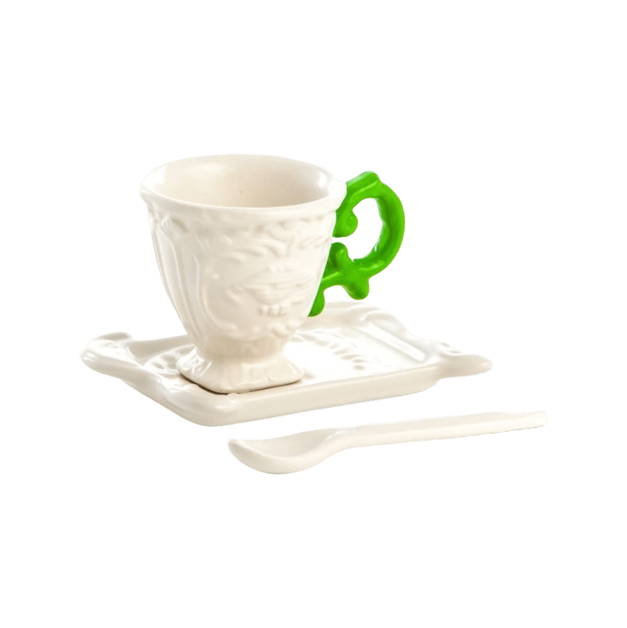 Smalks, necaurspīdīgs porcelāns ar matēti baltu apdari un fluorescējošas krāsas rokturiem.