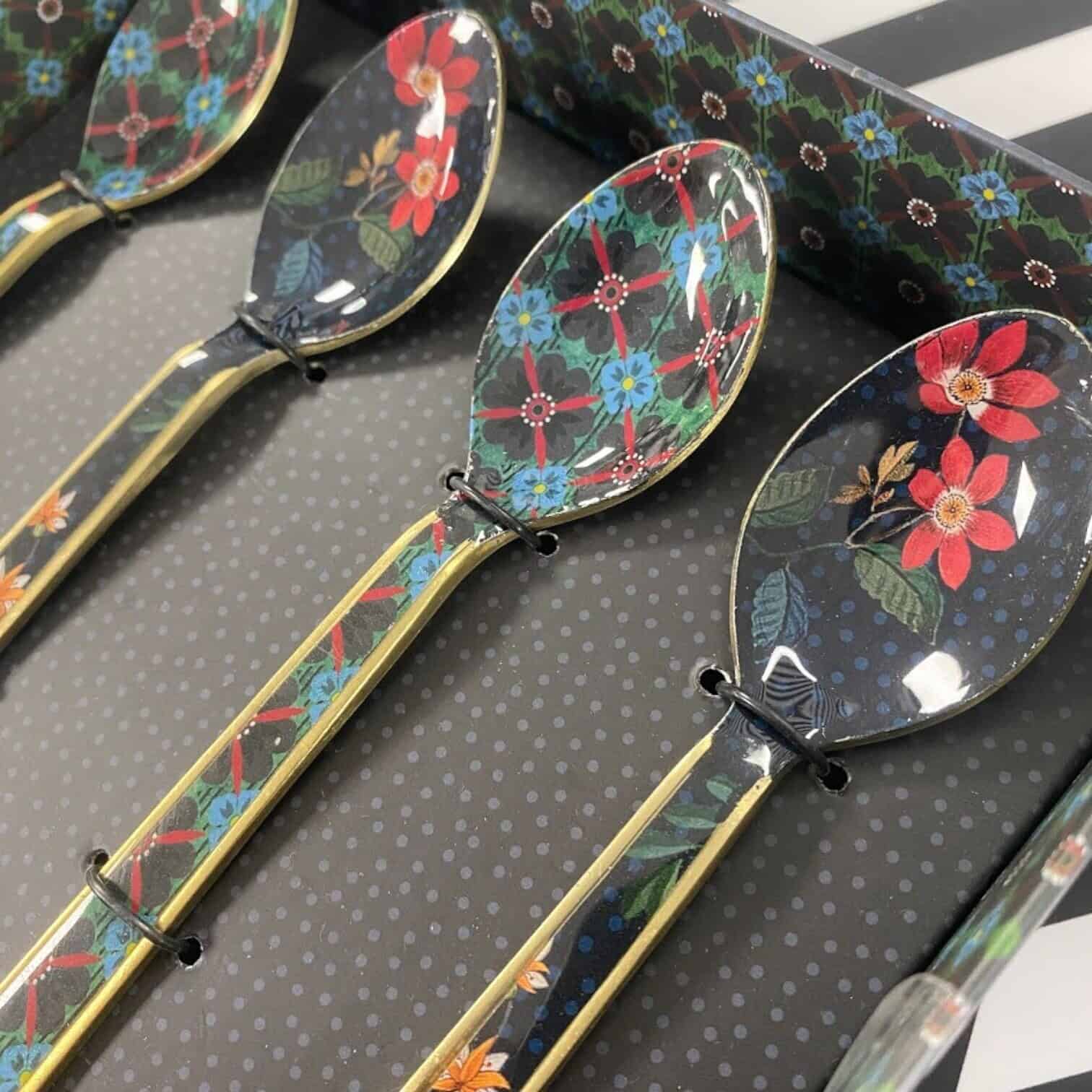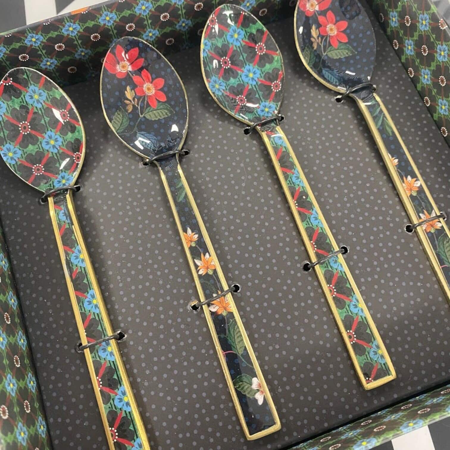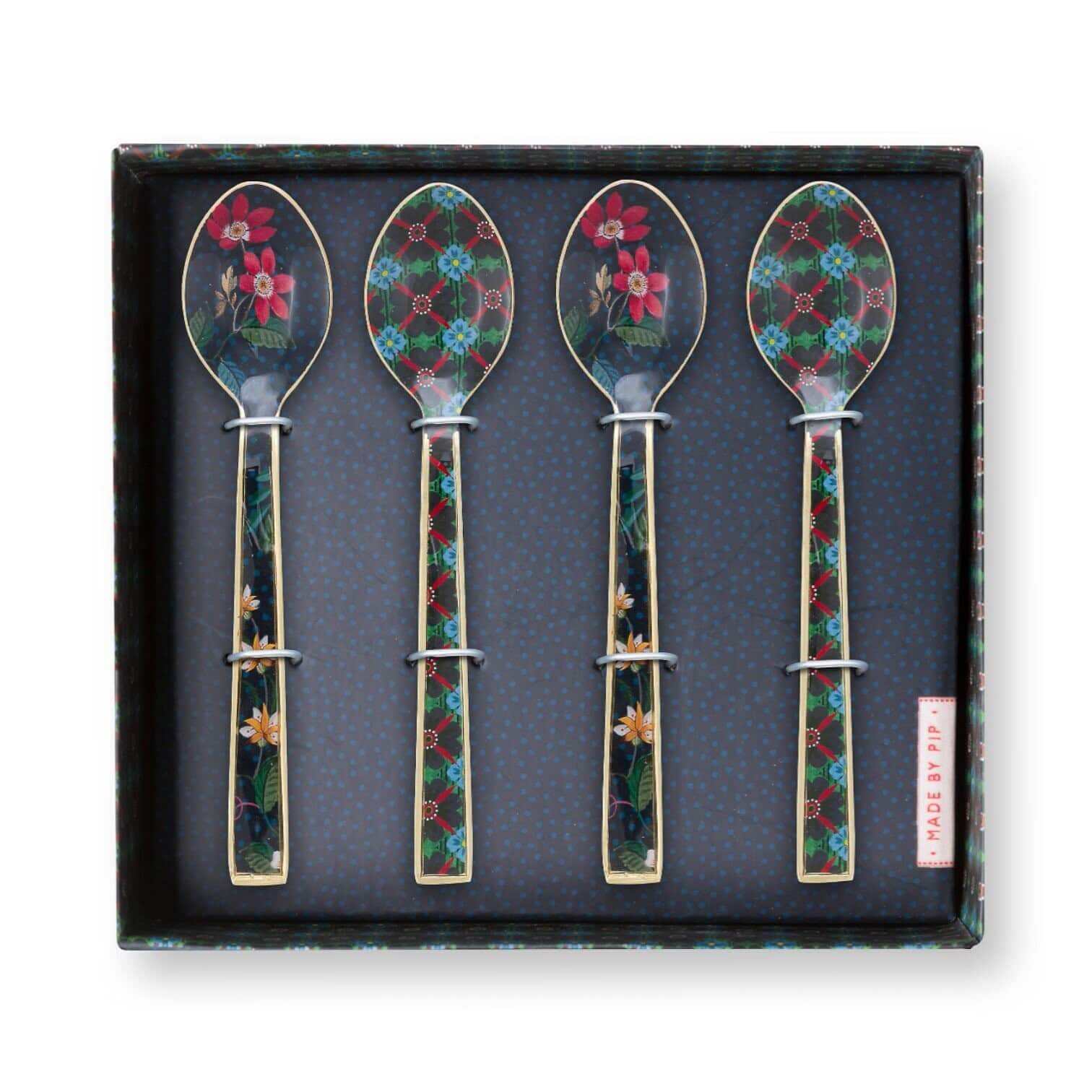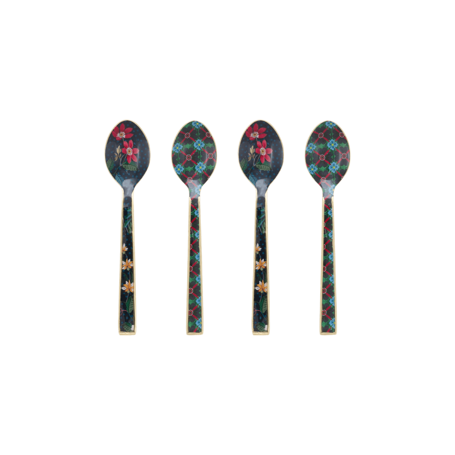 Šis Berry Blues kolekcijas karotīšu komplekts ir ideāli piemērots lietošanai kā tējkarote vai deserta karote. Karotes ir dekorētas ar tumši zilu ziedu dizainu, uz kuriem aug eleganti fantāzijas ziedi un ogas. Ziedu dizains ir apvienots ar dziļi zaļu flīžu rakstu ar sarkaniem akcentiem, kas atgādina labi zināmos ziemas čekus. Karošu komplekts ir emaljēts un apdarināts ar zelta maliņu.