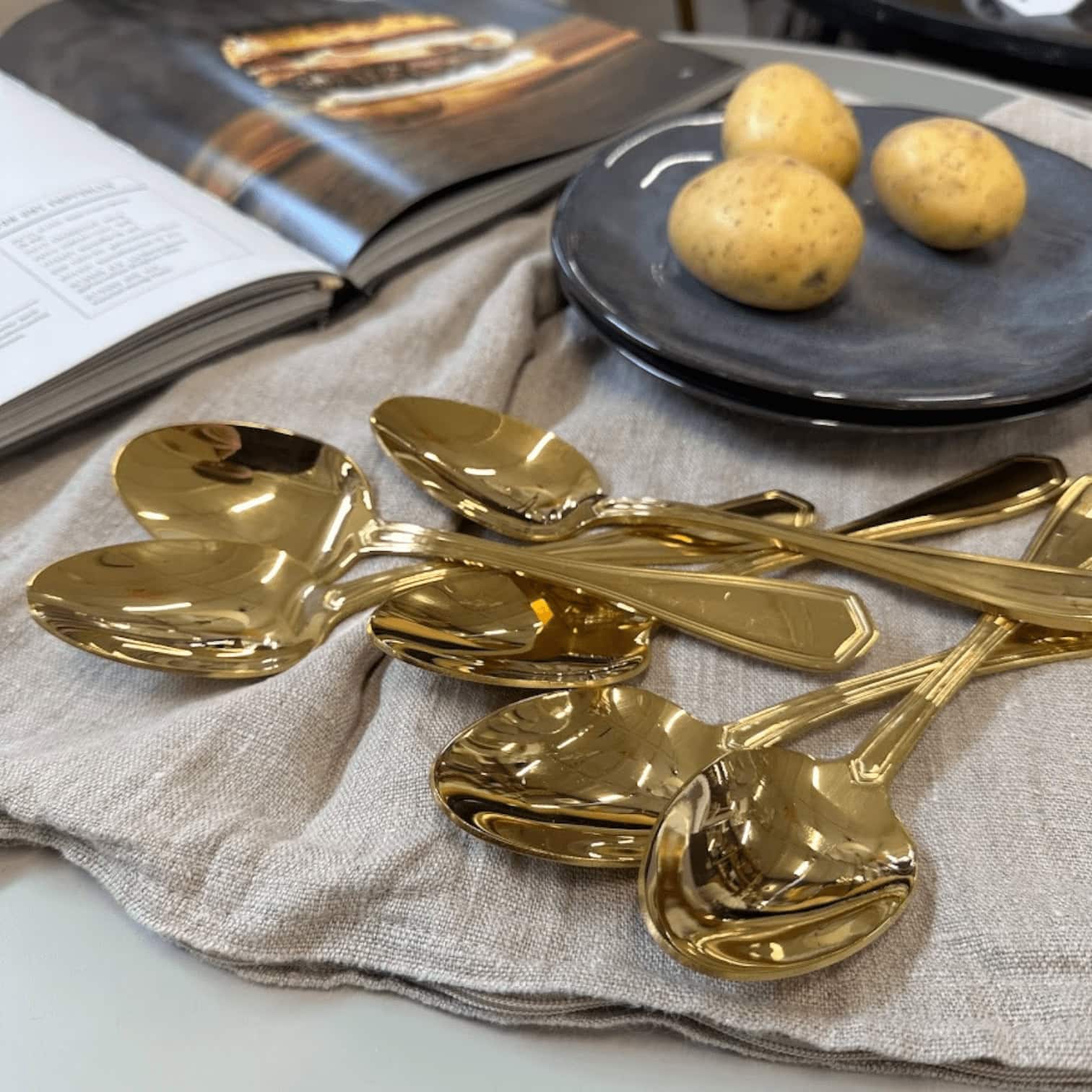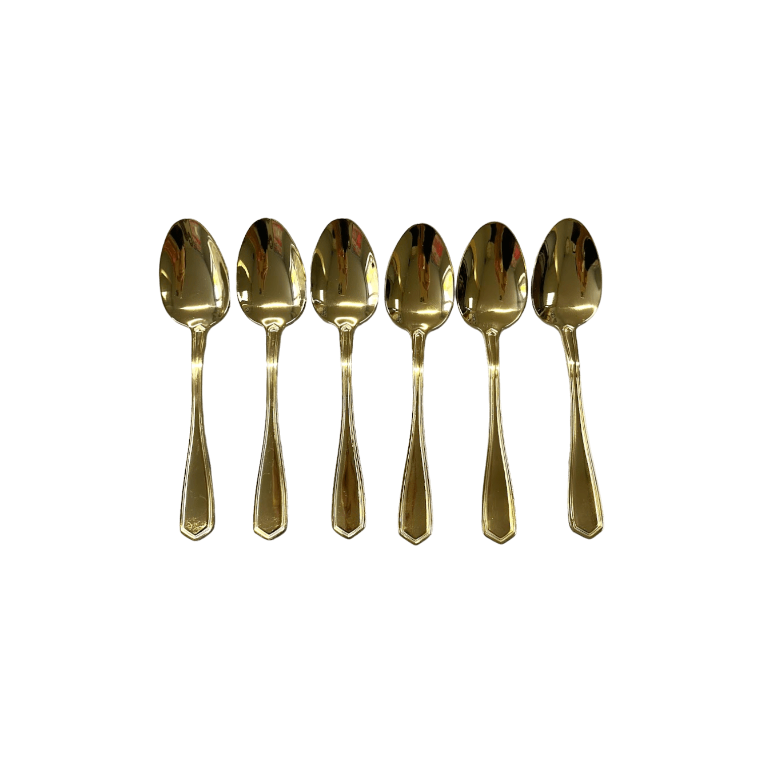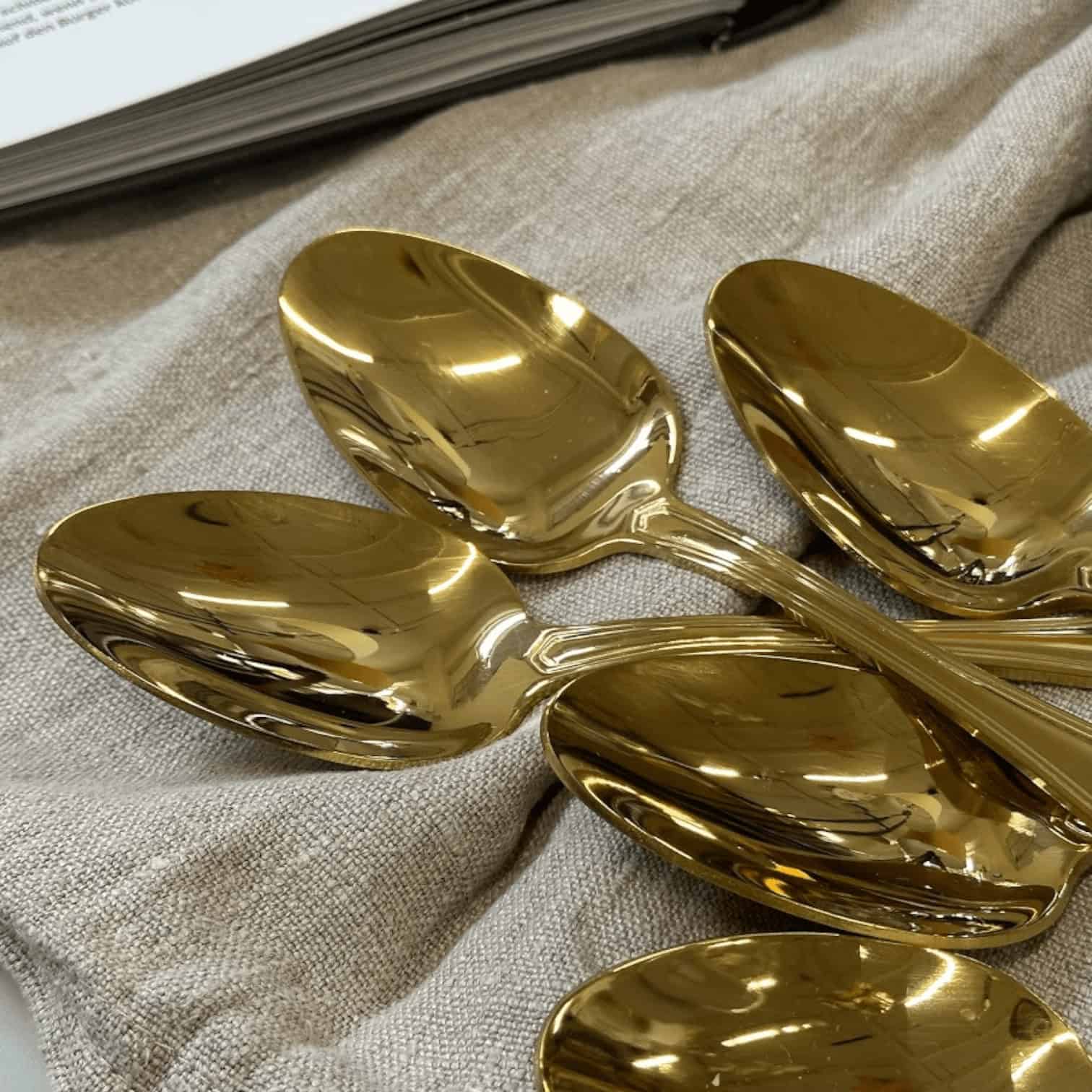 Šis greznais zelta karotīšu komplekts ir satriecošs papildinājums jebkurai ēdamistabas kolekcijai, izstaro eleganci un izsmalcinātību. Katra komplektā esošā karote ir izgatavota no augstas kvalitātes nerūsējošā tērauda, kas rūpīgi pārklāta ar mirdzošu zelta slāni. Karotēm ir gluda, pulēta apdare, kas skaisti atstaro gaismu, piešķirot tām mirdzošu, spoguļam līdzīgu spīdumu.