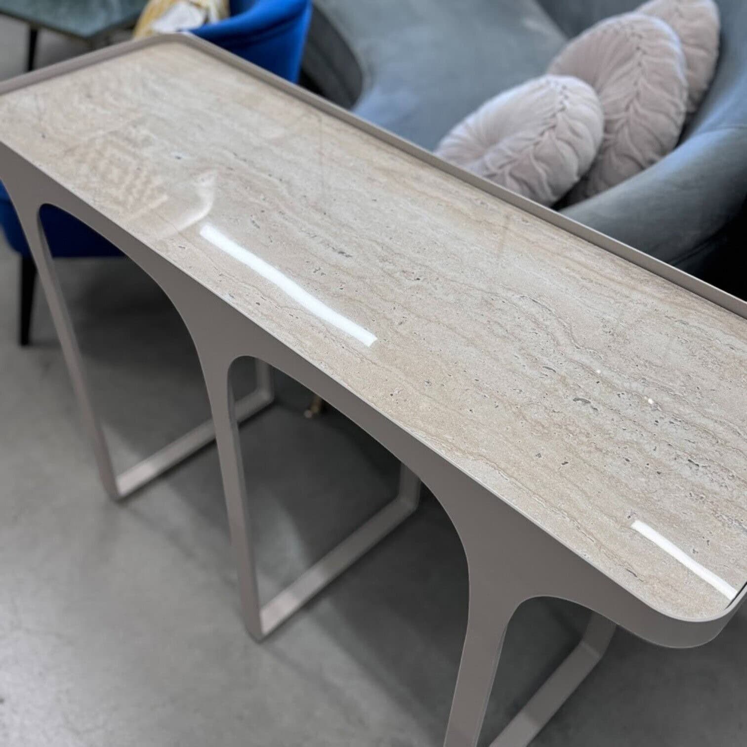Pievienojiet savai mājai modernu un stilīgu akcentu ar Bella konsoles galdu. Tā gaiši bēšā travertīna imitācijas virsma lieliski harmonizē ar dažādiem interjera stiliem, piešķirot telpai izsmalcinātību un vieglumu. Stabilā un izturīgā metāla konstrukcija nodrošina ilgmūžību un drošību, padarot šo galdu ne tikai dekoratīvu, bet arī praktisku izvēli.