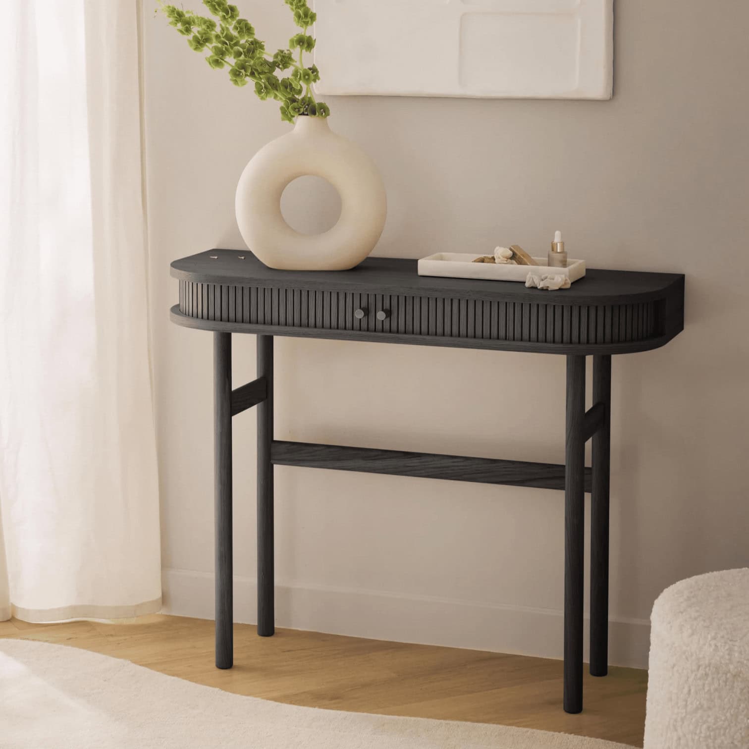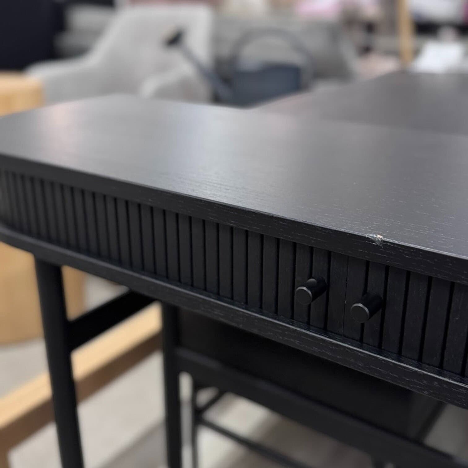 Konsole Calary, melna – eleganta, daudzpusīga un moderna, kas lieliski papildina dažādas telpas. CALARY sērija izceļas ar savu unikālo dizaina elementu – rievotajām bīdāmajām durvīm, kas piešķir mēbelei izteiktu raksturu un taktilu pievilcību. Tā ir funkcionāla, estētiska un izgatavota no FSC® sertificēta koka, nodrošinot ilgtspējīgu un atbildīgu izvēli.