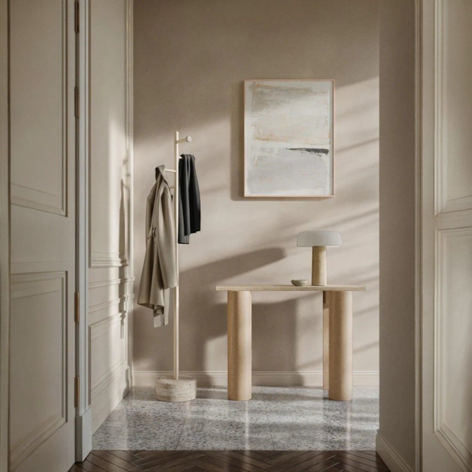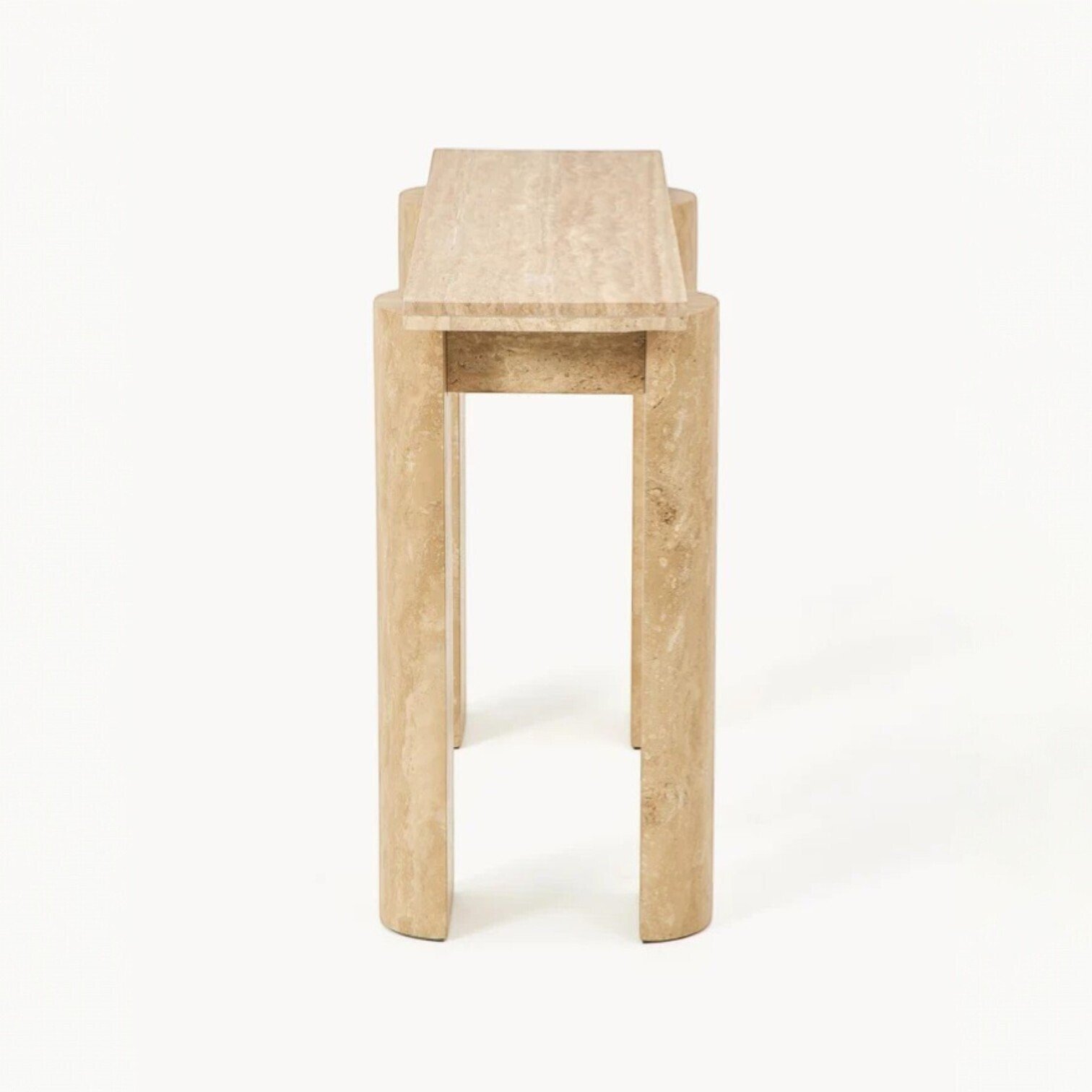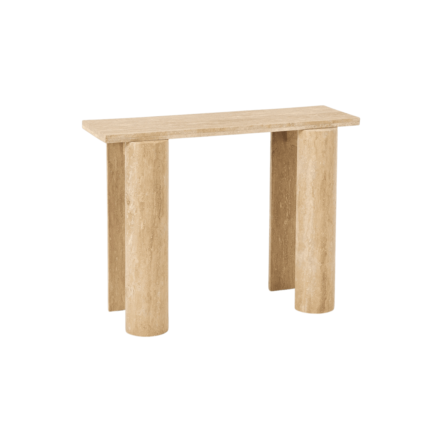 Šī travertīna konsole ir izsmalcināts dizaina elements, kas iemieso dabisku greznību un arhitektonisku stingrību. Tās minimālistiskā forma izceļ travertīna unikālo tekstūru un silto, smilškrāsas toni, padarot katru eksemplāru par neatkārtojamu dabas mākslas darbu jūsu mājoklī. Galda virsma balstās uz masīvām, cilindriskām kājām, radot harmonisku līdzsvaru starp stabilitāti un vieglumu, kas lieliski papildinās gan modernu, gan klasisku interjeru. Šī konsole ir ideāli piemērota novietošanai gaitenī, viesistabā vai aiz dīvāna, kalpojot kā eleganta platforma mākslas priekšmetiem, lampām vai iecienītākajiem dekoriem. Tā nav tikai mēbele, bet gan ilgmūžīgs stila apliecinājums, kas telpā ienes mieru, dabisku siltumu un nevainojamu estētiku.