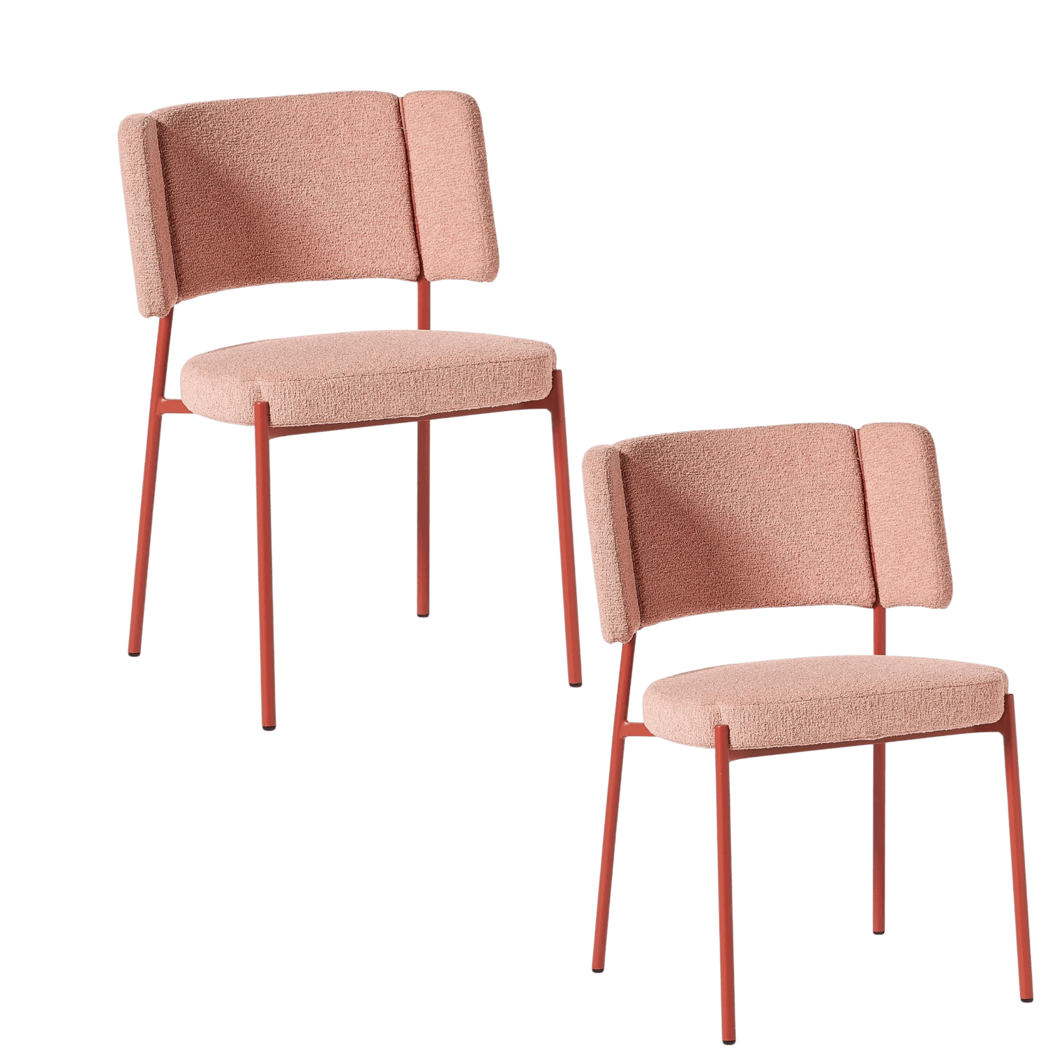 Ienesiet interjerā modernu eleganci ar Samantha krēslu komplektu – diviem stilīgiem krēsliem, kas apvilkti ar maigu rozā bouclé audumu un izcelti ar sarkaniem akcentiem. Ideāli piemēroti gan ēdamistabai, gan viesistabai, mājas birojam vai kā dizaina akcents jebkurā telpā.
