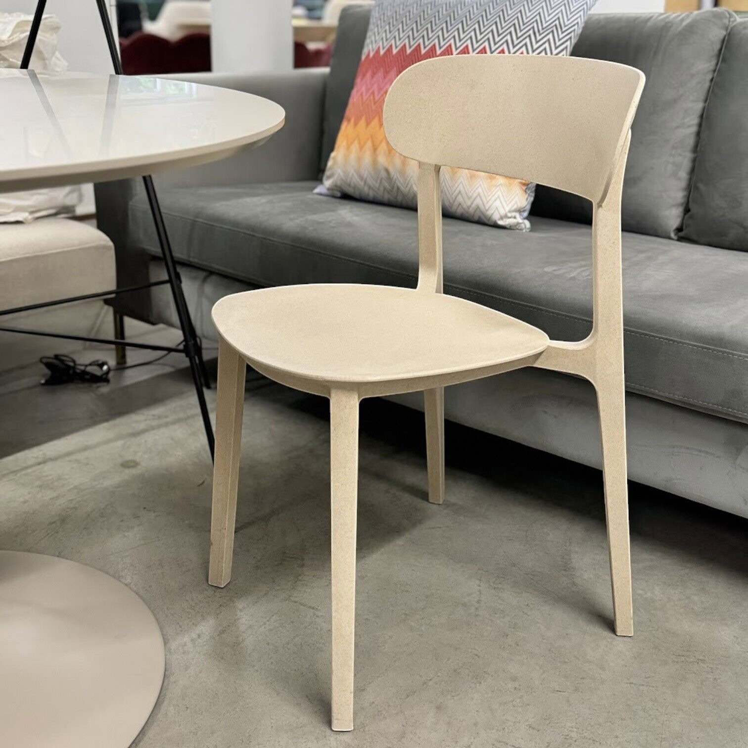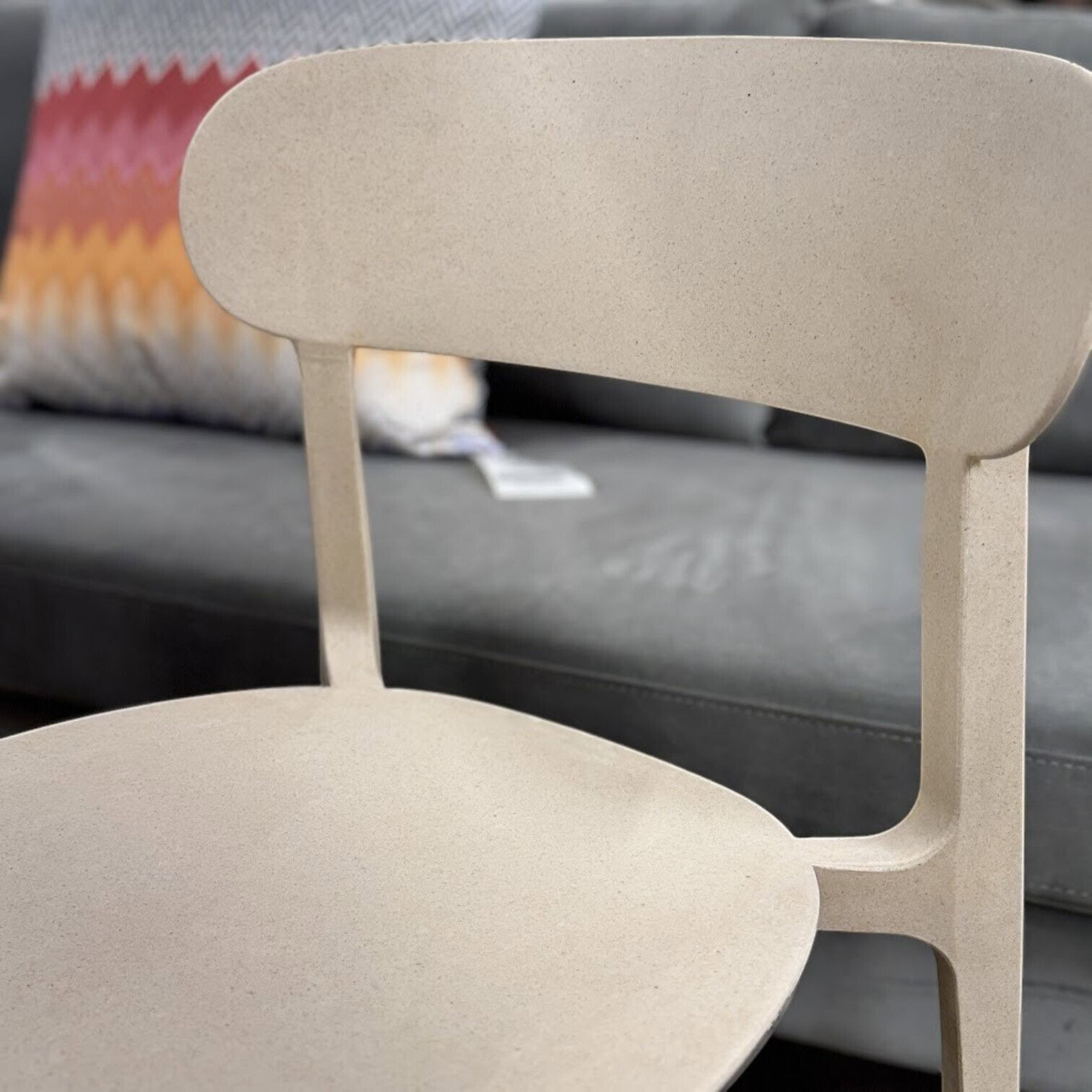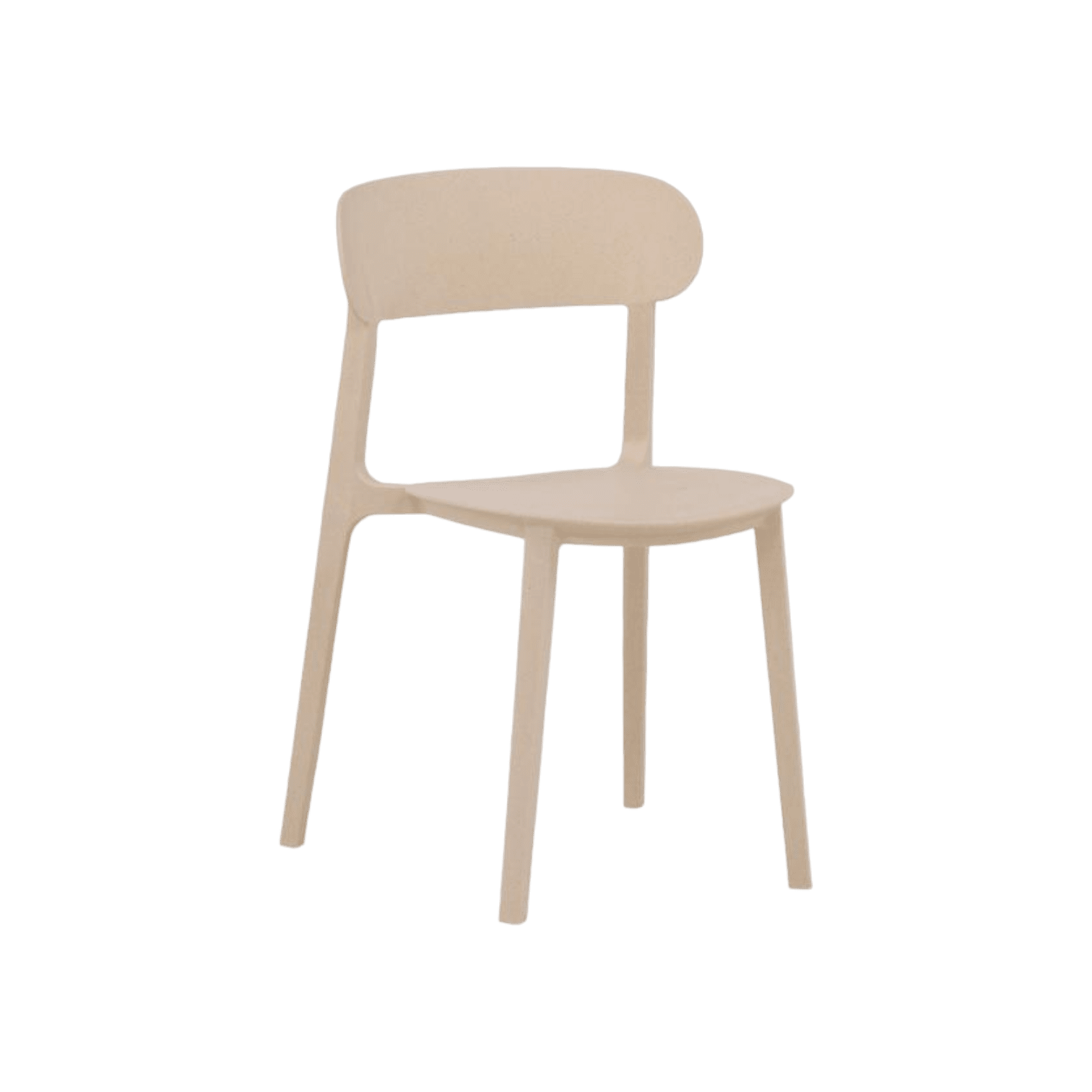 Krēsls ir izgatavots no izturīga plastmasa, kas pārklāts ar gaišu, matētu apdari, piešķirot tam tīru un harmonisku izskatu. Tā taisnās, skandināviski vienkāršās līnijas un atvērtā forma rada gaisīgu un vizuāli vieglu iespaidu, vienlaikus nodrošinot stabilitāti un komfortu.
