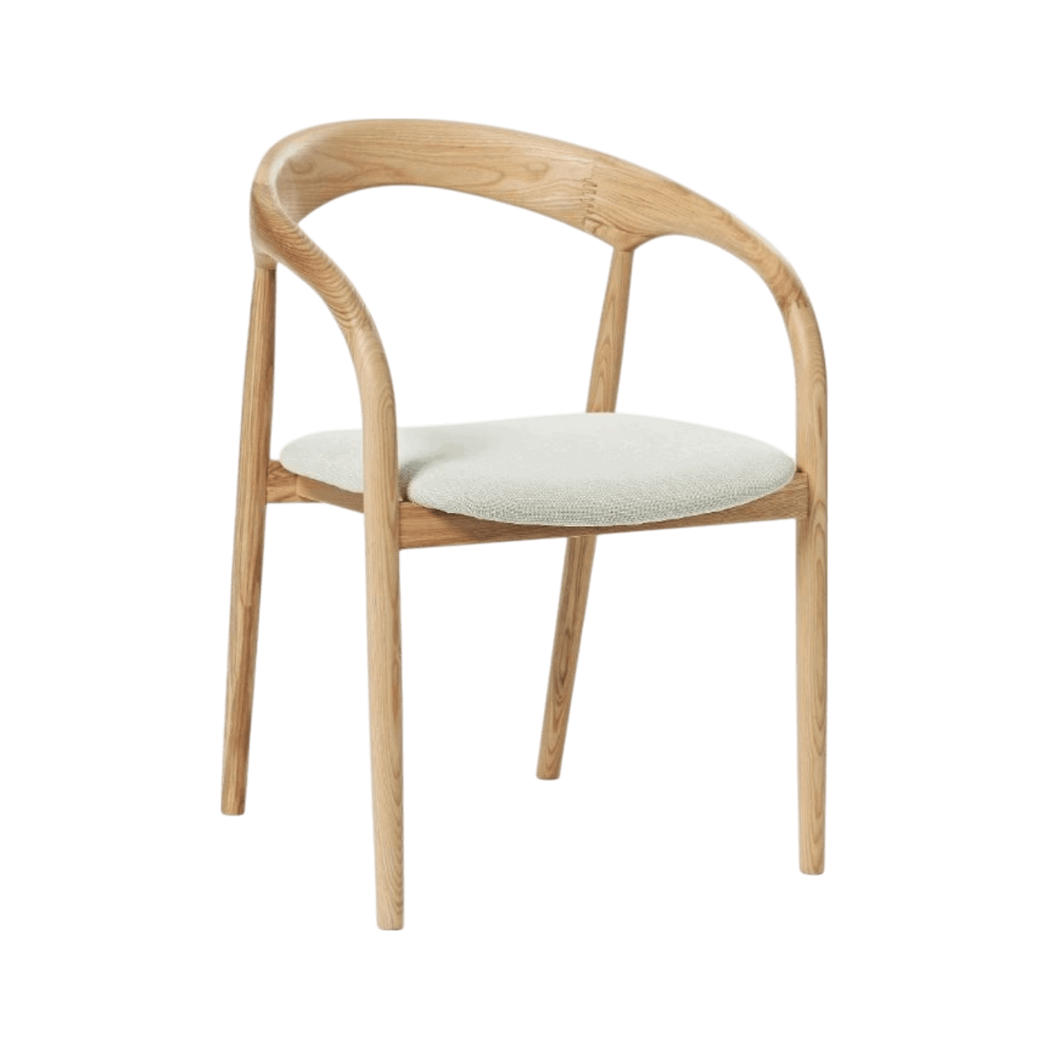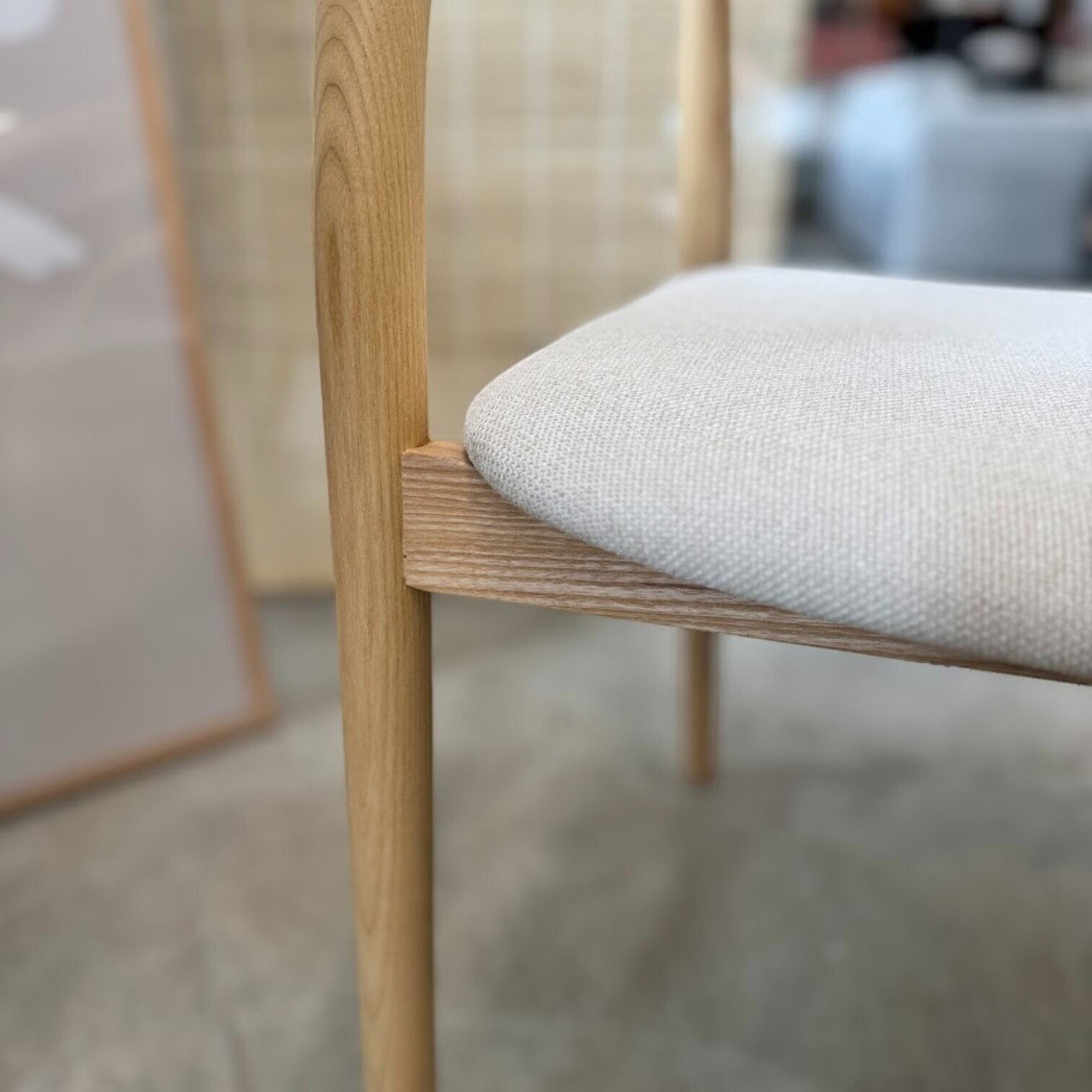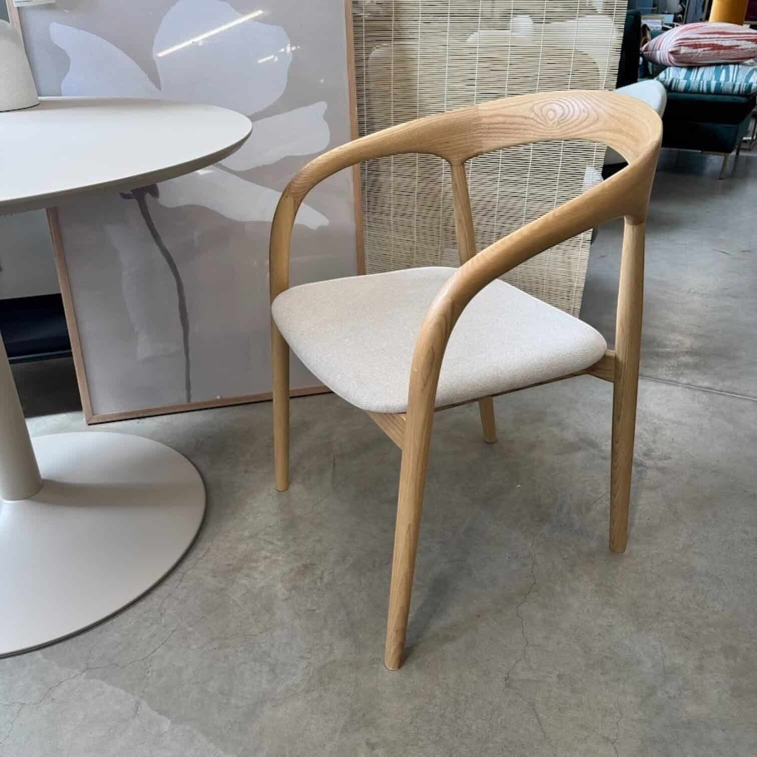 Sēdeklis ir polsterēts ar maigu, gaišu audumu, piedāvājot ērtu sēdēšanu ikdienā. Dabīgā koka faktūra un tīrās līnijas padara šo krēslu par ideālu izvēli modernam, skandināviskam vai dabas iedvesmotam interjeram.
