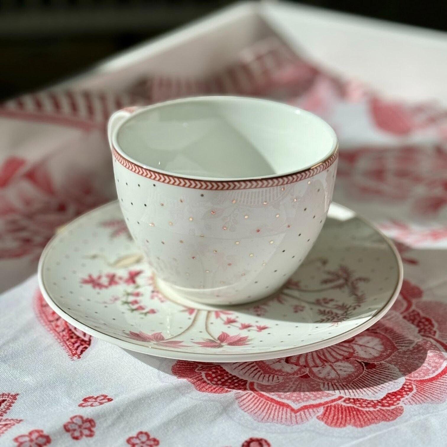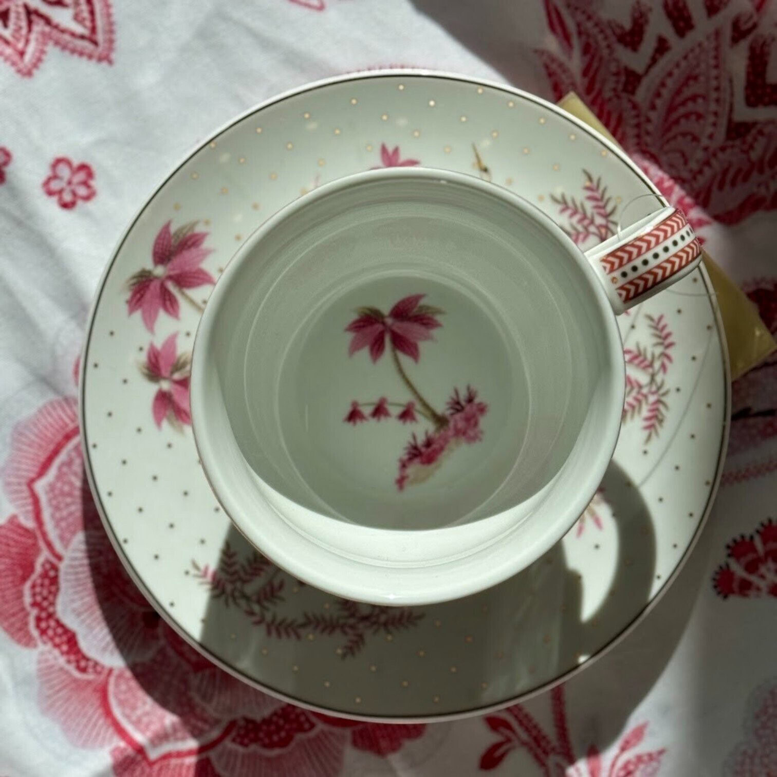 Apakštase papildināta ar augu un ziedu motīviem, kā arī baltā gārņa un gulbja attēliem, kas piešķir servējumam sapņainu un romantisku noskaņu. Tasītes rokturis un augšējā mala rotāti ar maigi rozā detaļām, kas eleganti izceļ trauka formas.