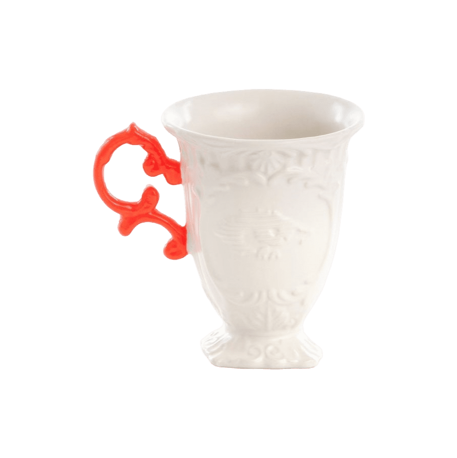 Smalks, necaurspīdīgs porcelāns ar matēti baltu apdari un fluorescējošas krāsas rokturiem.