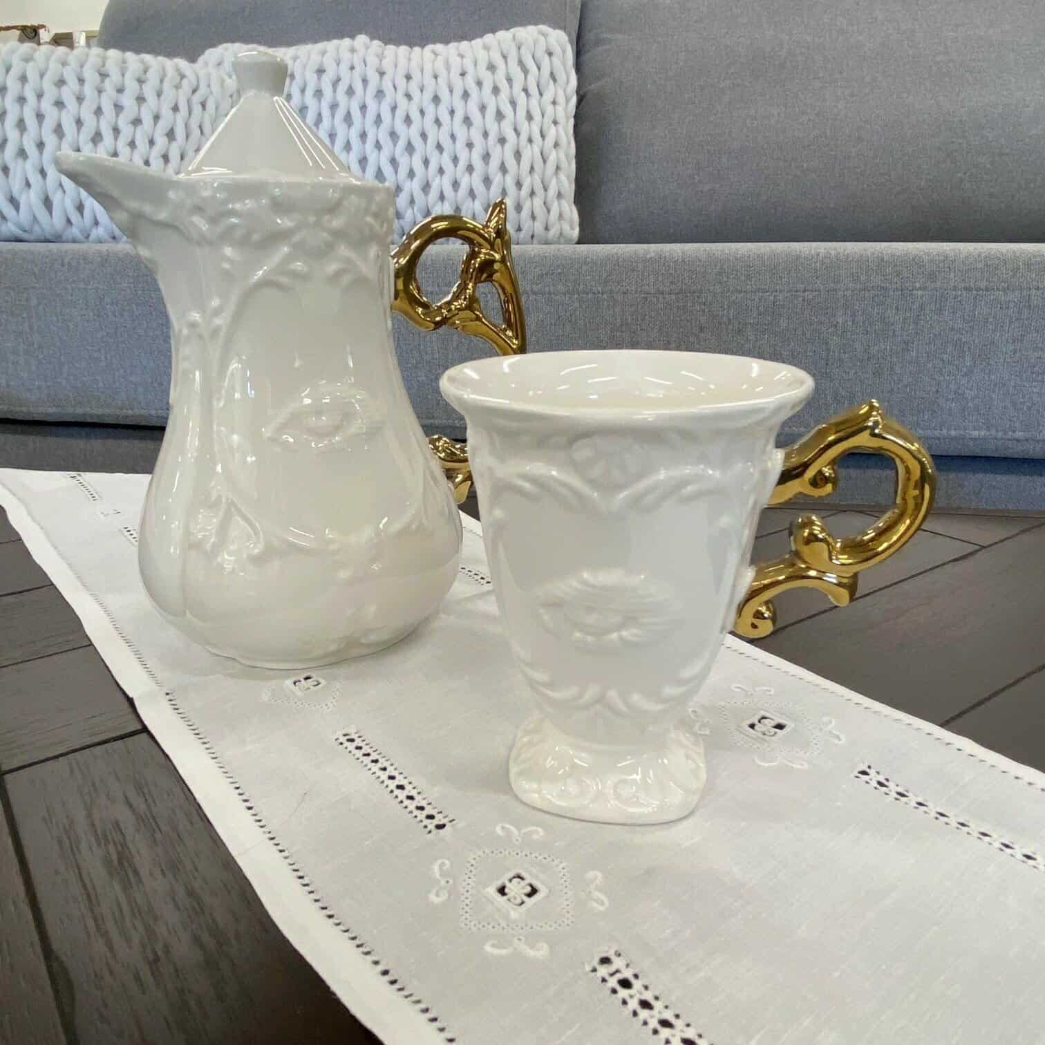 Krūzes, tējas un kafijas komplekti, kas ir baroka stila iedvesmoti.