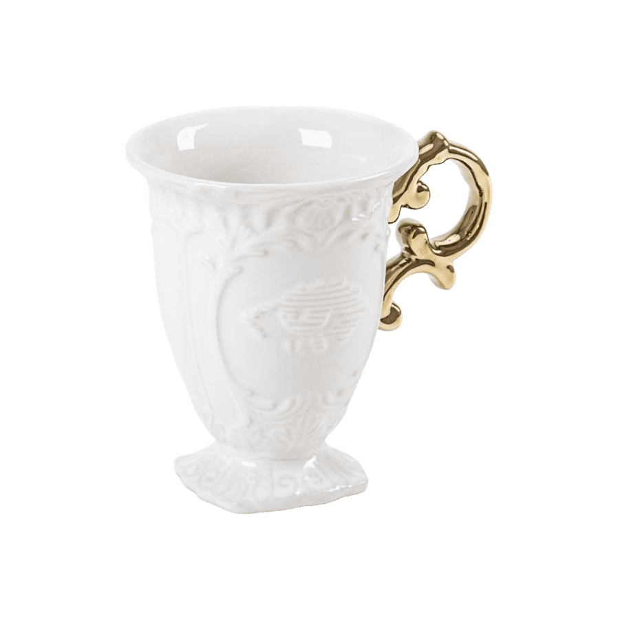 Smalks, necaurspīdīgs porcelāns ar matēti baltu apdari un zelta krāsas rokturiem.