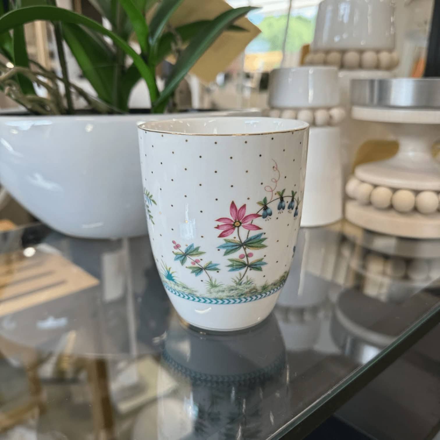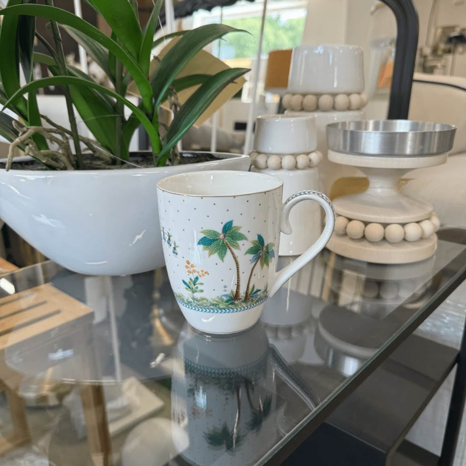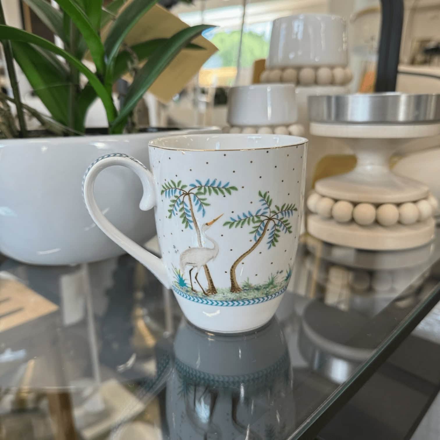 Šī lielā krūze ar saviem rotājumiem aizvedīs jūs ceļojumā uz kādu dārgumu salu. Baltais fons un tropiskie augi ļaus jums iztēloties sevi dabas pilnajā pasaulē. Putns lido virs dažādiem augiem, kokiem un krāsainiem ziediem. Krūzes rokturi rotā zilas detaļas. Turklāt krūze ir rotāta ar zelta punktiem, kas rada rotaļīgu efektu.