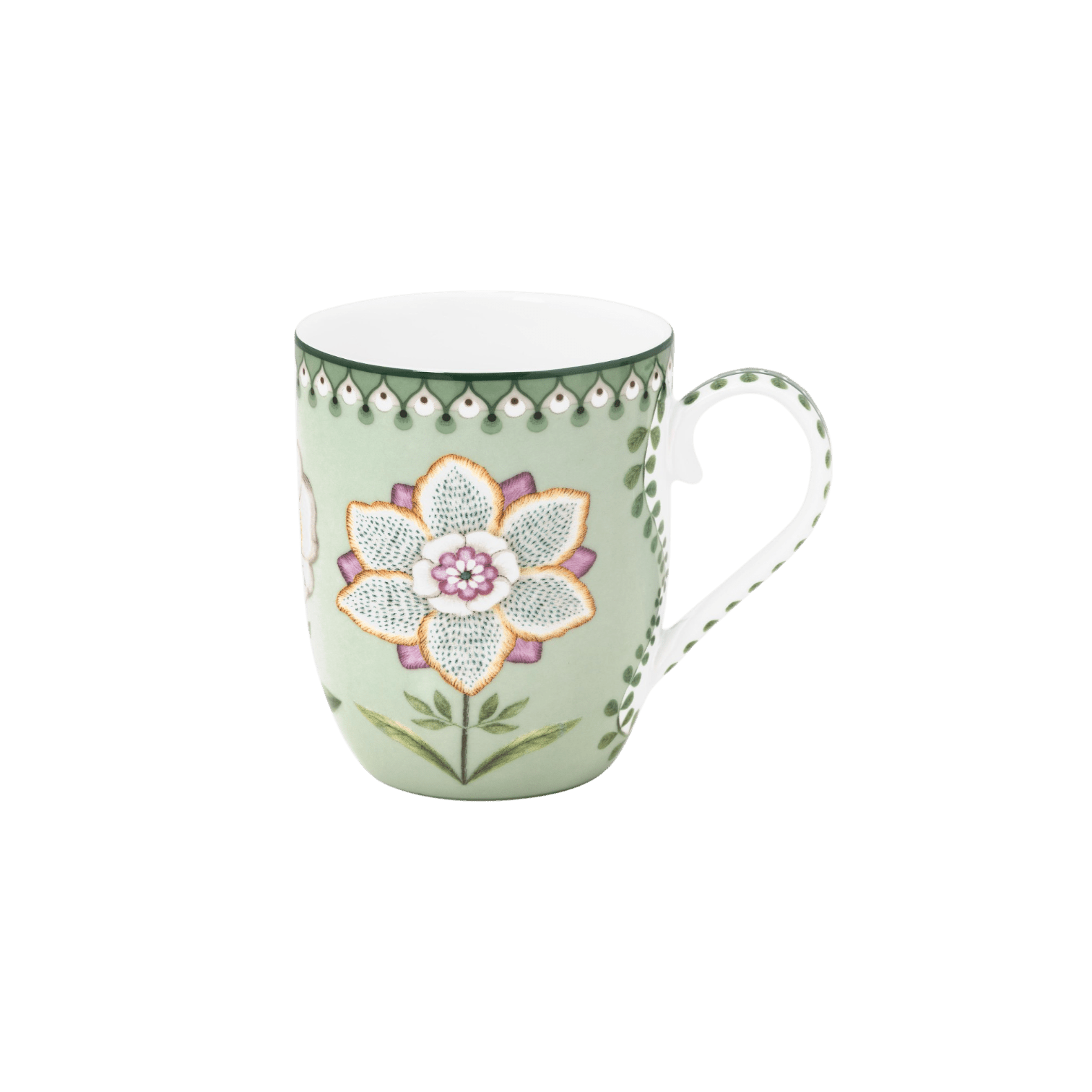 Krūze Lily&Lotus Light Green no Pip Studio “Lily & Lotus” kolekcijas apvieno dabas iedvesmotu eleganci un modernu dizainu. Gaiši zaļo krūzi rotā izdomas bagāta lilija pasteļtoņos. Zieds un graciozās papardes ir novietotas simetriski, piešķirot krūzei mūsdienīgu pieskaņu.
