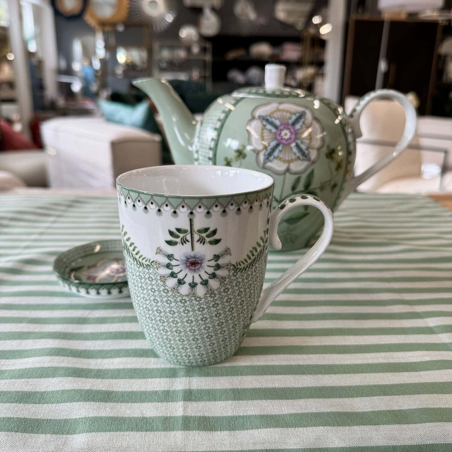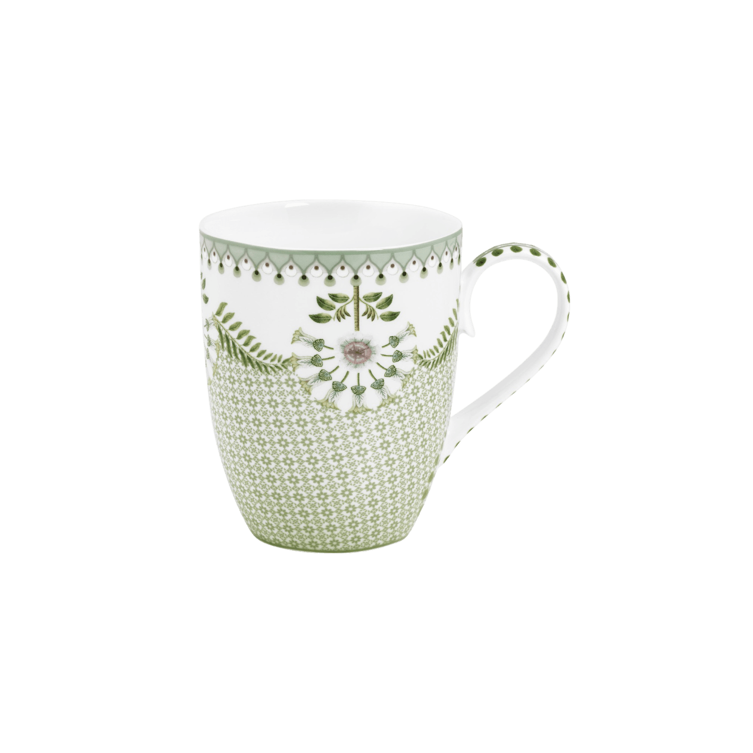 Krūze Lily&Lotus Tiles Light Green no Pip Studio “Lily & Lotus” kolekcijas apvieno dabas iedvesmotu eleganci un modernu dizainu. Gaiši zaļā krūze ir dekorēta ar maziem grafiskiem ziediem. Ziedi un graciozās papardes ir izvietotas simetriski, piešķirot krūzei mūsdienīgu pieskaņu.
