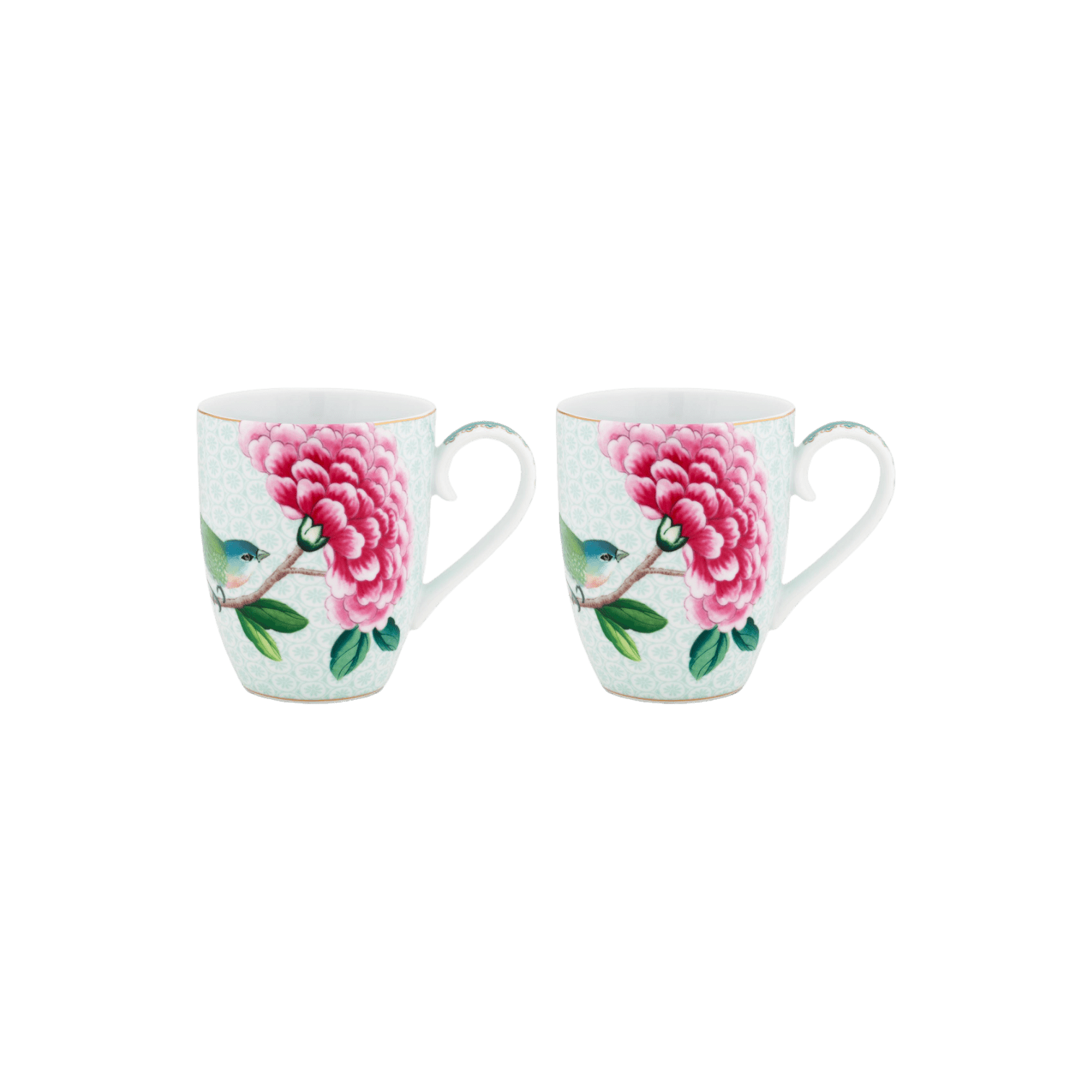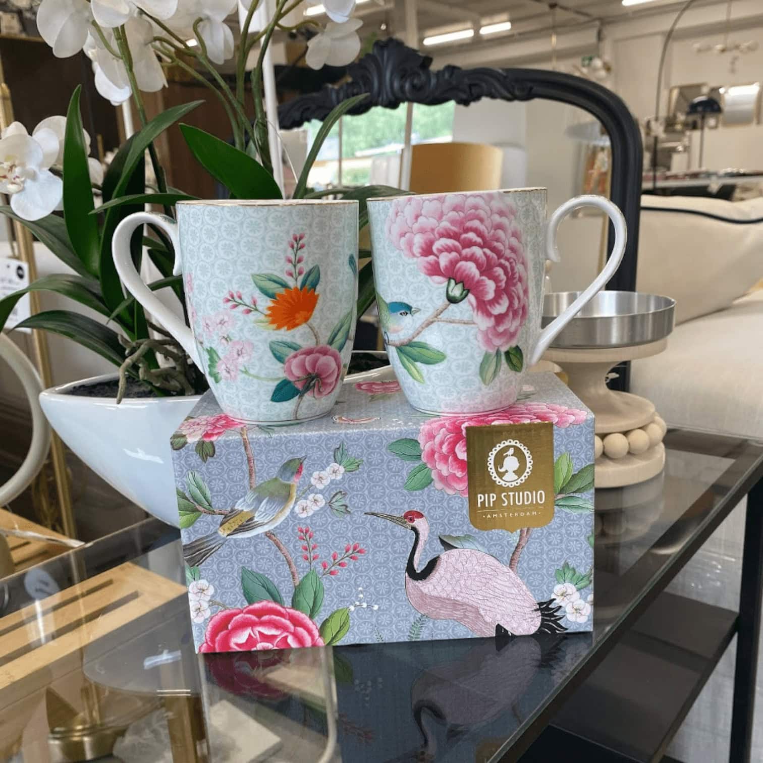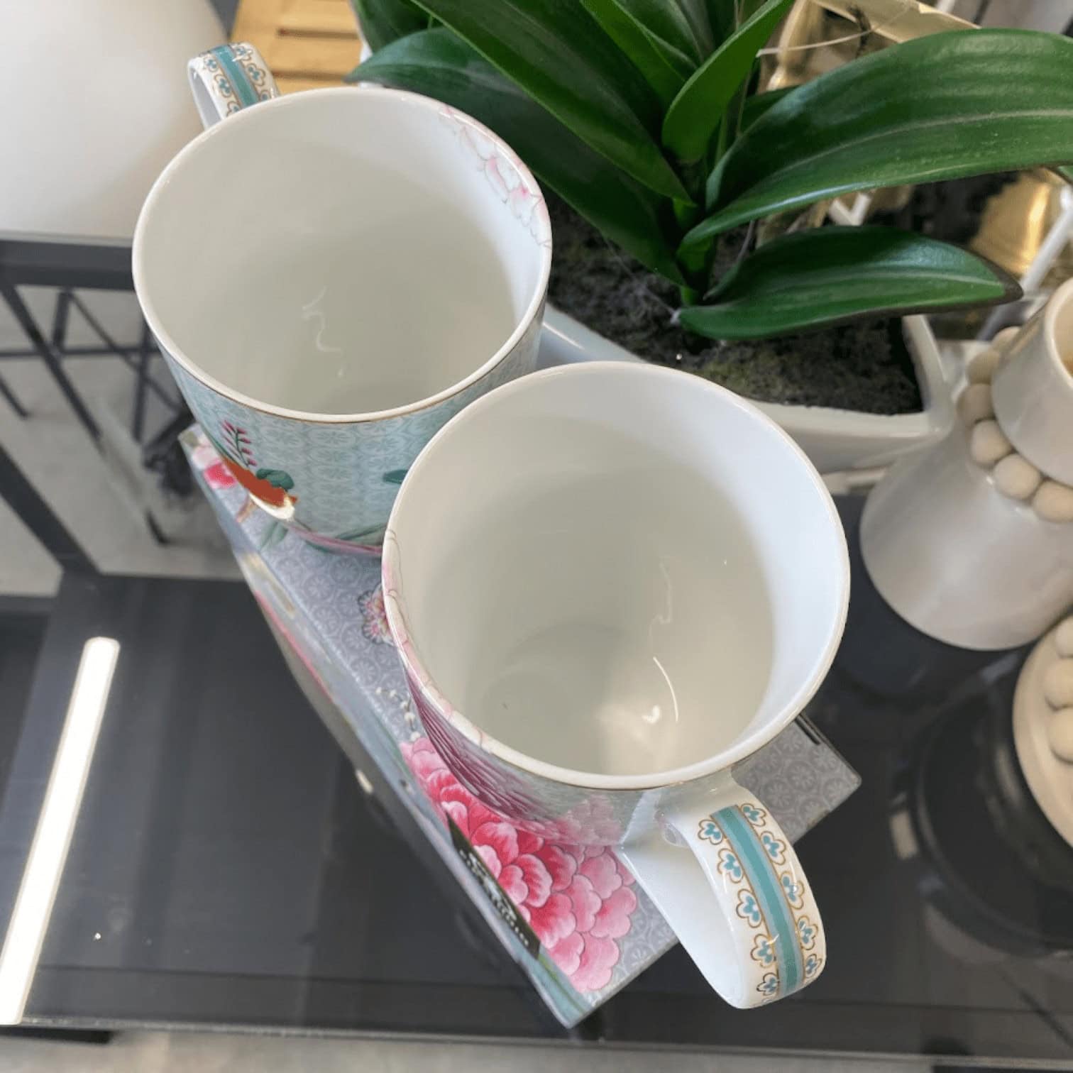 Šo divu baltu porcelāna krūžu komplektu rotā eksotiski ziedi, putni un zelta detaļas. Lielais rozā zieds nedaudz sniedzas pāri malām, un fonam ir elegants dizains.
