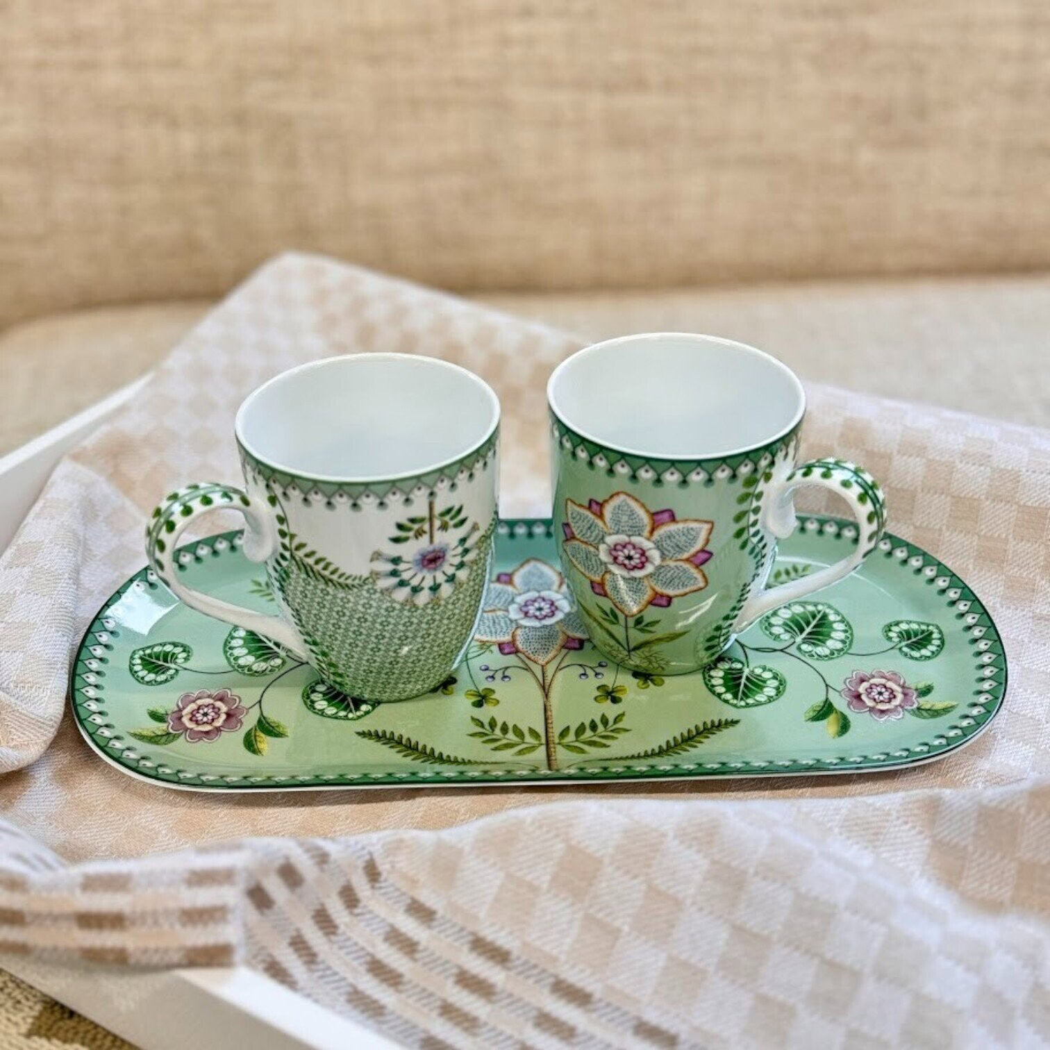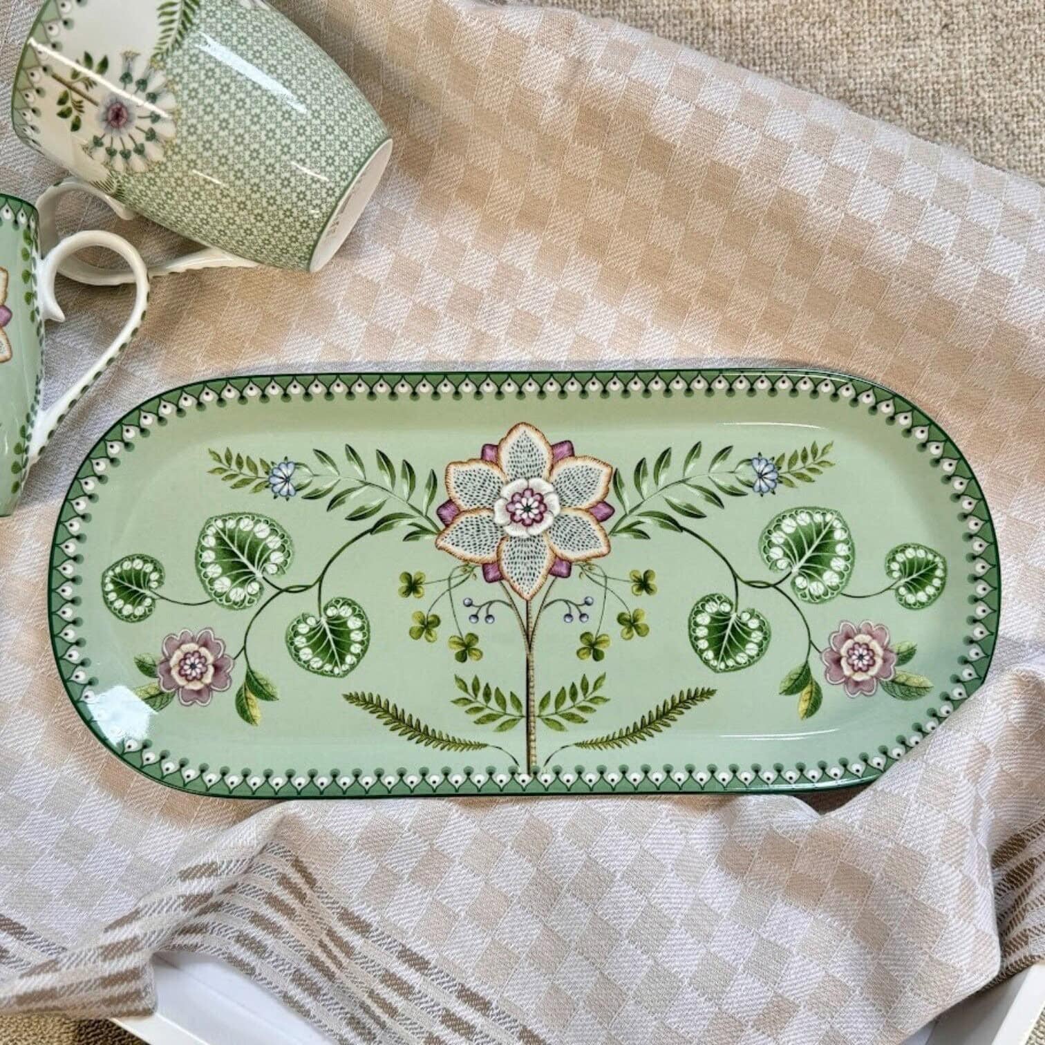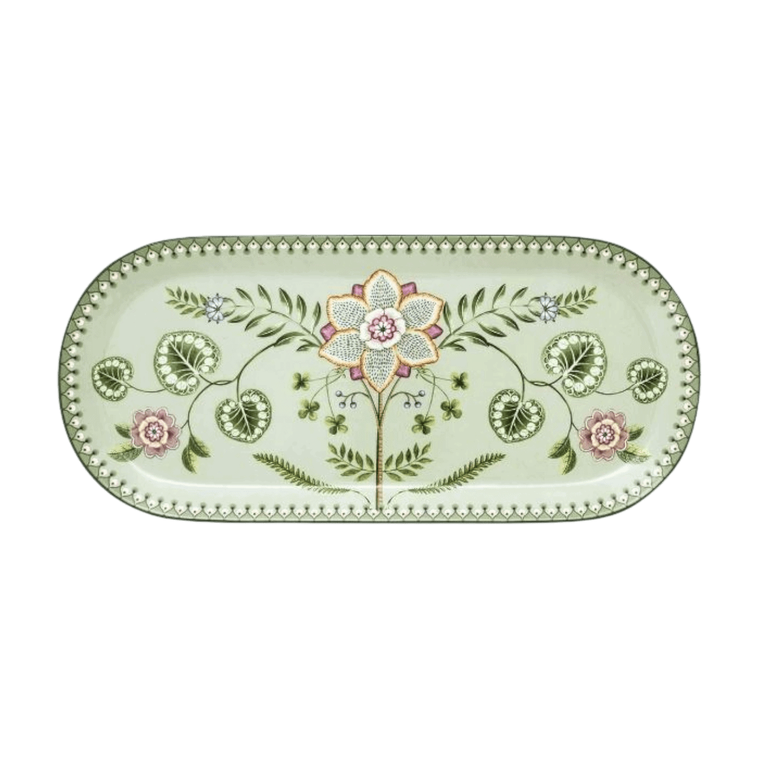 Kūkas paplāte Lily&Lotus Light Green no Pip Studio “Lily & Lotus” kolekcijas ir gan praktisks, gan izsmalcināts papildinājums jūsu galda klājumam. Maigi zaļajā fonā izvietoti iztēles pilni liliju ziedi un lotosa lapas, ko papildina smalkas papardes. Simetriskais raksts piešķir paplātei mūsdienīgu un vizuāli sabalansētu izskatu.