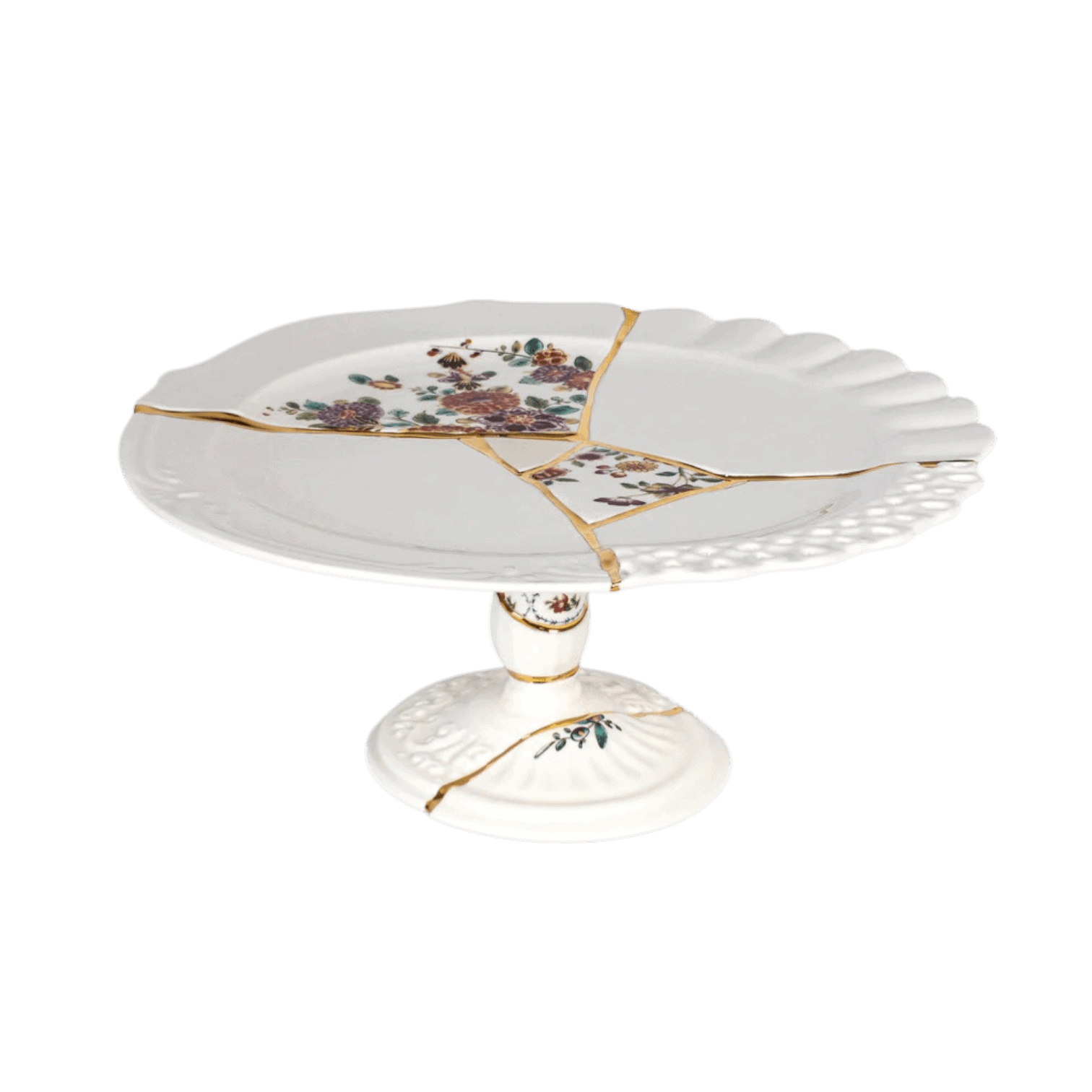 Seletti Kintsugi kūku statīvs ir elegants un māksliniecisks galda servēšanas elements, ko radījis dizainers Marcantonio Raimondi Malerba. Tas iedvesmots no japāņu Kintsugi tehnikas, kur nepilnības tiek pārvērstas skaistumā, izmantojot zelta akcentus.
