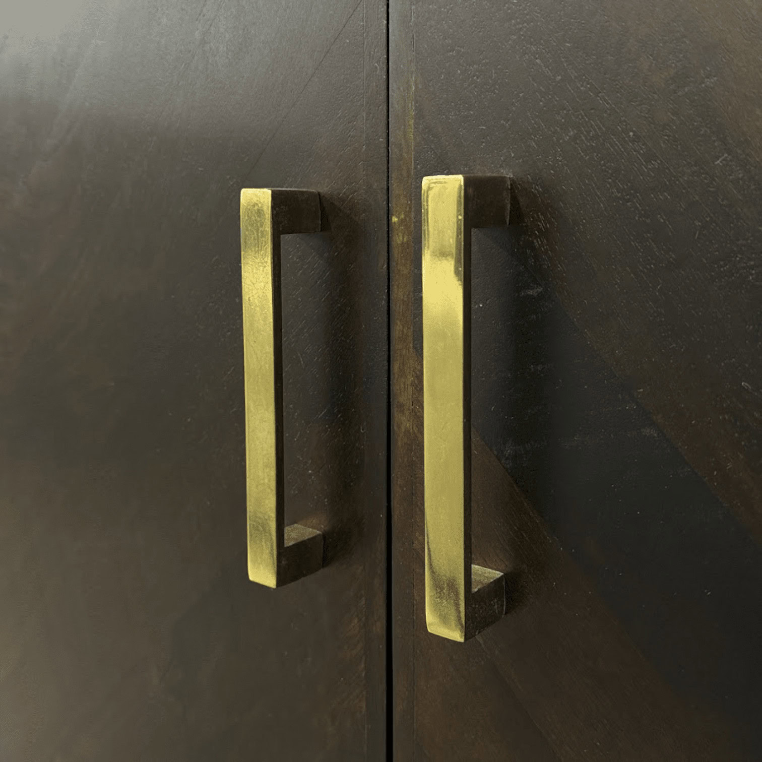 Kumodei ir 3 durvis ar rokturiem, aiz kurām ir arī plaukti (to augstums nav regulējams). Mēbeles rokturi ir zelta krāsā, savukārt kājas ir melnā krāsā un lakojums ir matēts.