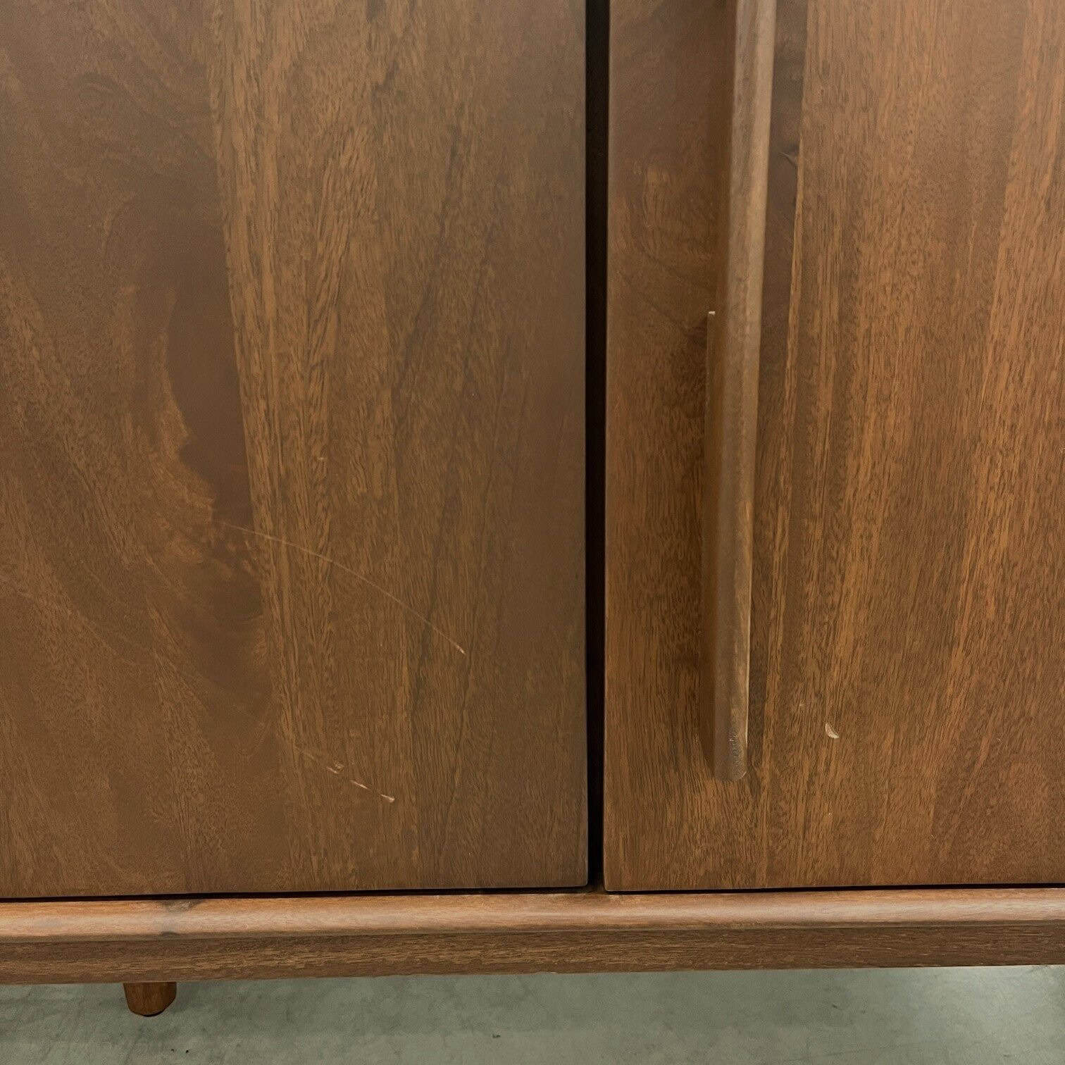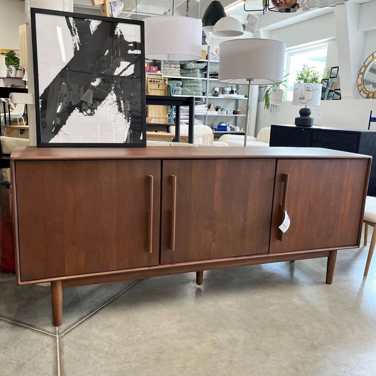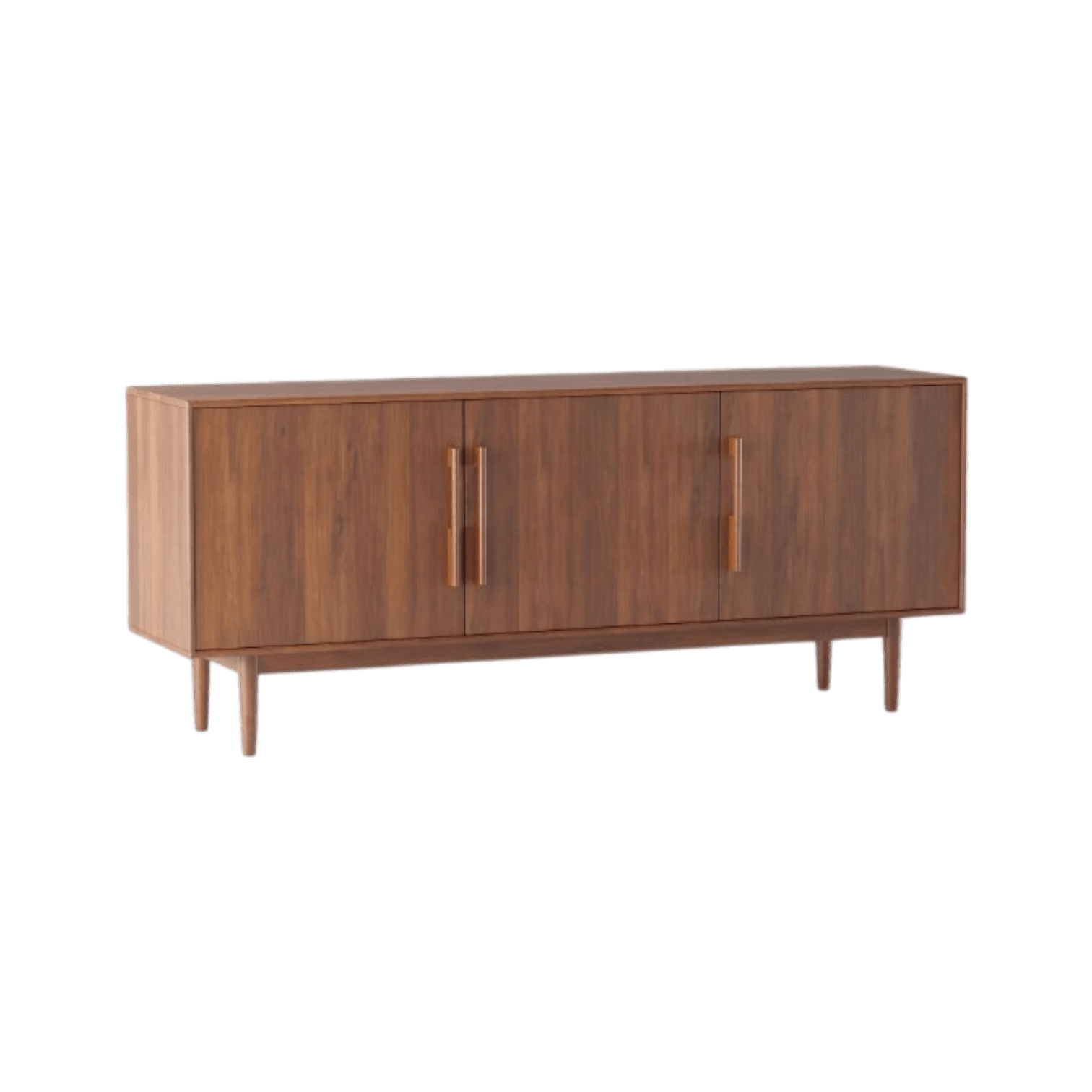 Kumodei ir elegants, vienkāršs dizains ar taisnām līnijām un siltu koka toni, kas piešķir tai klasisku un tajā pašā laikā mūsdienīgu izskatu. Kumodes durvis aprīkotas ar vertikāliem, izteiksmīgiem rokturiem, kas papildina kopējo estētiku. Kumode balstās uz konusveida kājām, kas ir raksturīgas retro dizainam un nodrošina stabilitāti. Šī mēbele ir lieliski piemērota gan viesistabai, gan ēdamistabai vai priekšnamam, kur nepieciešama stilīga uzglabāšanas vieta.