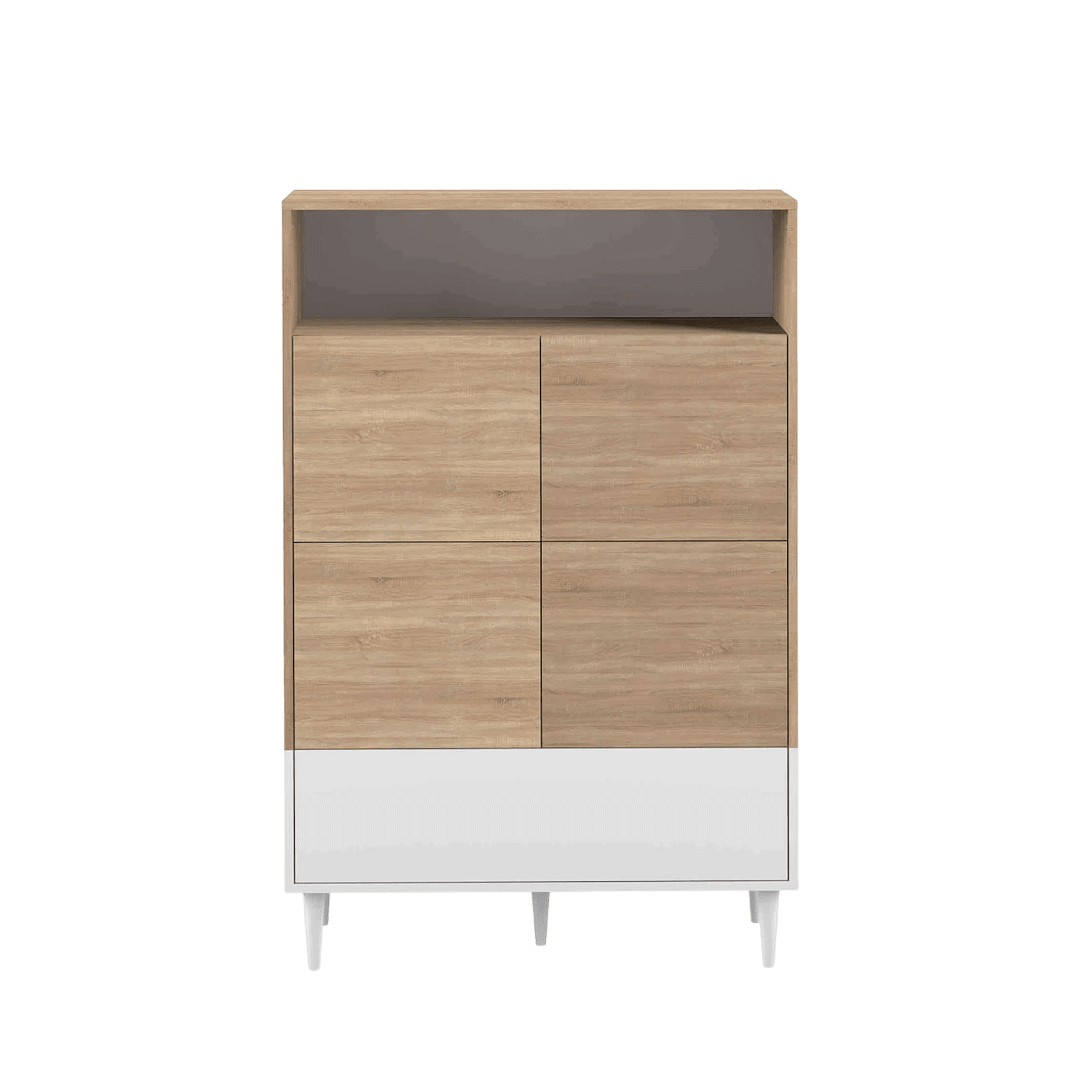 Kumode aprīkota ar četrām slēgtām nodalījumu durtiņām, kas ļauj ērti uzglabāt traukus, tekstilu, dokumentus vai citas sadzīves lietas, saglabājot telpā kārtību. Augšējais atvērtais plaukts ir ideāli piemērots dekoratīviem priekšmetiem, grāmatām vai interjera akcentiem.