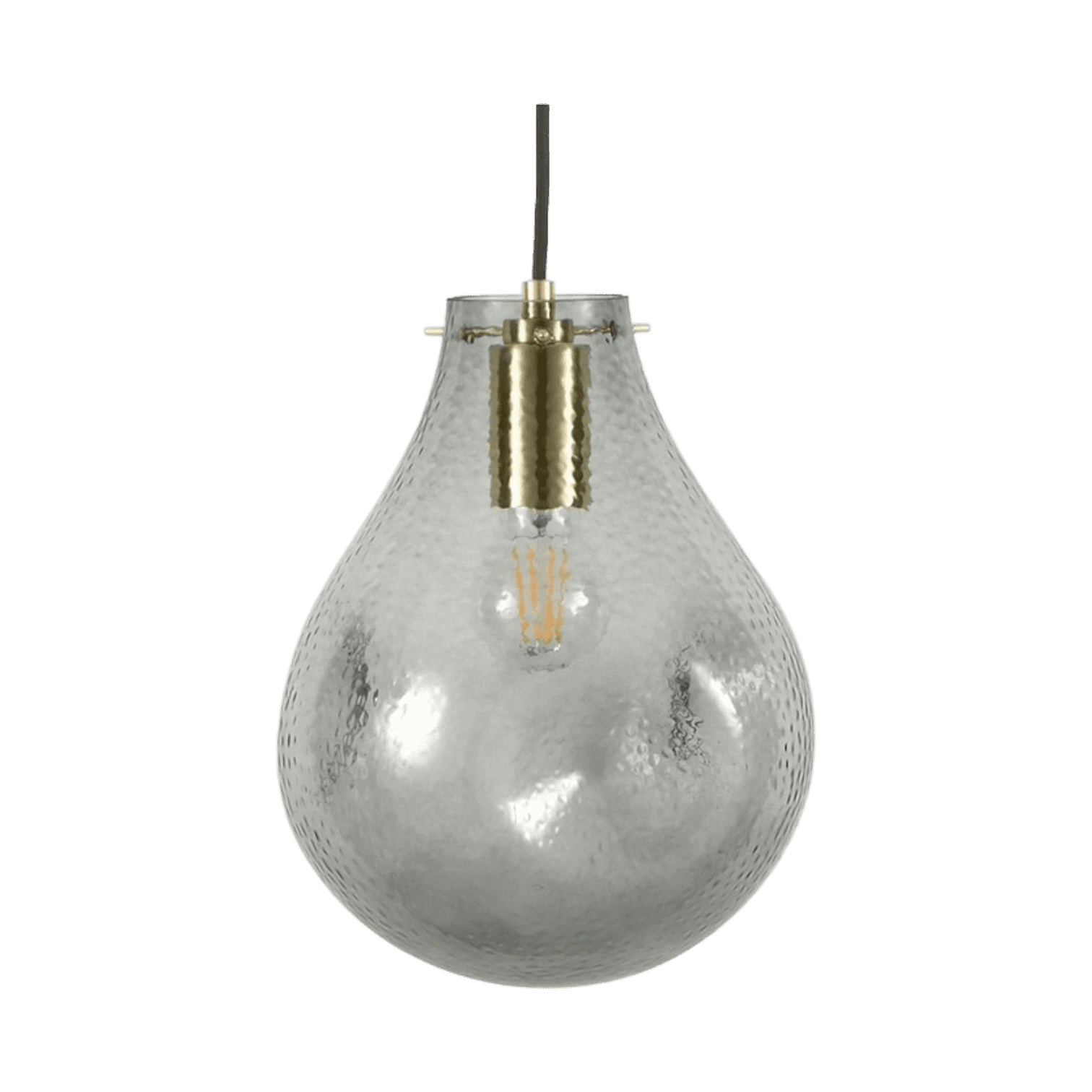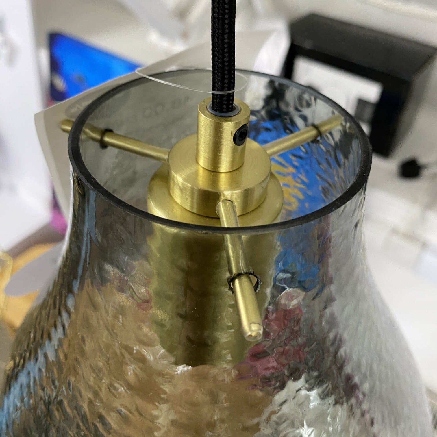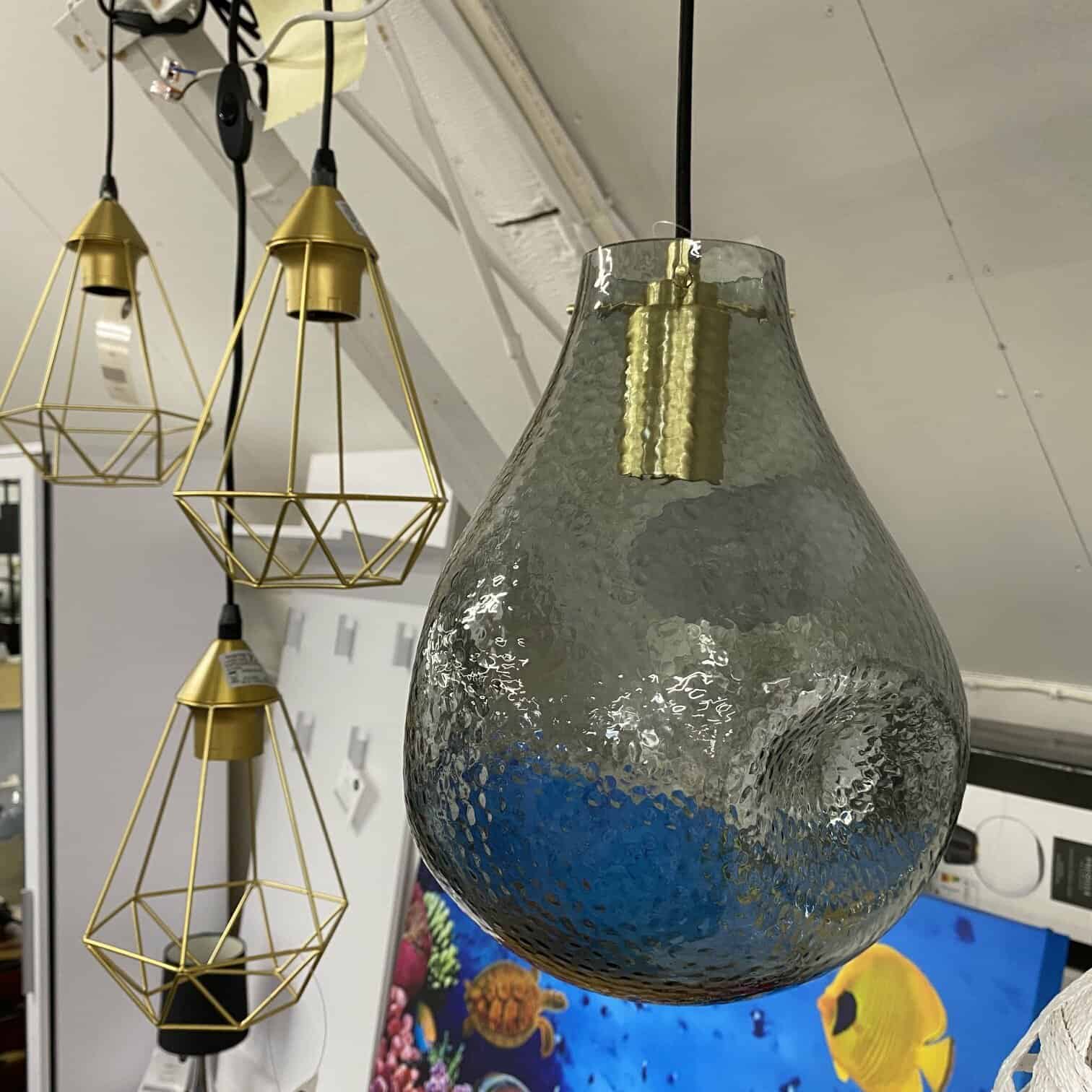 Stikla un metāla griestu lampa. Stikla kupols ir asimetriskā formā, ar punktainu faktūru, izskatās pēc lietus lāses, vai balona, kas pildīts ar ūdeni. Viegla un levitējoša sajūta.