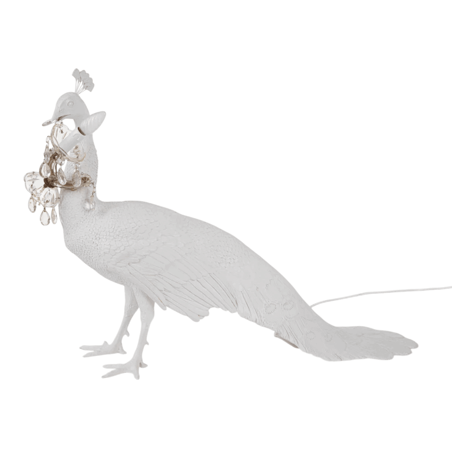 Lampa veidota pāva formā, kas ar lepnu stāju tur kristāla lustru, radot pārsteidzošu kontrastu starp dabas iedvesmu un klasisku greznību. Matēti baltā apdare piešķir tai izsmalcinātu un laikmetīgu raksturu, kas lieliski iekļaujas gan modernā, gan eklektiskā interjerā.