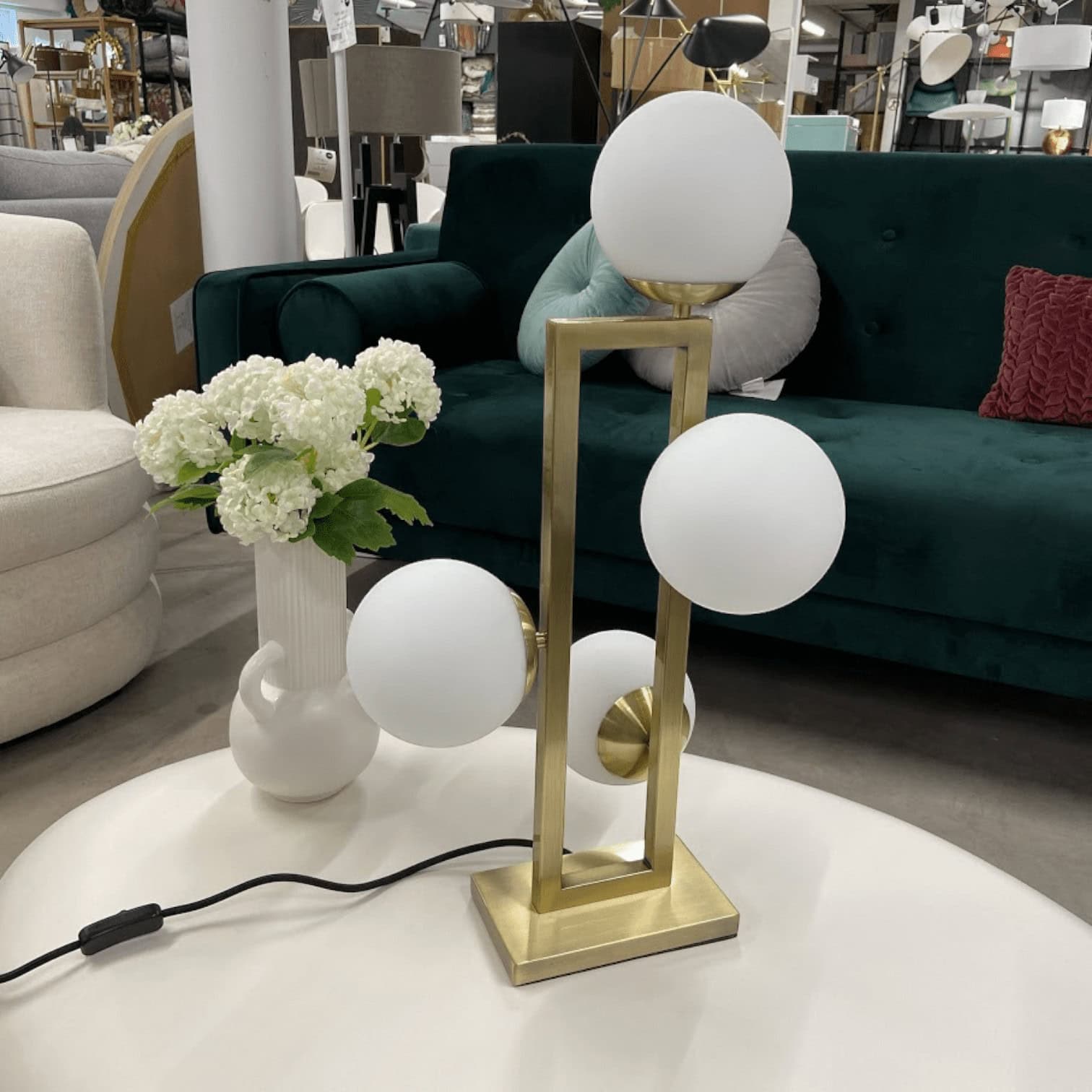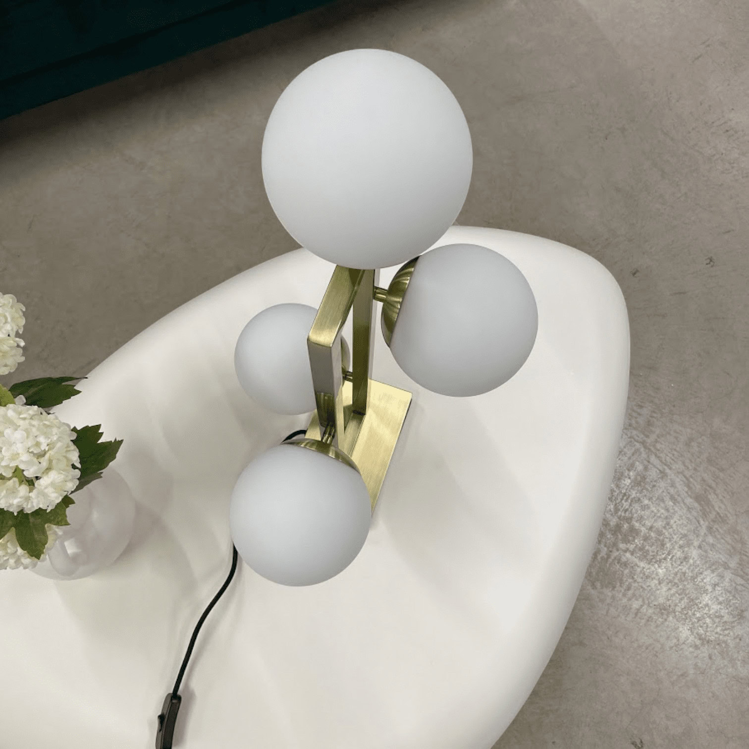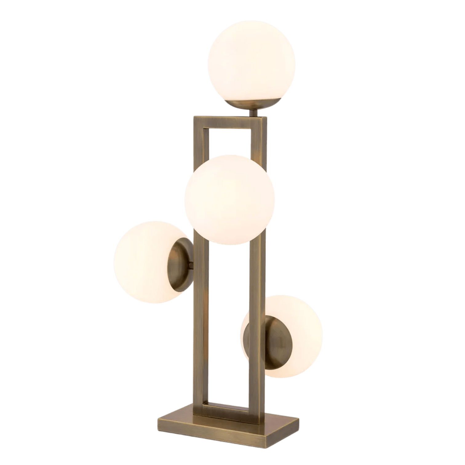 Izcilajai Pascal galda lampai ir raksturīgs gluds taisnstūra rāmis ar vieglu matētu misiņa apdari. 4 baltas stikla bumbas piešķir šai vintage stila lampai elegantu stilu. Ideāli piemērots dzīvojamām telpām, ēdamistabām, guļamistabām un citām telpām.