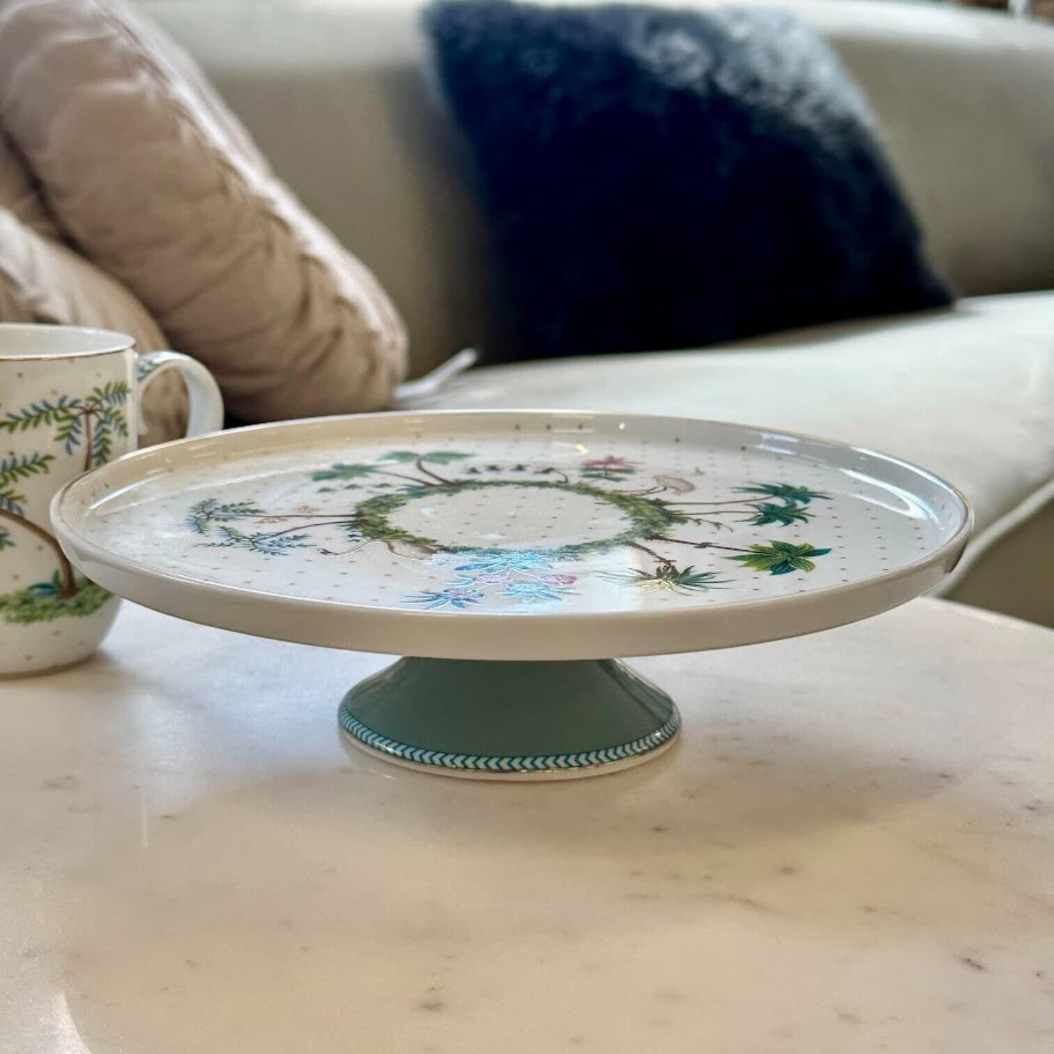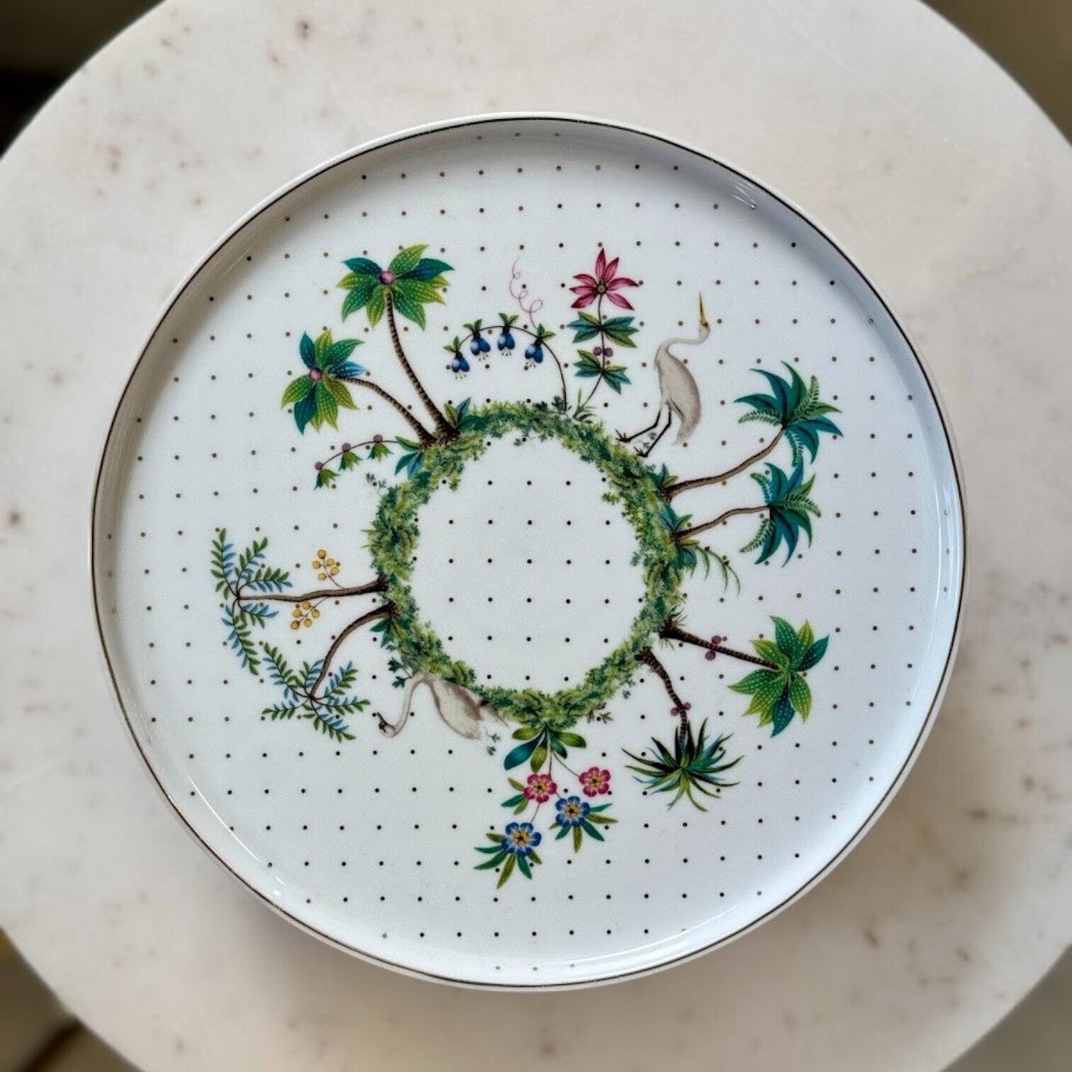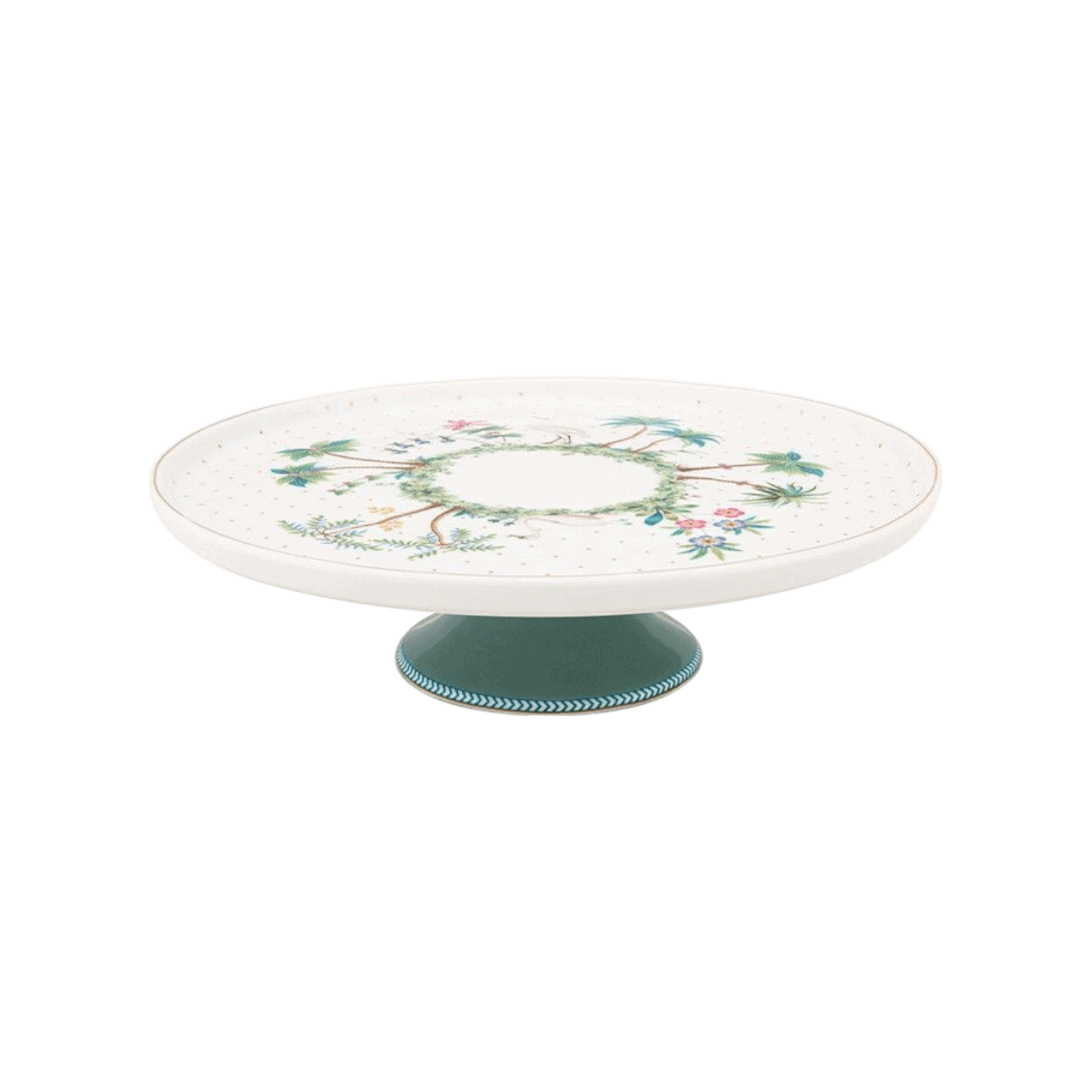 Izceliet gardu kūku vai desertu ar eleganto Jolie Dots Gold kūkas trauku, kas lieliski piemērots tējas pēcpusdienai draugu lokā. Trauka pamatne izceļas ar skaistu zilu krāsu, piešķirot tam izsmalcinātu un modernu akcentu. Savukārt pašas šķīvja virsma ir rotāta baltā fonā ar zeltītiem punktiņiem, papildināta ar eksotiskiem augiem, ziediem un greznām palmām centrā. Šis dizains rada tropisku un sapņainu noskaņu, kas liks justies gluži kā uz iemīļotas salas.
