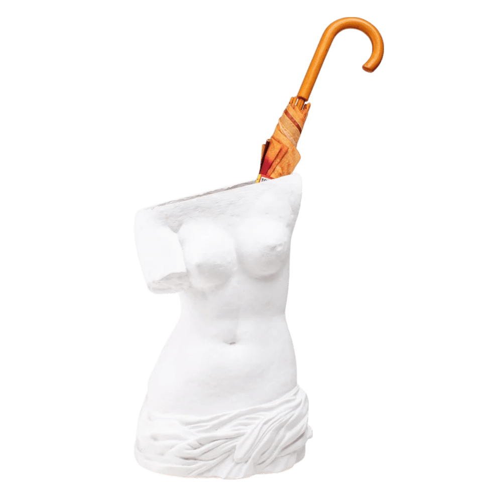 MILO lietussargu turētājs ir patiesi unikāls un neparasts dizaina elements, kas iedvesmots no klasiskām skulptūrām. Tas atgādina antīku marmora torsu, kas eleganti interpretēts modernā un ironiskā stilā, piešķirot Jūsu mājoklim vai birojā neaizmirstamu raksturu.