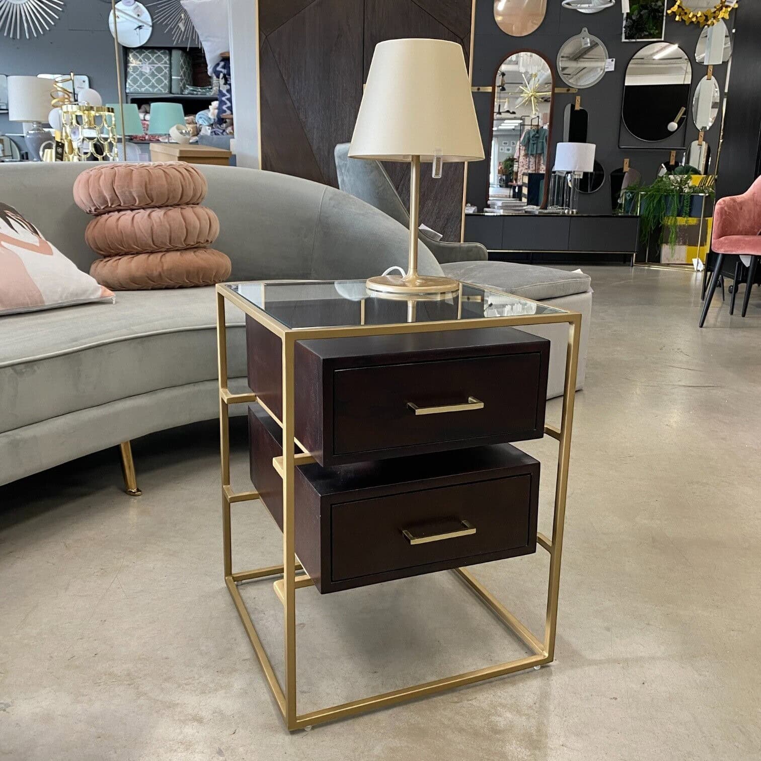 Naktsgaldiņam Lyle ir stabils metāla rāmis, mango koka atvilktnes un rūdīta stikla virsma. Lyle ir skaista un stilīga mēbele, kas ir lieliski piemērota guļamistabai.