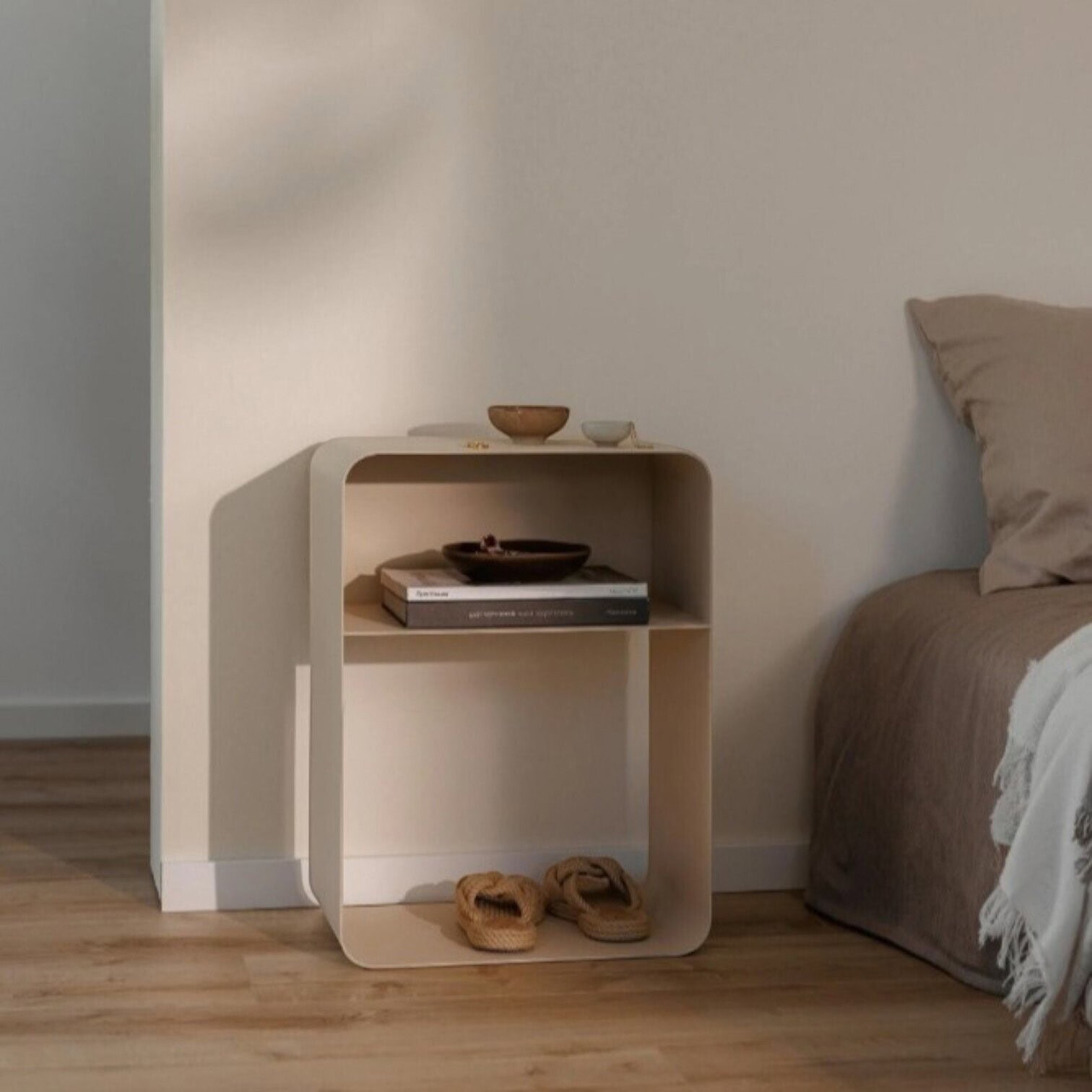 Šis ir moderns un stilīgs naktsskapītis, kas ideāli iederēsies jebkurā guļamistabā. Ar savu vienkāršo, tīro dizainu un gludajām metāla malām, tas piedāvā gan praktiskumu, gan estētiku. Naktsskapīša apakšējā plaukta vieta ir piemērota personīgajiem priekšmetiem, piemēram, grāmatām vai ikdienas lietām, kamēr virsējais plaukts nodrošina vietu dekoratīviem elementiem, piemēram, traukiem vai augiem. Tā minimālistiskais dizains un neuzkrītošā krāsa ļaus viegli saskaņot ar dažādiem interjera stiliem, radot mierīgu un relaksējošu atmosfēru jūsu guļamistabā.