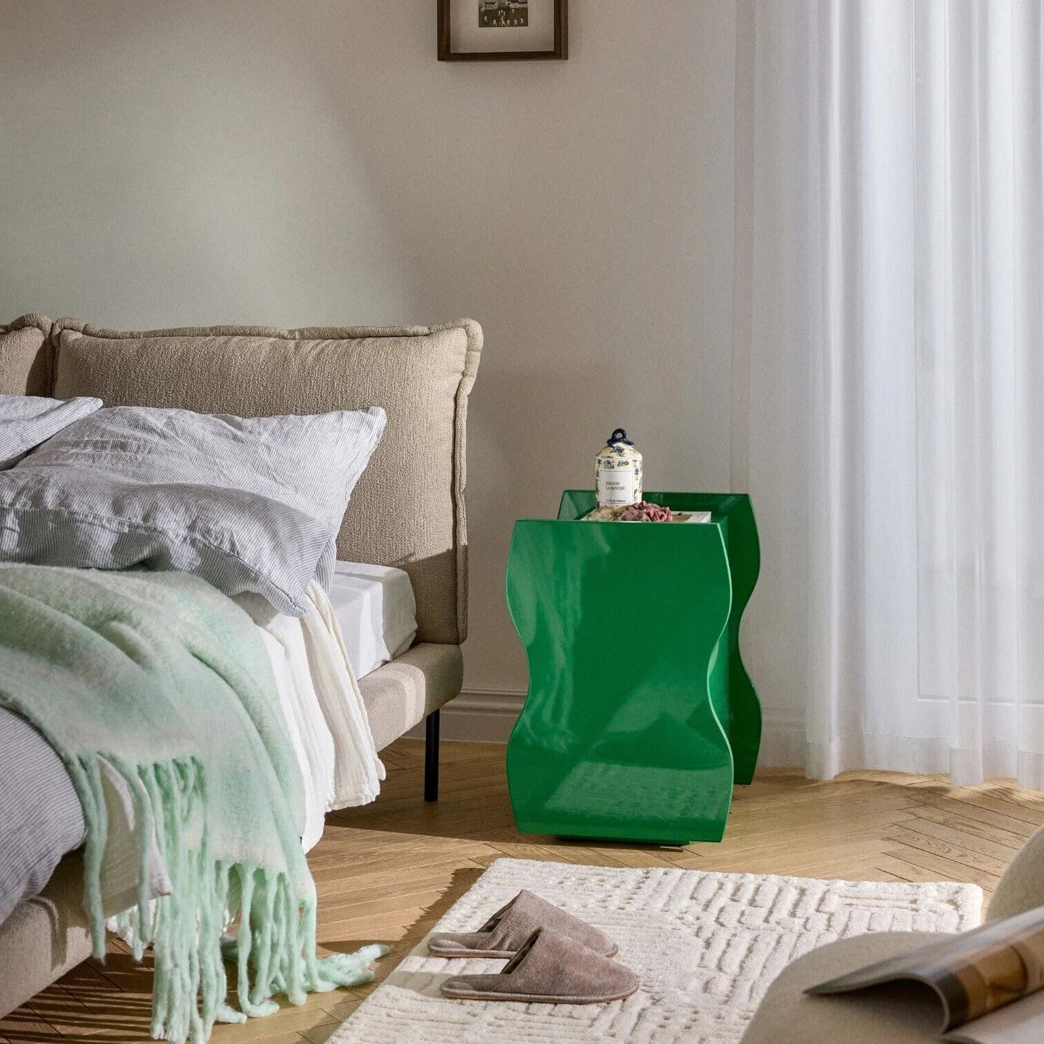 EMINA naktskapītis ir drosmīgs interjera akcents, kas piesaista uzmanību ar savu unikālo, viļņoto formu un spīdīgo apdari. Tā skulpturālais siluets piešķir telpai dinamiku un mūsdienīgu noskaņu, padarot to par ne tikai praktisku, bet arī dekoratīvu elementu jūsu guļamistabā.