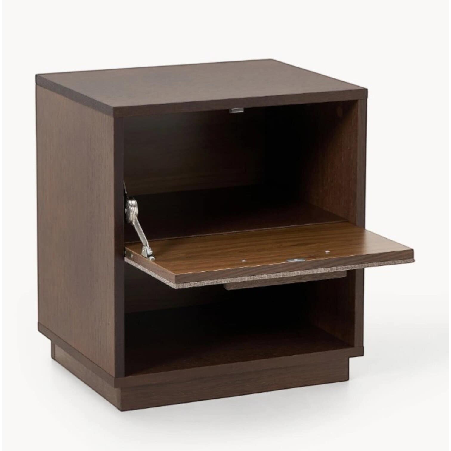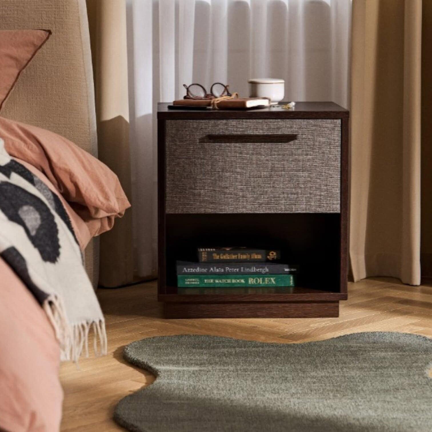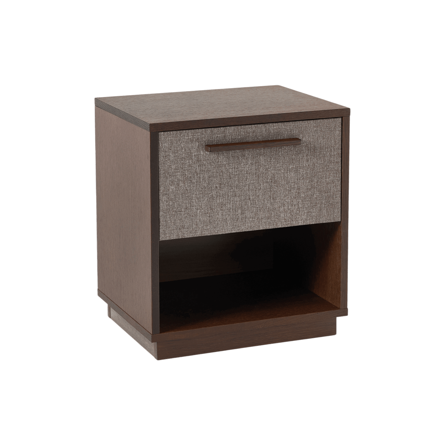 Elegants un praktisks naktsskapītis, kas lieliski papildinās gan modernu, gan klasisku guļamistabas interjeru. Tumši brūnais korpuss kombinācijā ar taupe krāsas tekstila fasādi piešķir mēbelei siltu un izsmalcinātu izskatu.