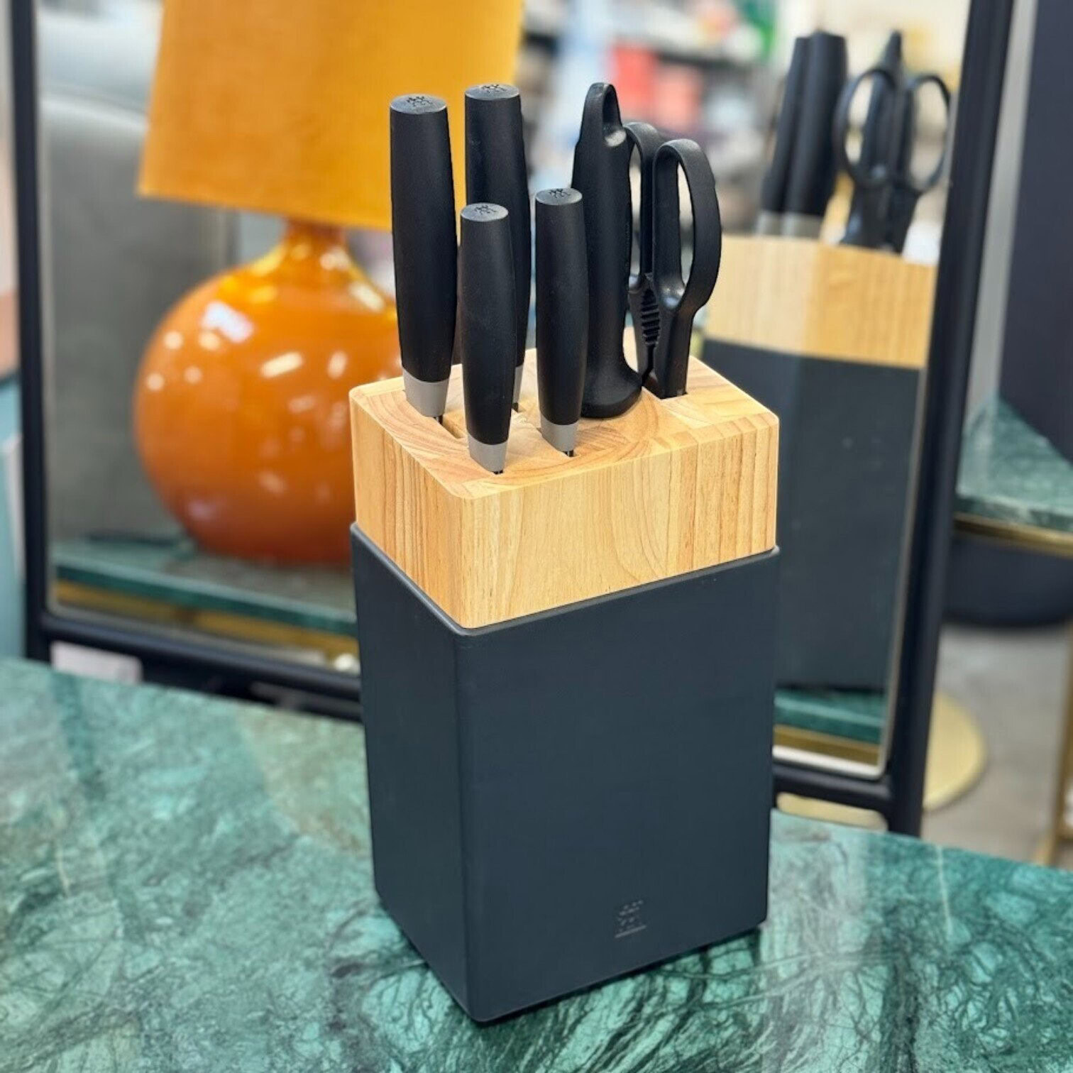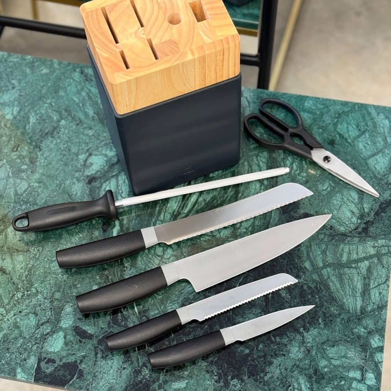 Nažu asmeņi izgatavoti no augstas kvalitātes nerūsējošā tērauda, nodrošinot ilgstošu asumu un izturību. Ergonomiskie rokturi garantē komfortu lietošanā, bet stilīgais statīvs no koka un melna pārklājuma piedāvā ne tikai drošu uzglabāšanu, bet arī elegantu akcentu Tavas virtuves interjerā.