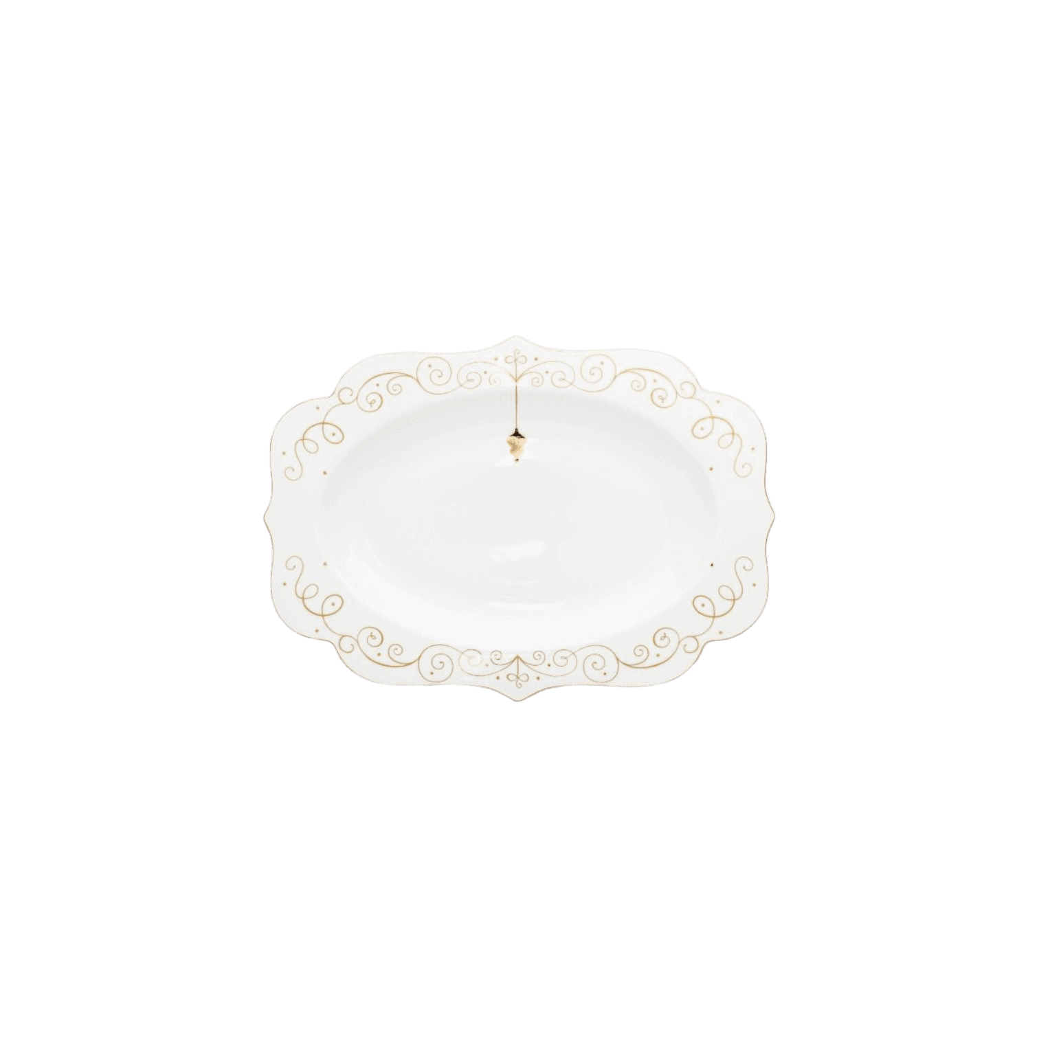 Pasniedziet savus svētku ēdienus skaisti ar eleganto ovālo servēšanas trauku no Royal Winter White kolekcijas. Servēšanas trauks ir dekorēts ar zeltainām līnijām un zvaigznēm, un tā augšdaļā atrodas maģiska zelta Ziemassvētku bumba