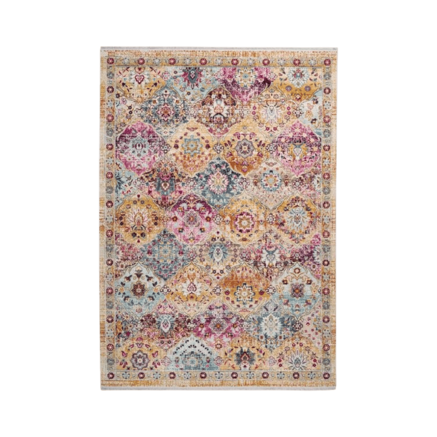 Pievienojiet savai mājvietai krāšņuma un siltuma pieskārienu ar šo iespaidīgo KAYOOM paklāju. Šis paklājs izceļas ar austrumnieciska stila rakstiem, bagātīgu krāsu paleti un smalkām detaļām. Dominējošās krāsas – sarkana, zelta, zilgana un rozā – veido dinamisku, tomēr harmonisku kompozīciju, kas piešķirs interjeram dzīvīgumu un raksturu.