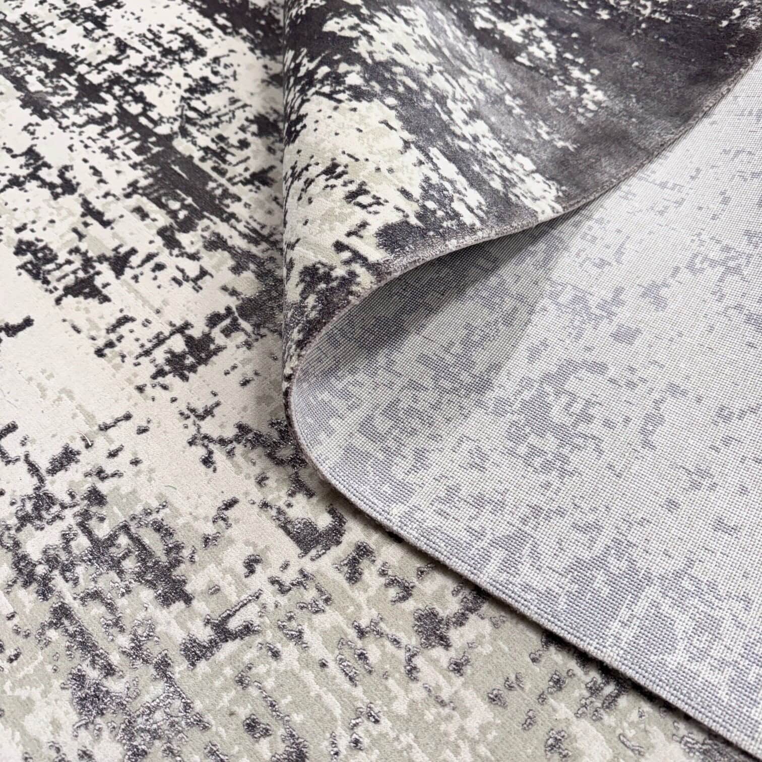 Stilīgs un mūsdienīgs paklājs ar abstraktu rakstu pelēkos un gaišos toņos, kas lieliski papildinās gan modernu, gan klasisku interjeru. Virsma ir patīkama pieskārienam, ar vieglu spīdumu, kas piešķir telpai eleganci un dziļumu.
