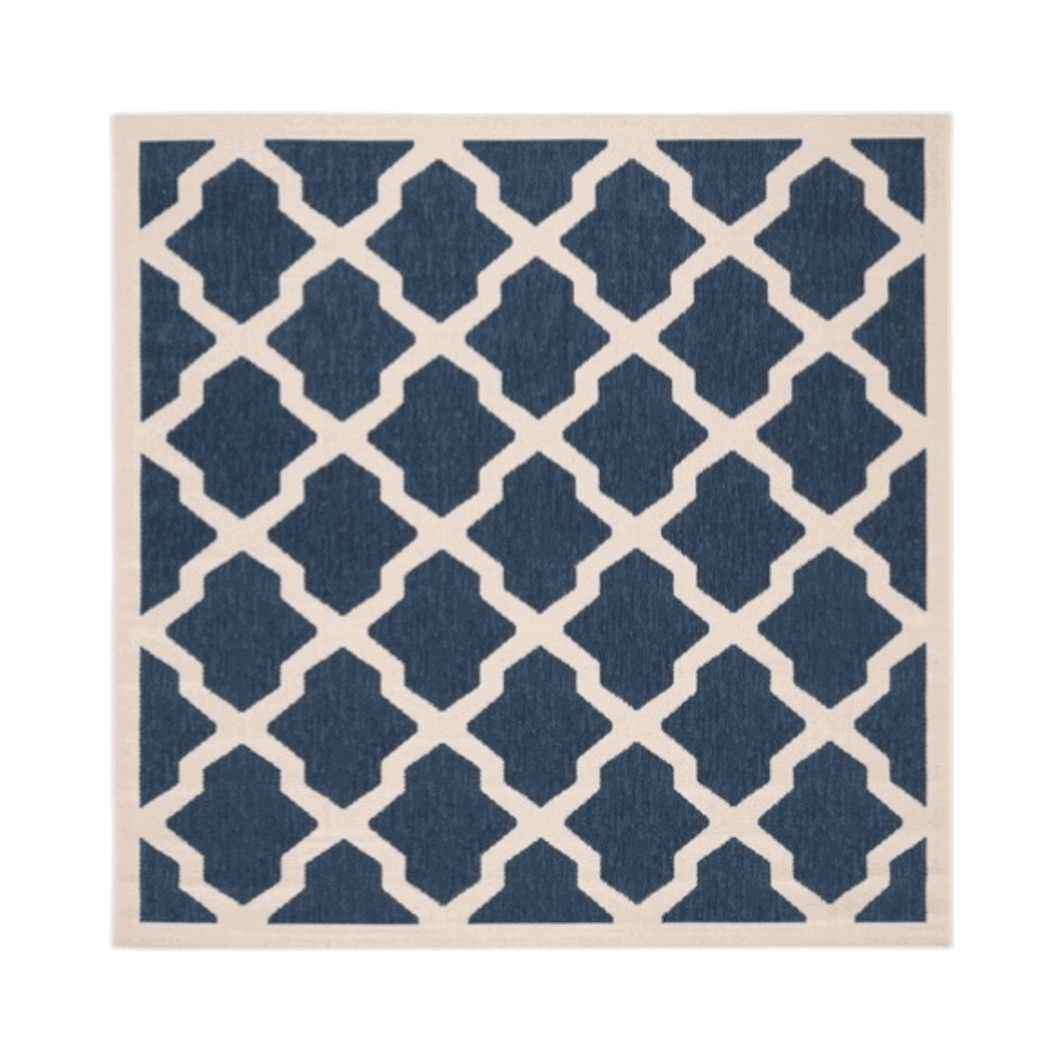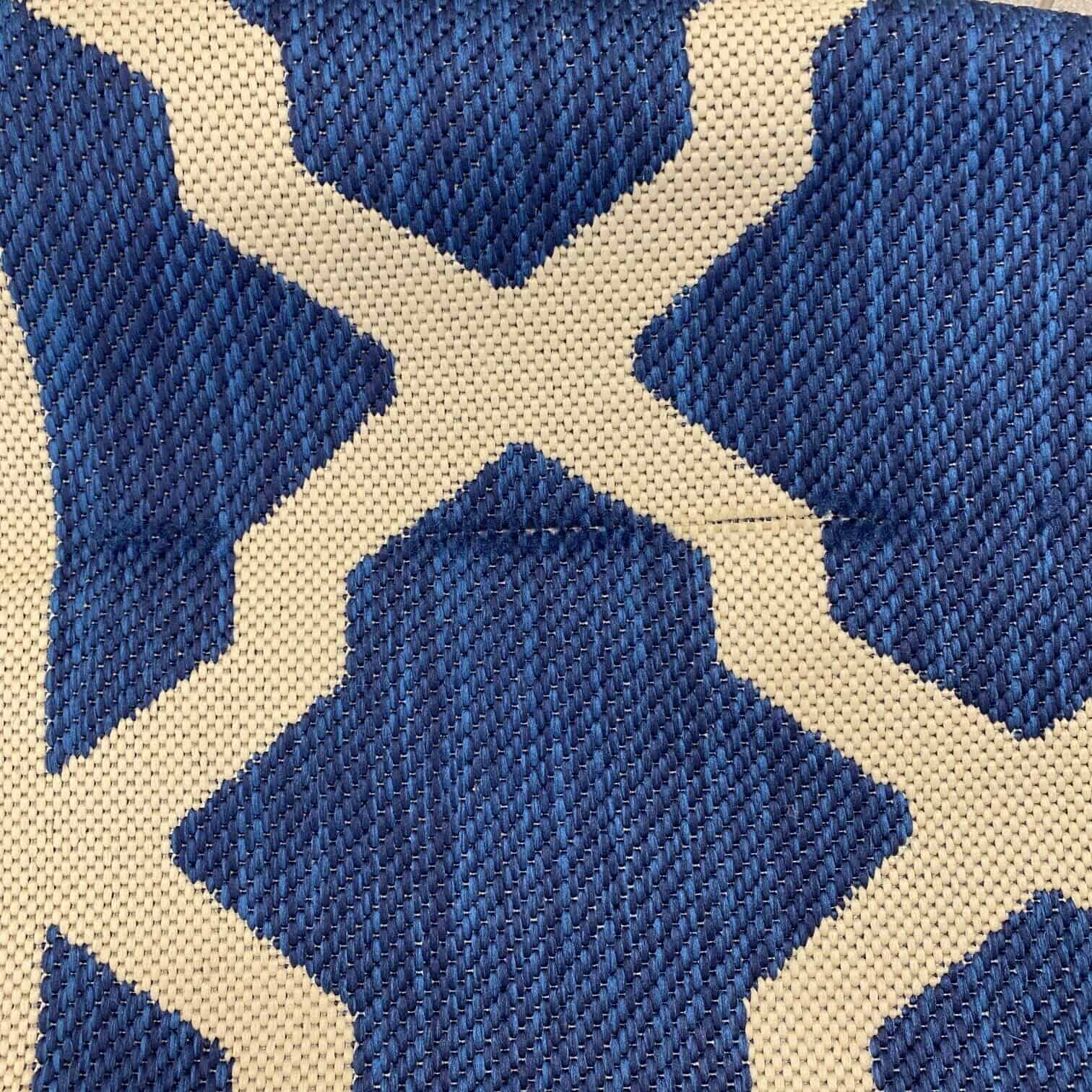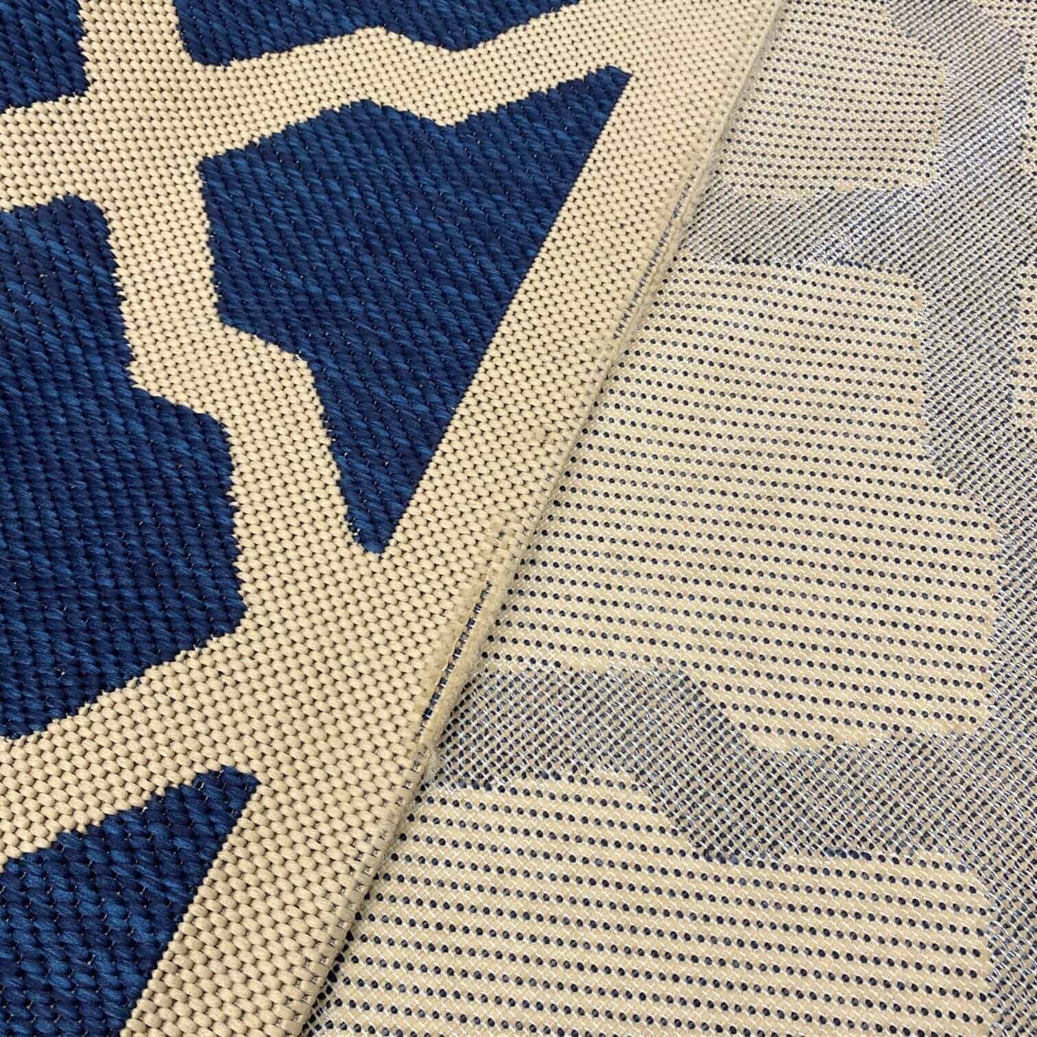 Papildini savu telpu ar modernu un praktisku paklāju elegantā tumši zilā (navy) un bēšā krāsu kombinācijā. Tā ģeometriskais raksts piešķir interjeram dinamiku un mūsdienīgu akcentu, lieliski iederoties gan iekštelpās, gan ārā- uz terases, balkona vai dārzā.